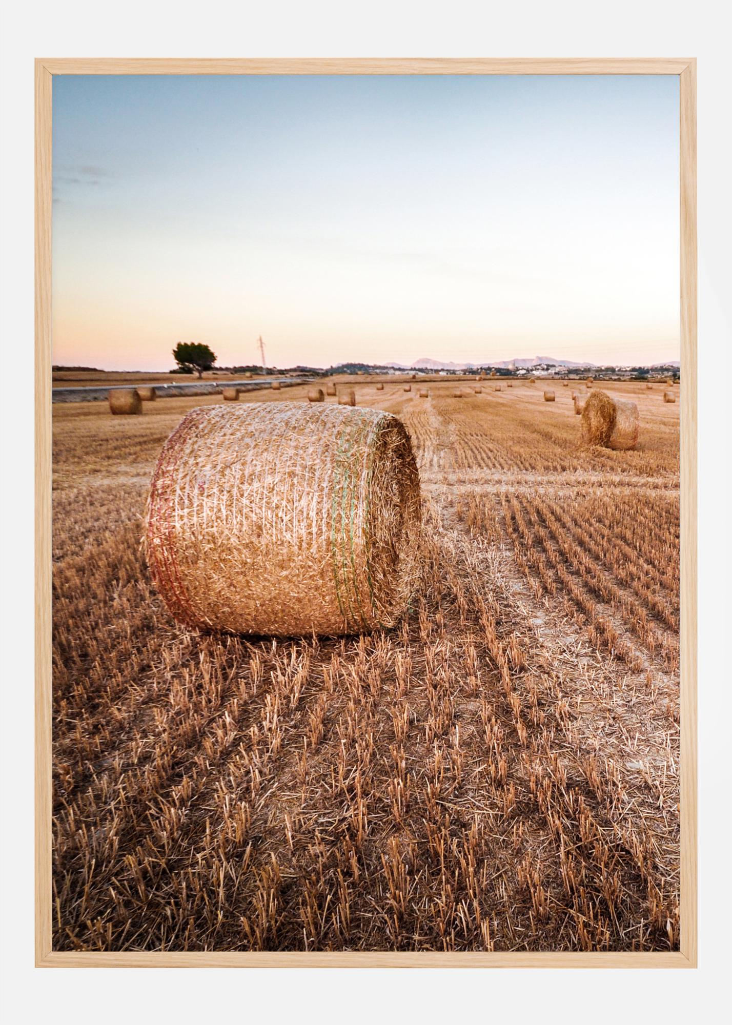 Jednoduchý, ale krásny prírodný plagát. Kopa sena v popredí je pekne zvinutá, zatiaľ čo v diaľke sú ďalšie zvinuté kopy sena roztrúsené po poliach. Svetlomodrá obloha a teplé hnedé farby vytvárajú teplý a relaxačný obraz, ktorý možno zavesiť v vidieckej kuchyni.