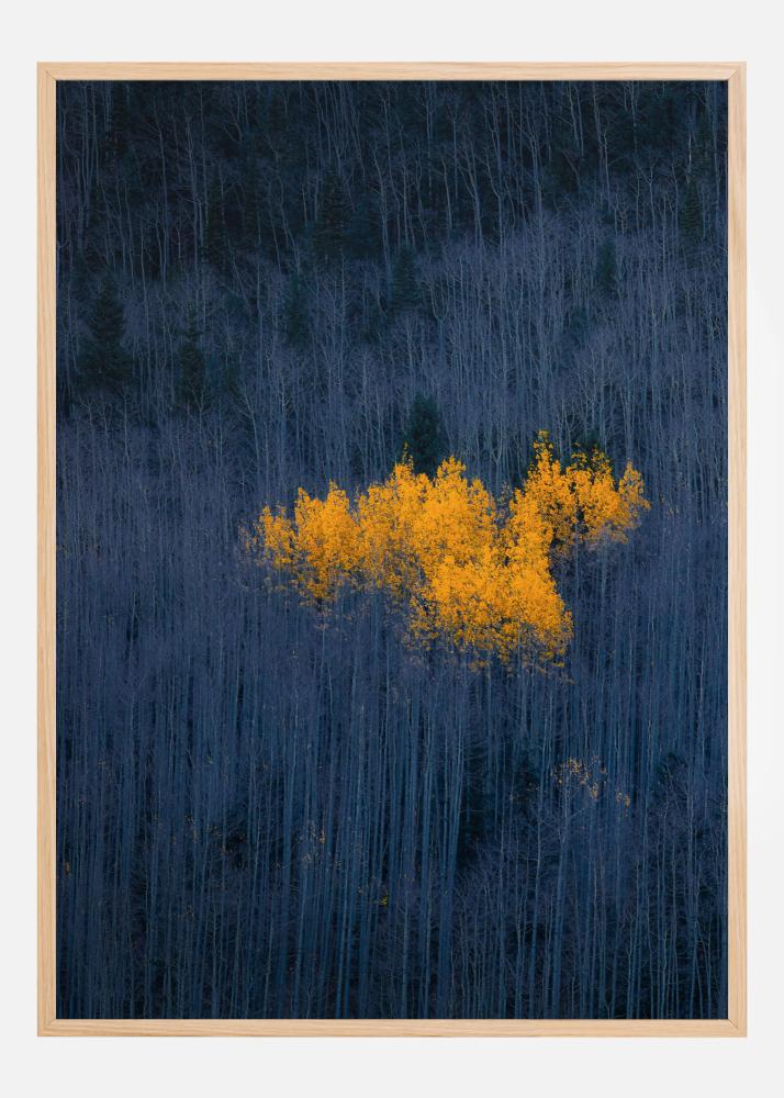 Úžasný plagát, ktorý zobrazuje tmavozelený a polnočný modrý les. Uprostred tlače sú korunty stromov zvýraznené žltou farbou, čo tlači dodáva trochu farby. Krásna tlač na zavesenie v obývacej izbe na vytvorenie relaxačnej atmosféry.