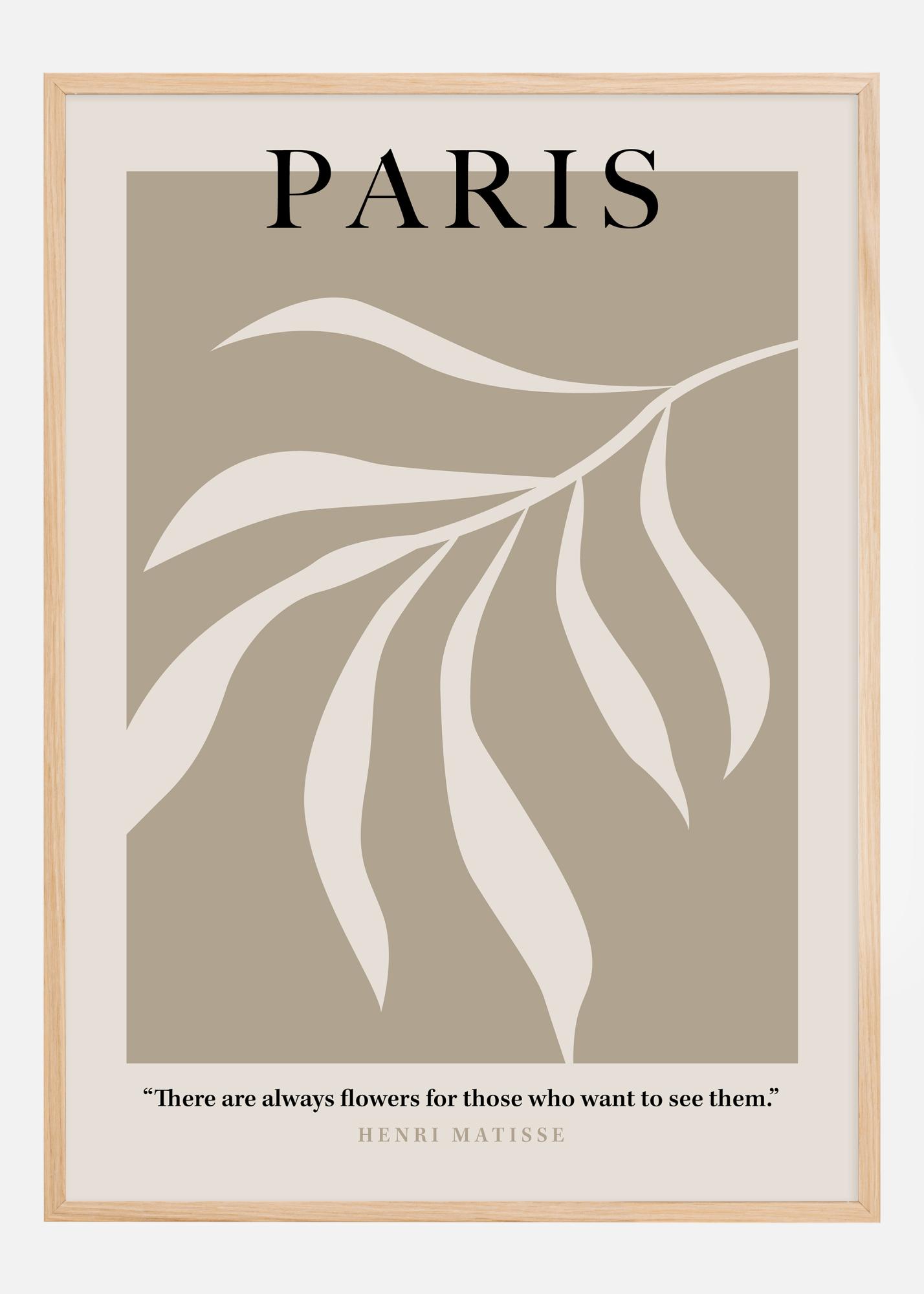 Tento elegantný a štýlový plagát vzdáva hold Parížu, mestu, ktoré inšpirovalo tak mnoho umelcov a básnikov. Jeho jednoduchý, ale silný dizajn pozostáva z bielych línií, ktoré tvoria abstraktnu flóru na jednotnej béžovej pozadí. Text "PARIS" je úhľadne umiestnený navrchu, čo vytvára priamu asociáciu s triedou a nadčasovosťou mesta. Na spodku je citát Henricha Matissa: "Vždy sú tu kvety pre tých, ktorí ich chcú vidieť.", čo pridáva vrstvu hĺbky a zamyslenia do tohto už aj tak významného plagátu.