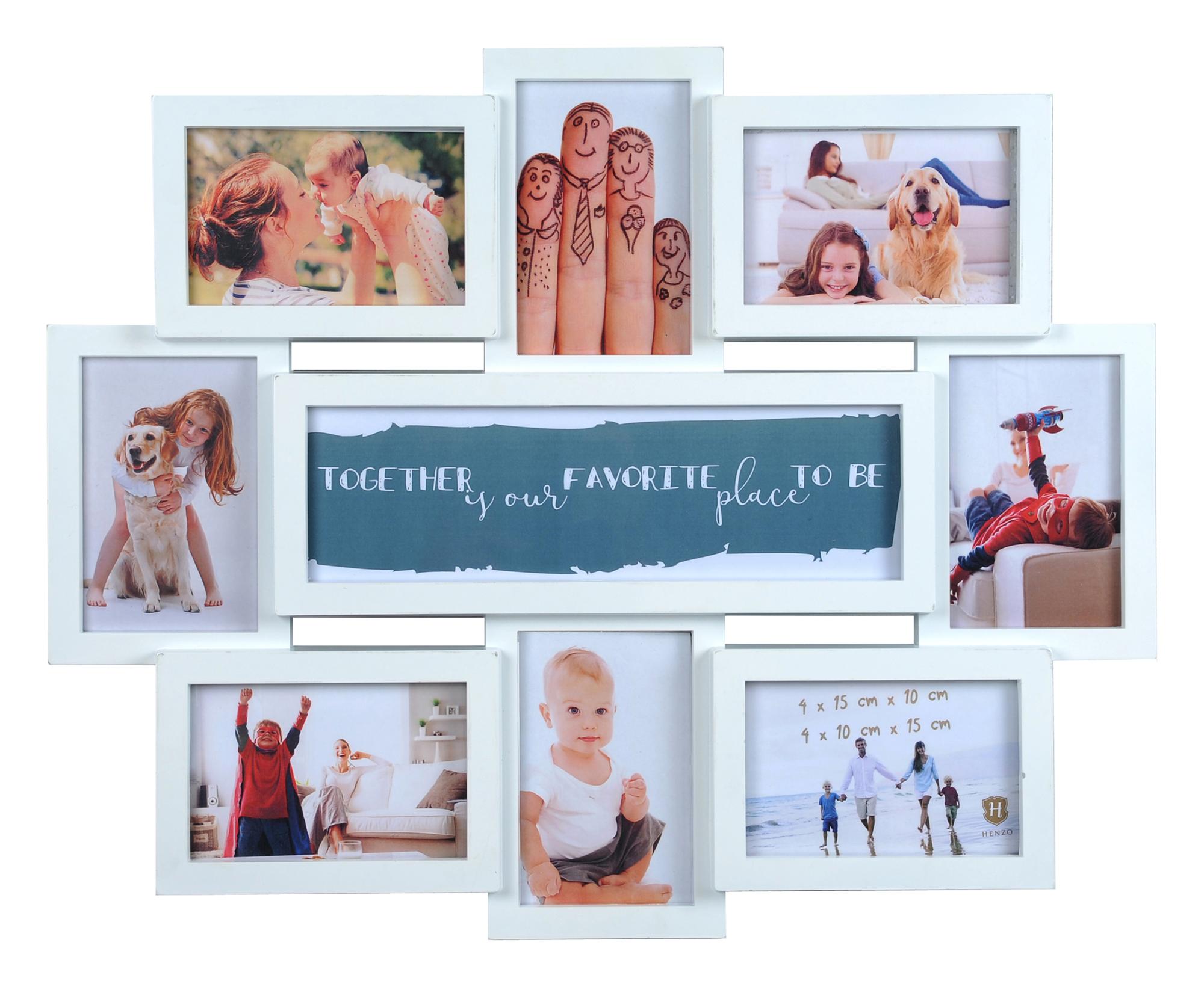 Zbierajte svoje najkrajšie fotografie v štýlovom kolážovom ráme! Tento rám nie je len príjemný na pohľad, ale dá sa navyše aj prepracovať! K dispozícii máte 5 roztomilých textov s rôznymi témami, ktoré vložíte do stredu (9. rám) a vymeníte ich, keď budete chcieť. Napríklad môžete vložiť texty ako "Všetko, čo potrebuješ, je láska" alebo "Povedz áno rodine". Kolážový rám je dostupný v čiernej a bielej farbe.