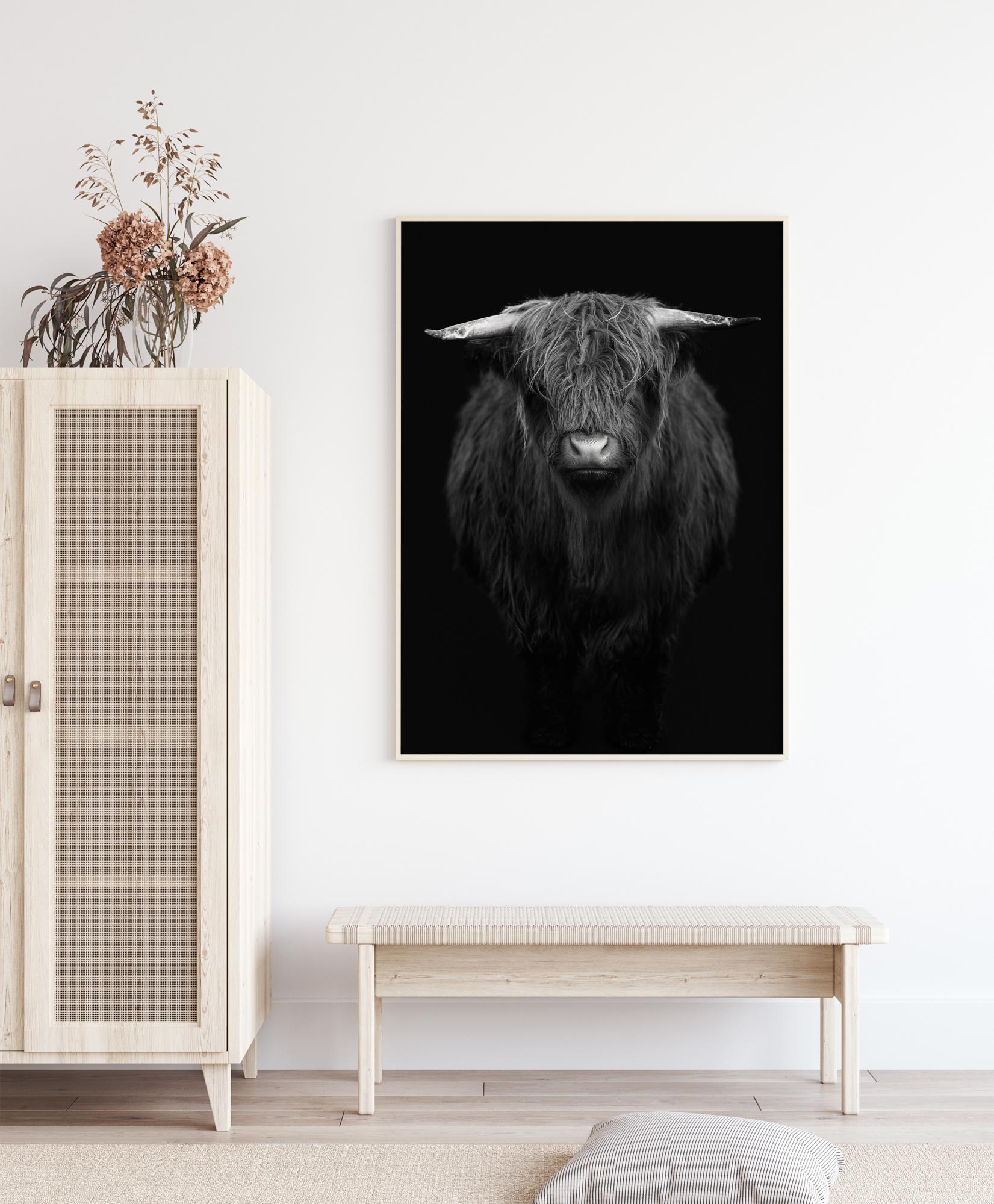 Pôsobivá čierna vysočinská krava proti čiernemu pozadiu. Táto krásna bytosť sa pozerá priamo do kamery a ukazuje svoju dlhú čiernu vlnitú srsť. Aj keď je tento plagát obraz čierne na čiernom, konské biele rohy a nos jasne vystupujú. Obdivujte krásu tejto bytosti, keď hľadí priamo do kamery.