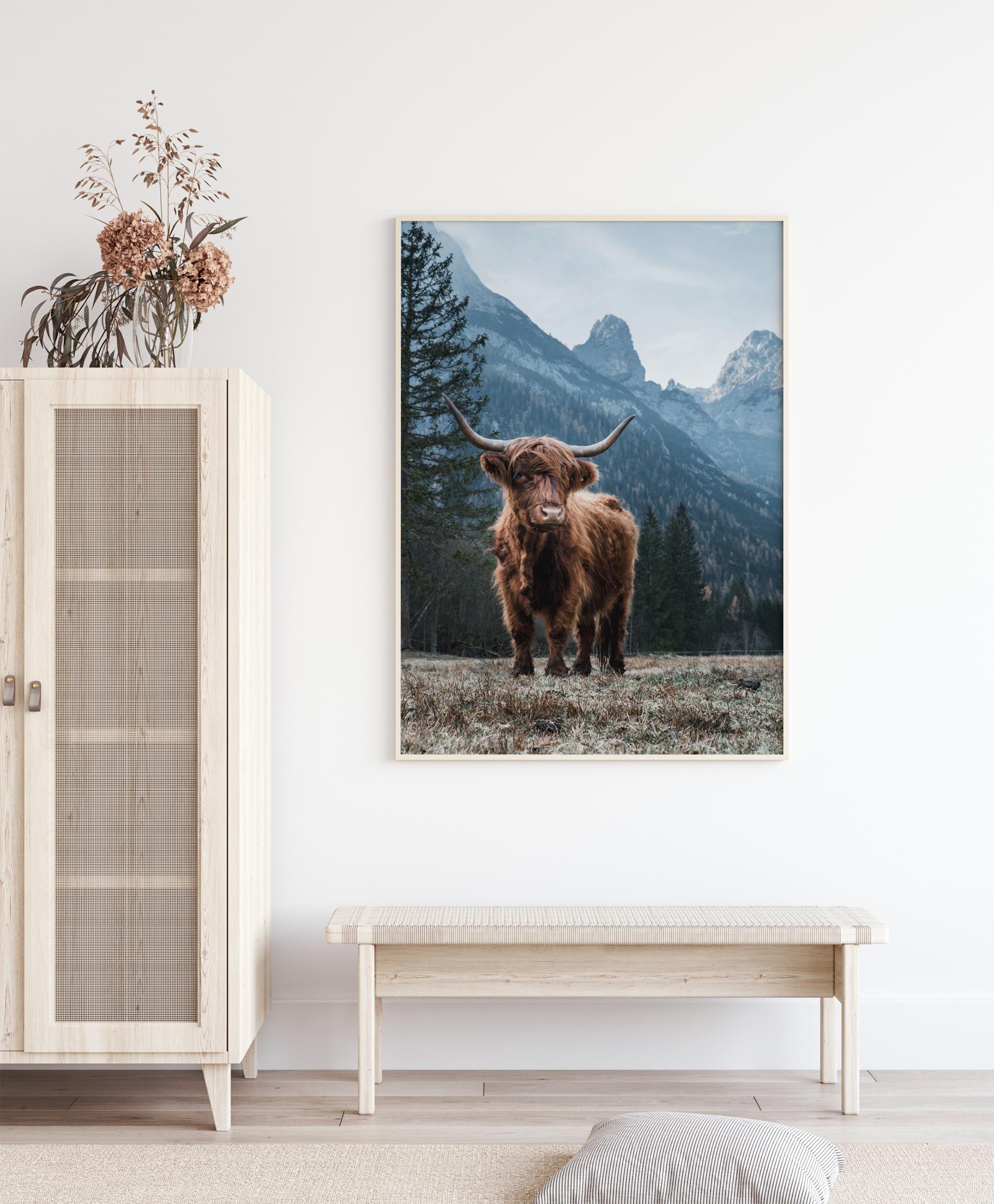 Divoký plagát gaštanového vysočianskeho dobytka, ktorý stojí sám na poli. Strmé hory pokryté snehom rámujú tohto krásneho zvieraťa. So svojou krátkou, chlpatou srsťou, ktorá znesie drsné podmienky, sa zdá, že zviera nič neobťažuje. Použite svoju predstavivosť a predstavte si, že sa nachádzate na škótskych vresoviskách.