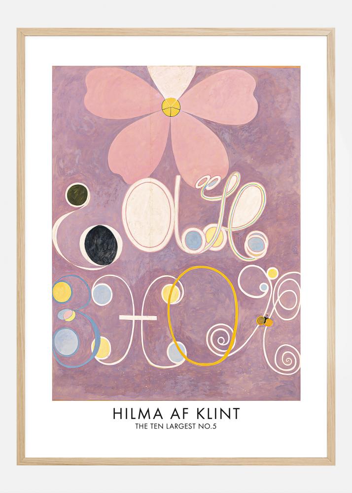 Táto poster predstavuje 'The Ten Largest No.5', časť z impozantnej série Hilmy af Klint, ktorá skúma rôzne fázy života pomocou abstraktných a symbolických tvarov. Jemné pastelové odtiene ružovej a krémovo-bielej vytvárajú centrálny kvet, ktorý sa stáva srdcom tohto diela, obklopený hravými špirálami a geometrickými tvarmi v odtieňoch žltej, modrej a čiernej na fialovom pozadí. Táto tlačená kópia je poctou revolučnému prístupu af Klint a rozžiari každú miestnosť svojou pokojnú a vyváženú energiou.