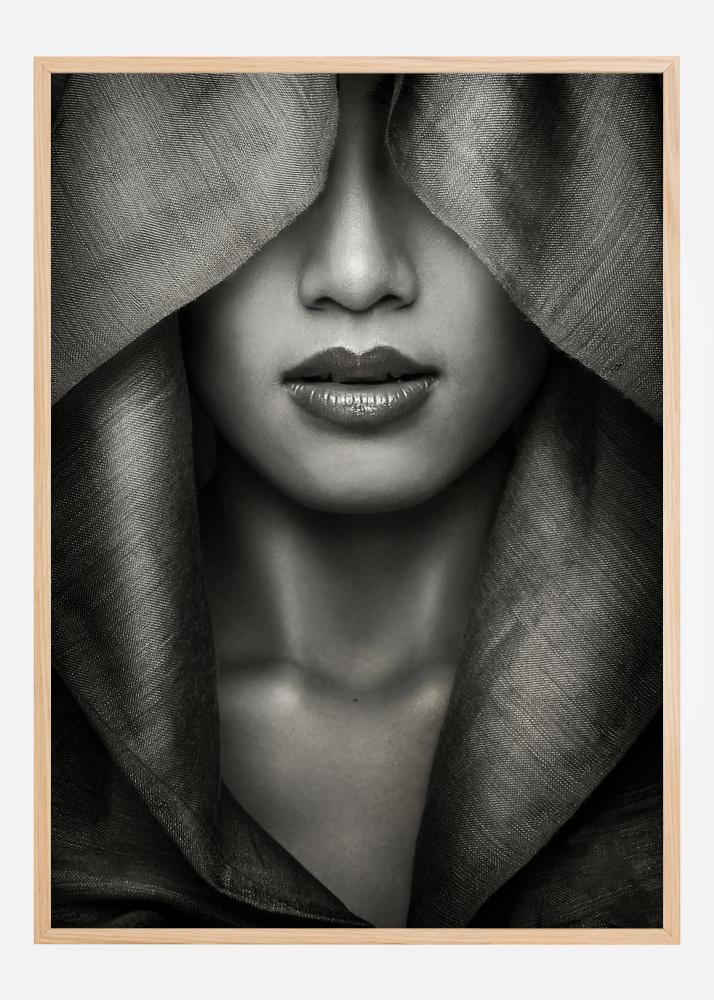 Obraz zobrazuje silný a pútavý detailný záber na osobu zabalenú v tkanine, so zameraním na zvýraznené pery a silnú čeľusťovú líniu. Detailné textúrovanie tkaniny a jemné tiene na pokožke pridávajú hĺbku a komplexnosť, ktorá vtiahne diváka do motívu. Monochromatická paleta zvýrazňuje každý detail a vytvára nadčasový pocit.