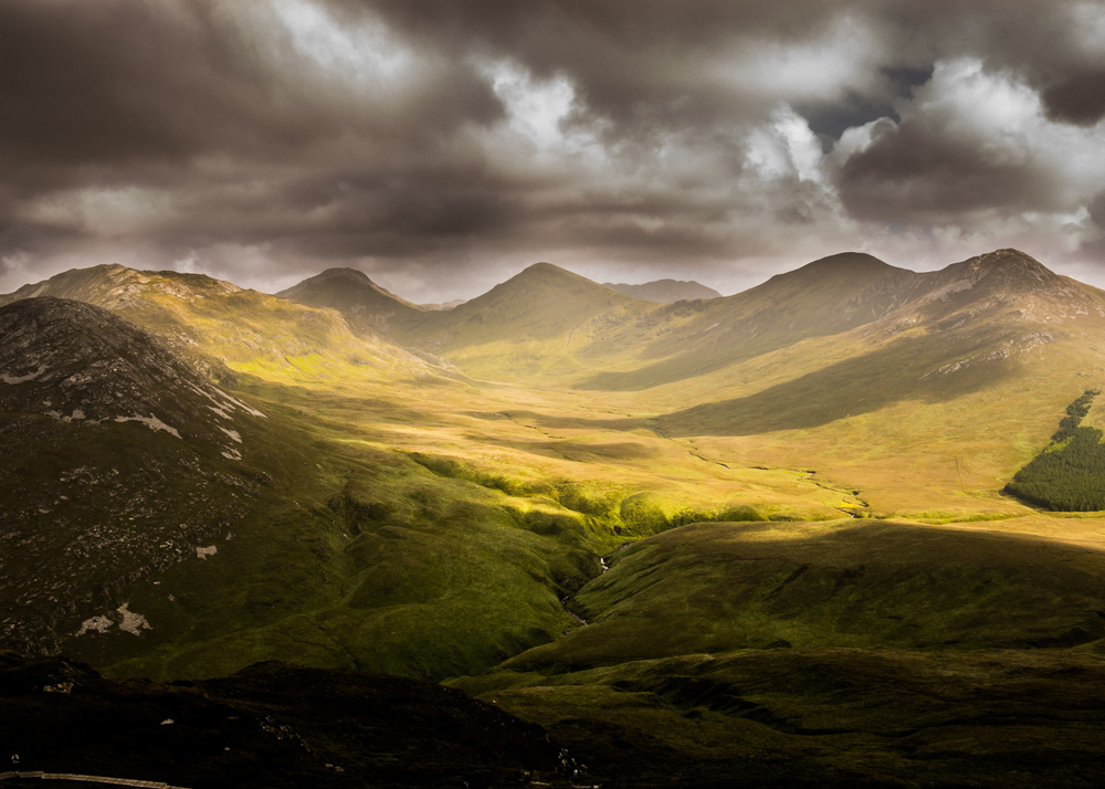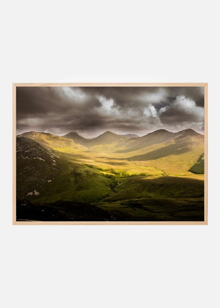 Dramatický krajinný portrét s búrkovými mrakmi vystupujúcimi nad pohorím, zatiaľ čo slnko osvetľuje údolie nižšie. Tlmené tlmené farby podčiarkujú dramatickosť obrazu a spôsobujú, že fotografia skutočne vynikne. Najlepšie sa hodí do rámu, ktorý zvýrazní hĺbku v obraze a neodvádza pozornosť od témy.