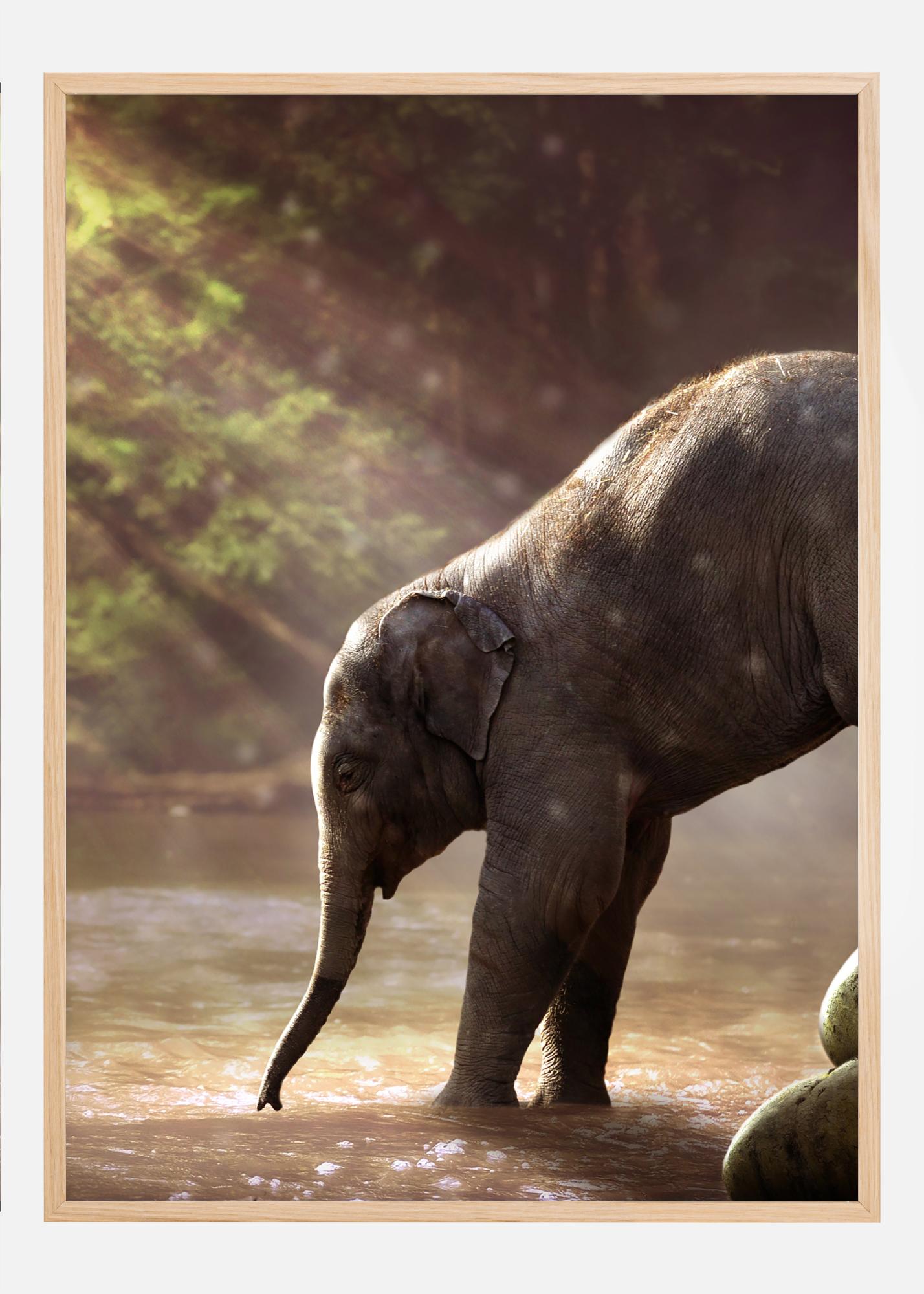 Roztomilá fotografia sloníčaťa, ktoré je povzbudzované svojou mamou, aby zišlo dolu do rieky. Denné svetlo presvitá cez stromy a odráža sa na vode, čo vytvára pocit tepla. Sloníča váha, či vstúpiť do vody, ale mama mu jemne pomáha. Tento roztomilý plagát odráža intenzívnu lásku medzi matkou a dieťaťom.