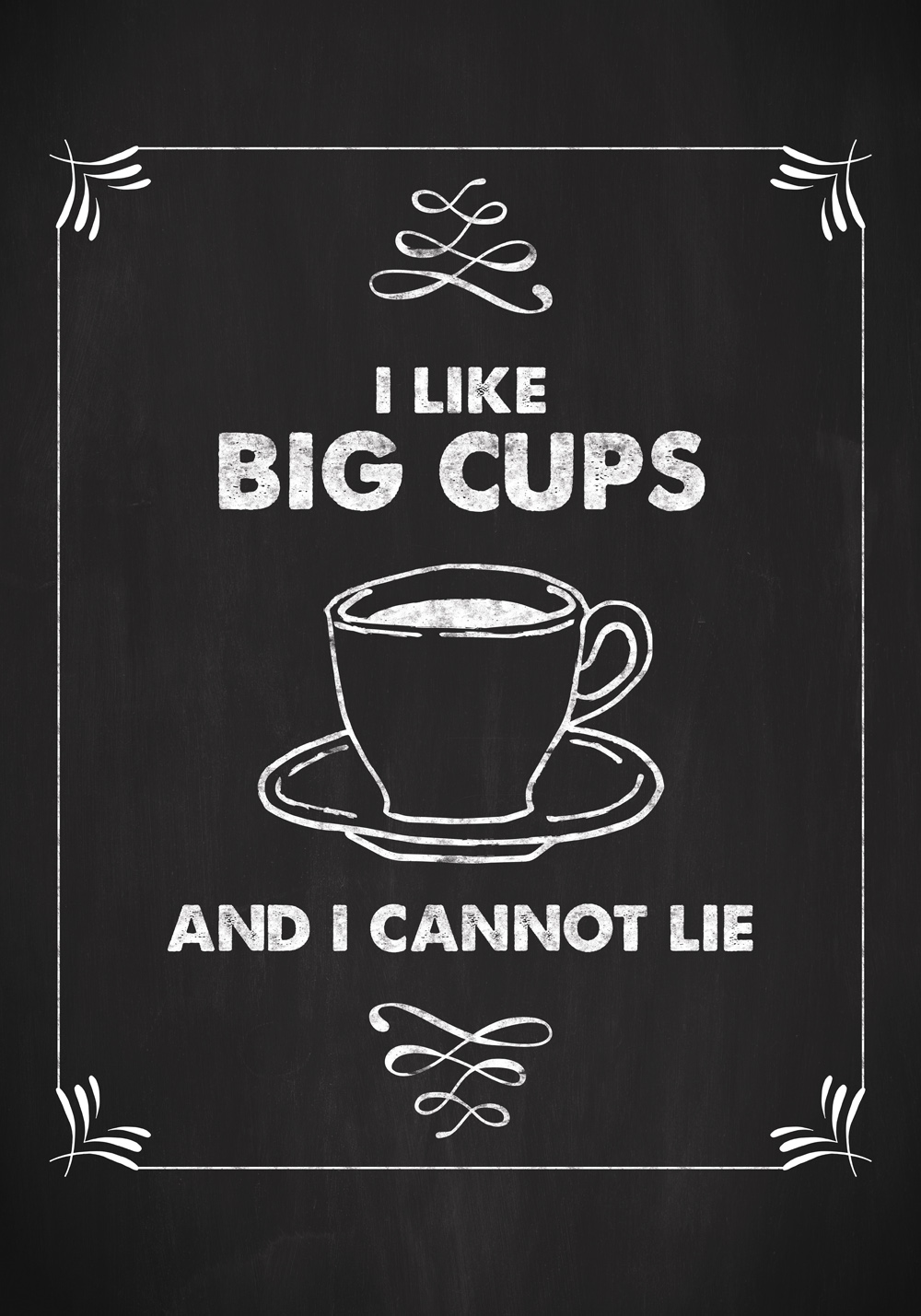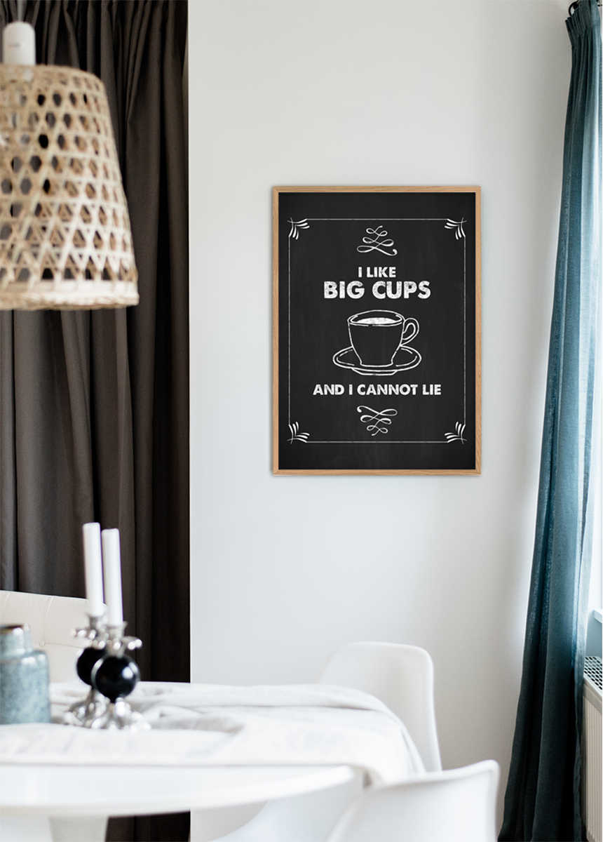 Vtipná potlač s odkazom - I like big cups, and I cannot lie, pre tých, ktorí majú radi veľké šálky kávy alebo čaju. Čiernobiely plagát, s pocitom školského tabule, vyzerá dobre na obrazovej poličke v kuchyni spolu s kuchárskymi knihami a doplnkami na varenie. Alebo prečo nie zavesiť ho spolu s inými grafickými potlačami na obraze stenu s témou z kuchynského sveta. Doplnte plagát jednoduchým čiernym rámom, ktorý umožňuje textu hovoriť a ktorý posilňuje dojem školského tabule.