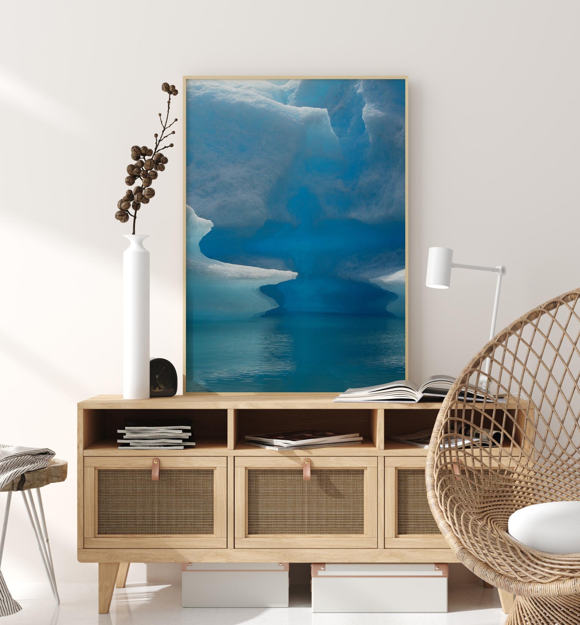 Pokojný plagát s krištáľovo modrým ľadovcom. Ostré, biele, ľadovce sa odrážajú v priezračnom mori. Svetlo modrá obloha sa odráža v hlbokom, studenom mori a vytvára chladnú atmosféru. Rôzne odtiene modrej rozžiaria každú miestnosť.