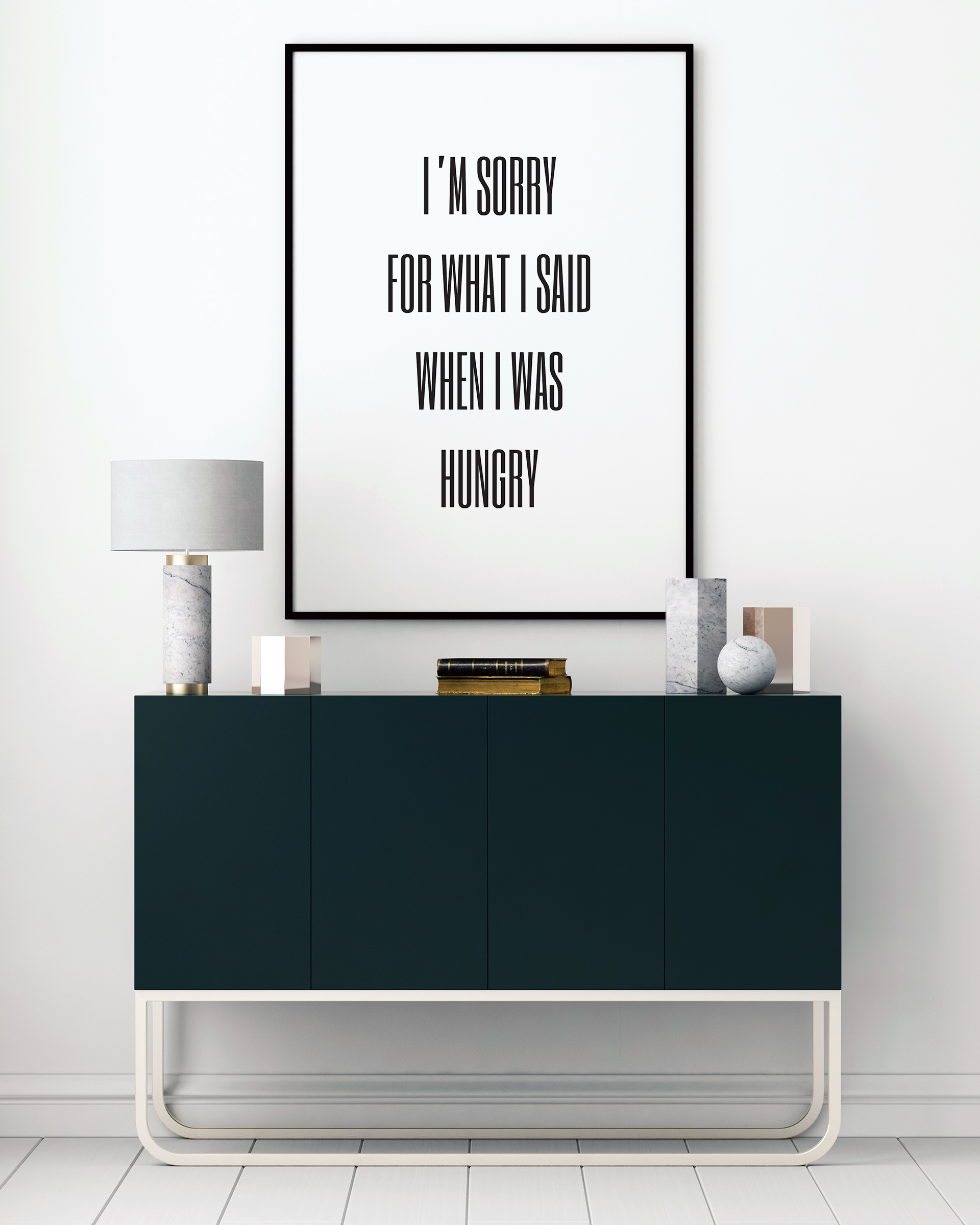 Jednoduchý a elegantný textový plagát s textom "Ospravedlňujem sa za to, čo som povedal, keď som bol hladný" vo veľkých písmenách. Plagát so zábavným odkazom, ideálny do kuchyne ako malé predospravedlnenie, ak sa jedlo trochu omešká.