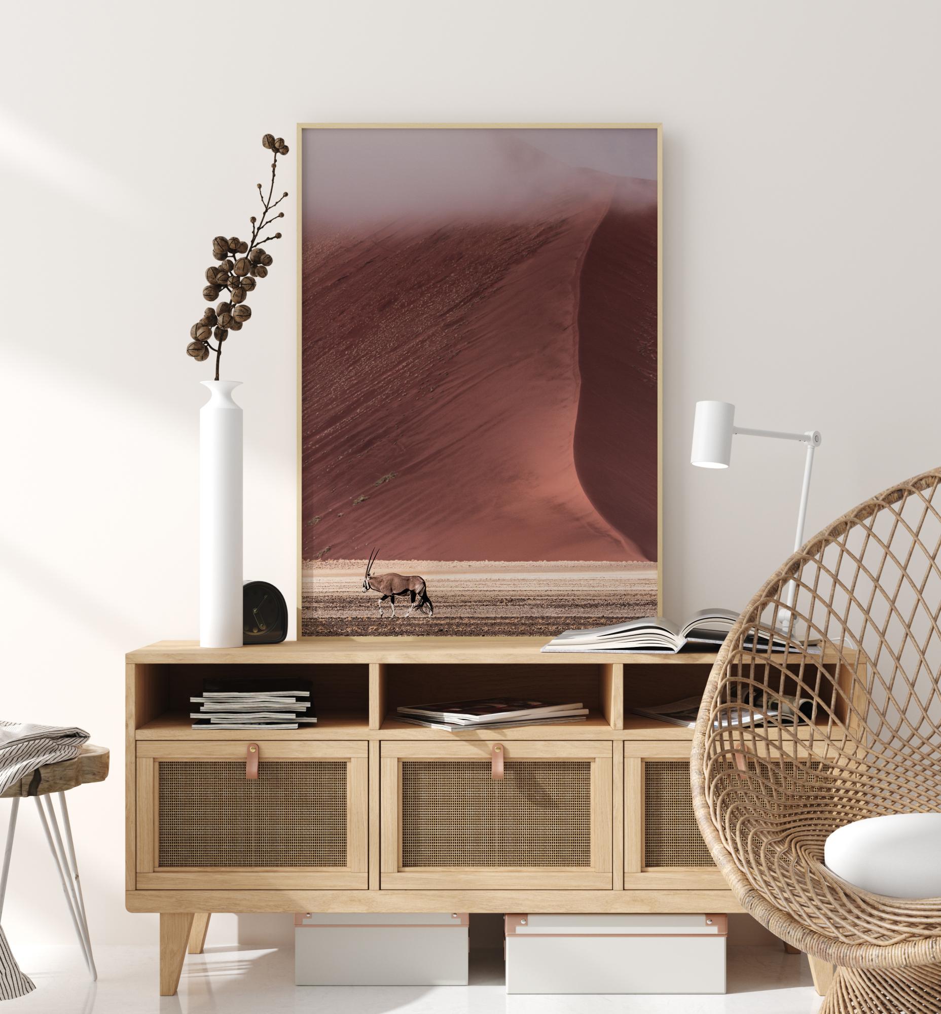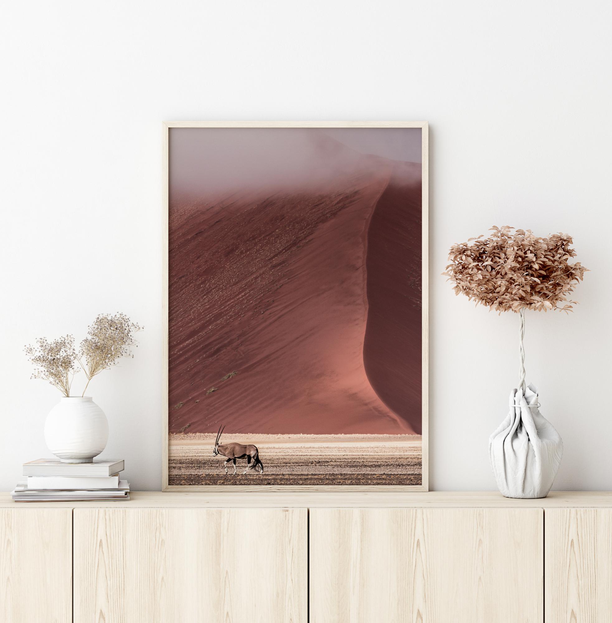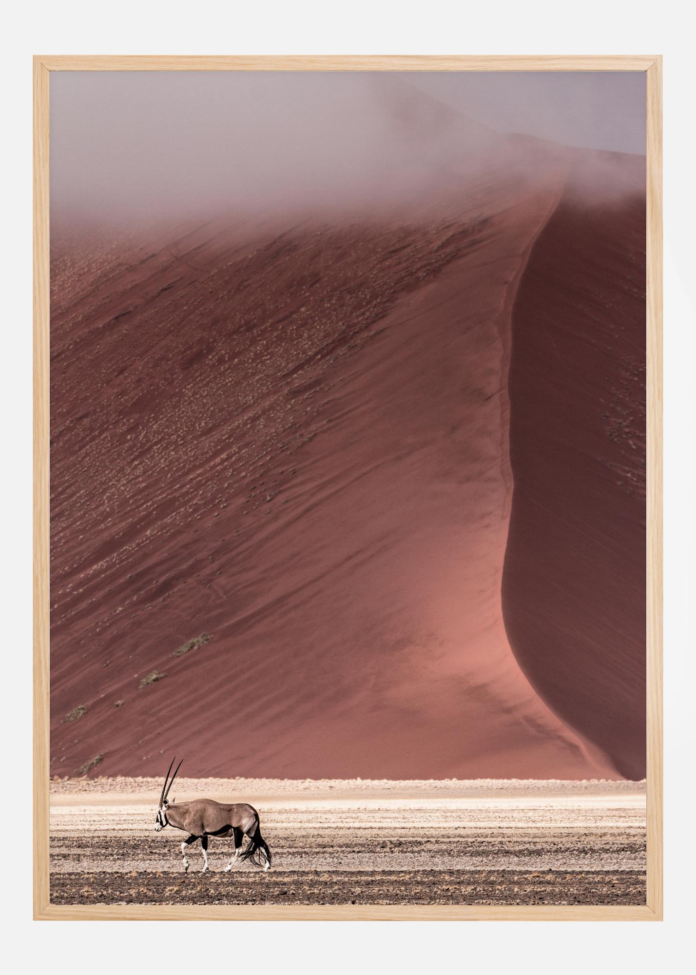 Jednoduchý plagát unavenej gazely, ktorá prechádza púšťou. V pozadí sa impozantná červená piesočná duna stretáva s piesočnatou zemou v dolnej časti obrazu. Krásne farby miznú v púštnej hmle. Na krémovom pozadí vytvárajú tieto upokojujúce farby krásnu scenériu prírody.