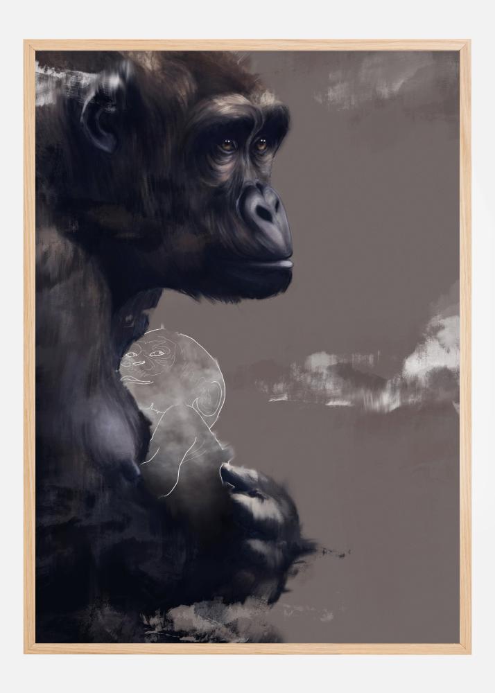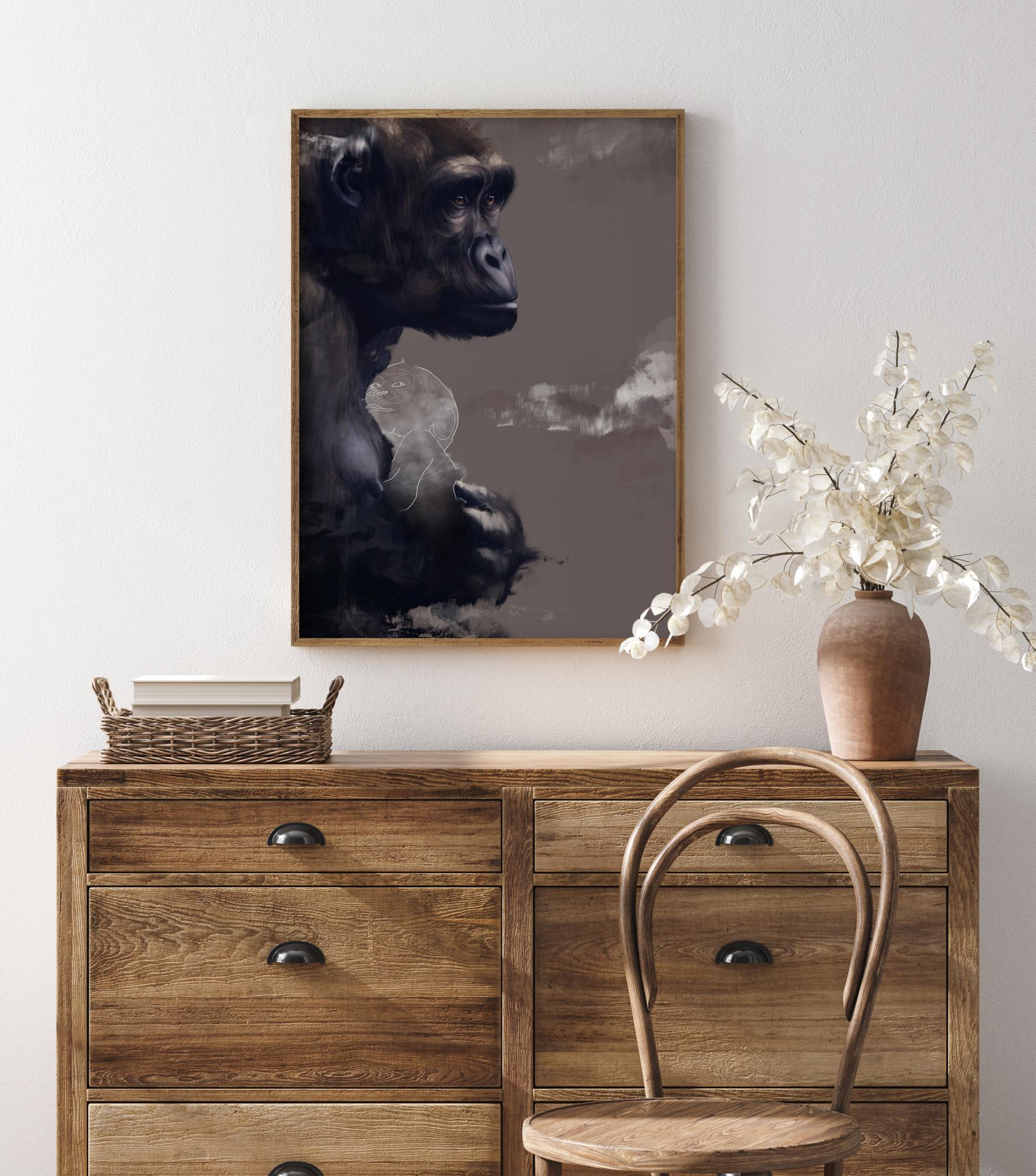 Pútavý prírodný plagát s gorilou, ktorá drží svoje novorodené dieťa. Na svetlohnedom pozadí prejavuje tento mohutný primát silný, ale pritom jemný materinský inštinkt. Tento obraz gorily, ktorá chráni novorodené dieťa vo svojich láskyplných rukách, je perfektnou potlačou pre všetkých milovníkov zvierat.