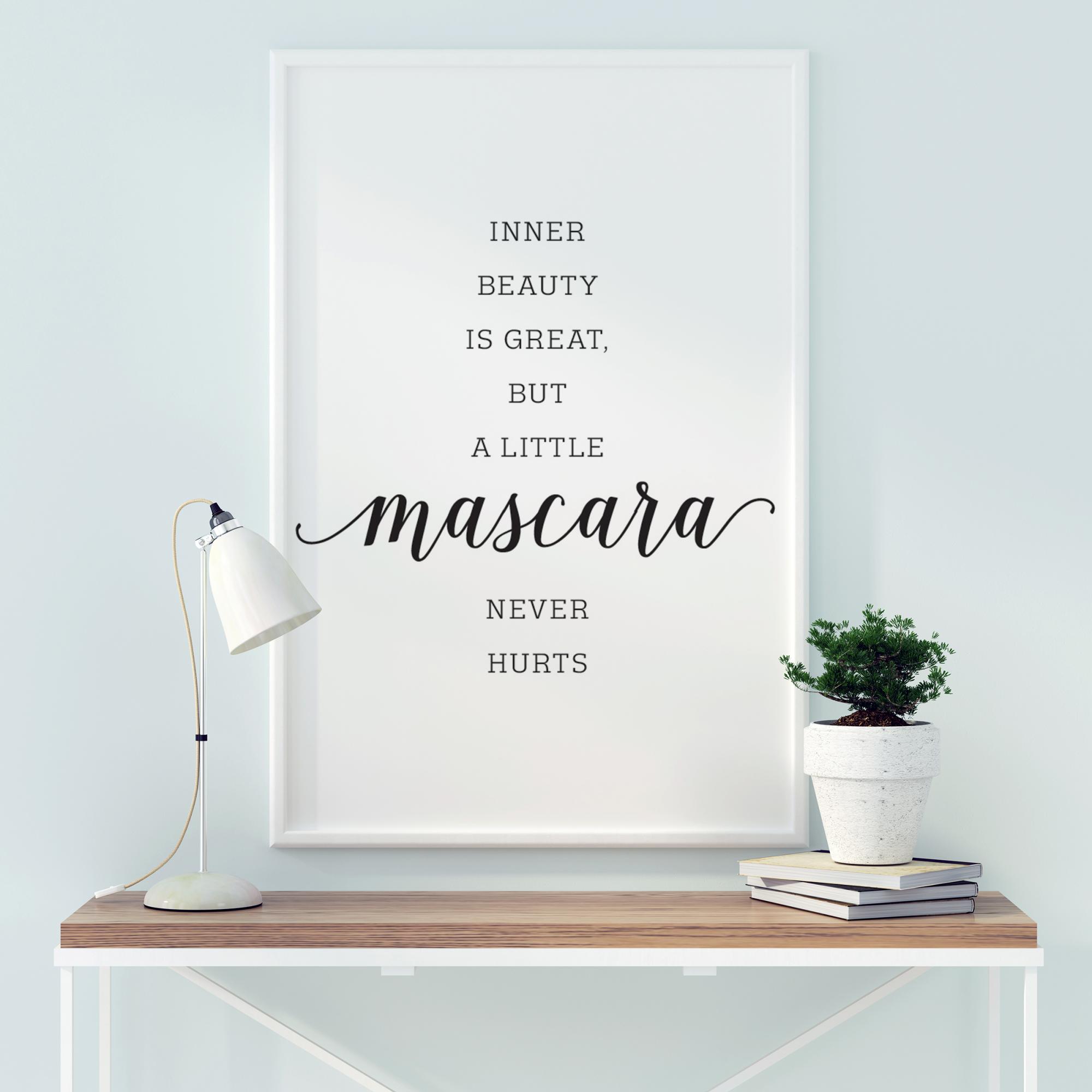Motivačný plagát, ktorý prináša posolstvo pre všetkých, ktorí radi vyzerajú dobre. Vnútorná krása je skvelá, ale trocha maskary nikdy nezaškodí. Posolstvo, ktoré treba nasledovať pre ten extra špeciálny vzhľad. Krásna tlač na zavesenie vedľa vášho toaletného stolíka.