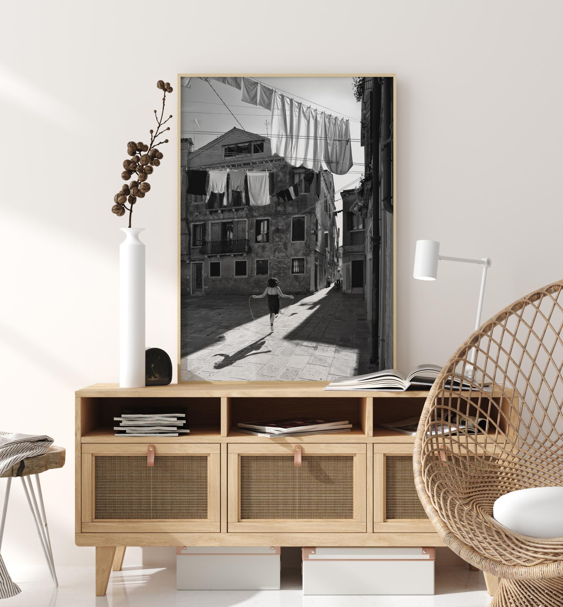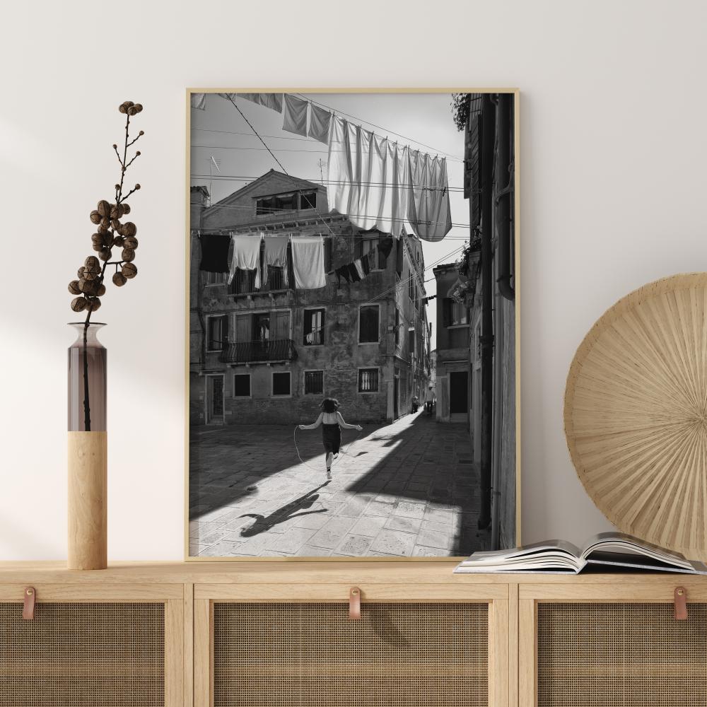 Okúzľujúci plagát s mladým dievčaťom, ktoré skáče cez švihadlo medzi domami a bielizňou. Jasný slnečný lúč ju zasiahne a vrhá jej tieň za ňu. Dodajte svojmu domovu pocit nevinného úžasu pomocou tohto obrazu.