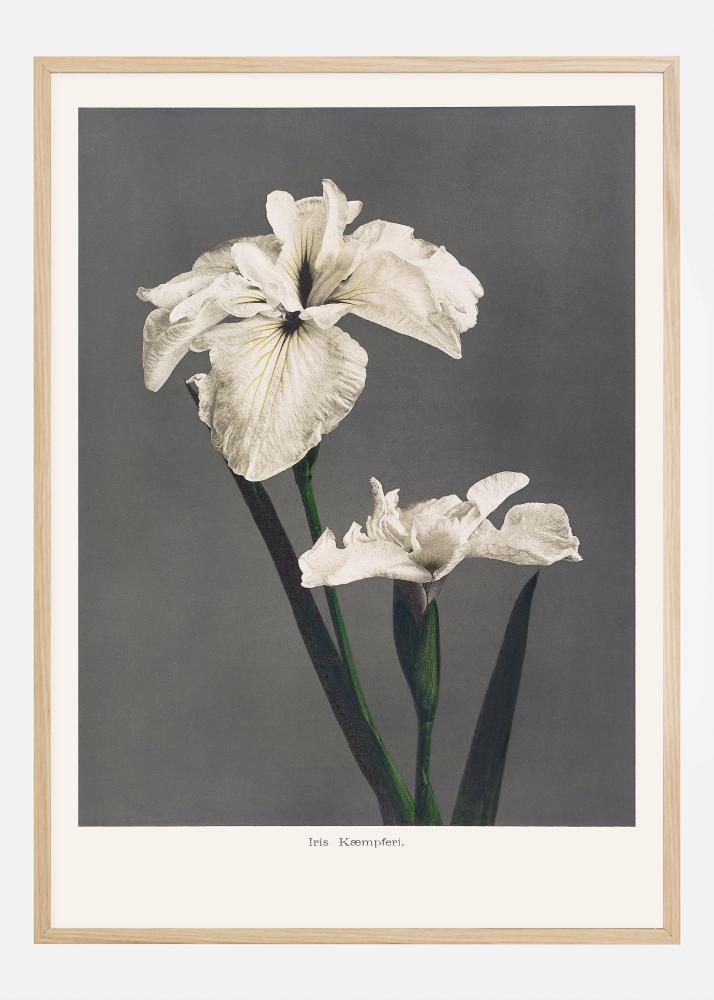 Táto elegantná plaketa predstavuje Iris Kaempferi, známe aj ako japonské orgovány, v odtieňoch vyblednutého zlata a bielej na nenápadnom sivom pozadí, ktoré zvýrazňuje sochárske kvality týchto očarujúcich kvetov. Detaily v štruktúre kvetov sú pekne zdôraznené tieňmi a svetlom, ktoré sa hrajú na okvetných lístkoch, zatiaľ čo tmavé, takmer čierne čiary v strede kveta pridávajú hĺbku a rozmer. Harmonická kompozícia farby a formy, ktorá znovu vytvára prirodzenú krásu týchto kvetov.