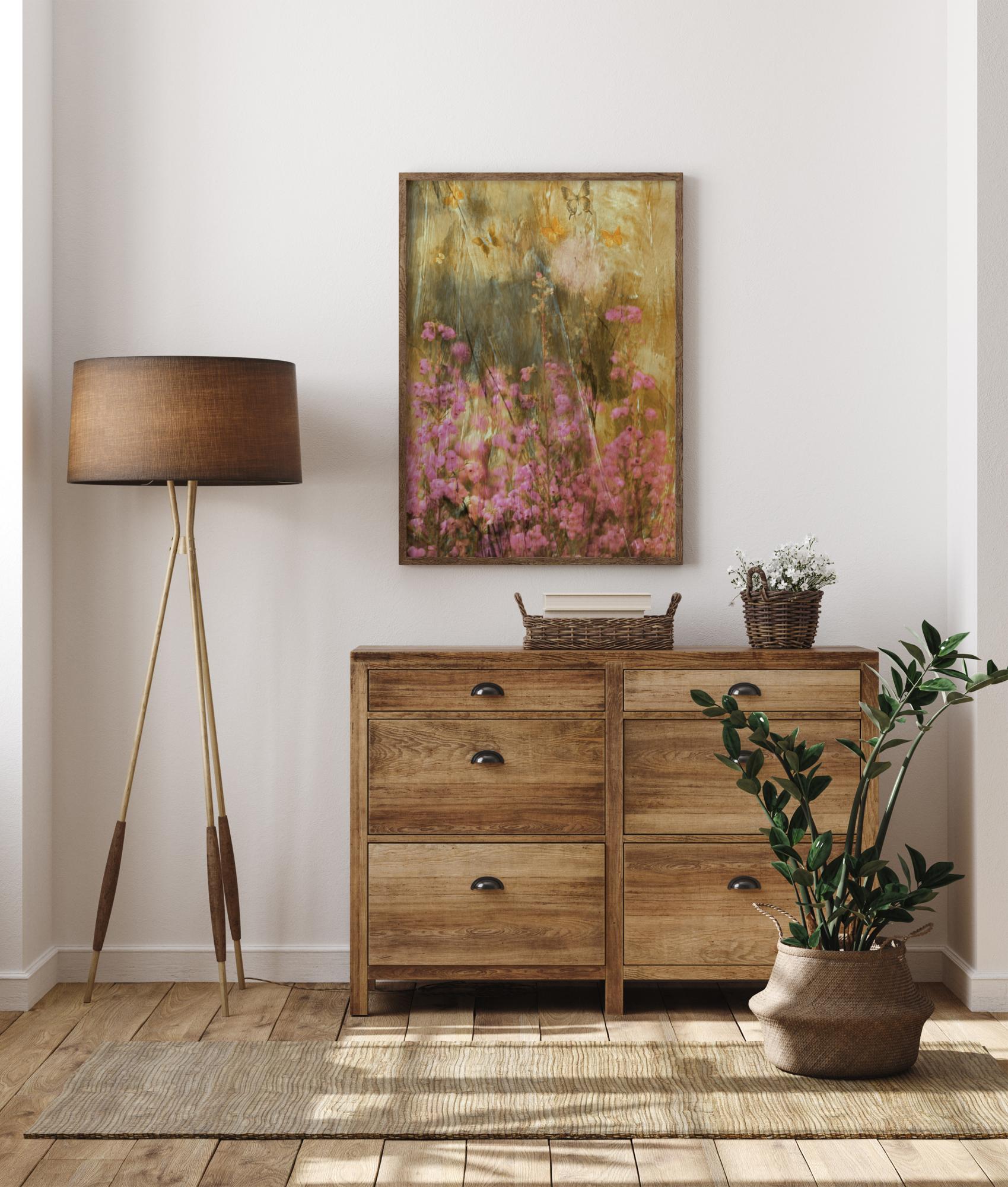 Krásny prírodopis, ktorý zobrazuje jar s ružovými a hnedými sušenými trávami na poli. Jemné pastelové farby dodávajú uvoľnený a pokojný pocit. Jemné ružové pastelové kvety vyplňujú obraz spolu s krásnymi hnedými motýľmi, ktoré lietajú v pozadí. Je to nádherný obraz pre každú miestnosť v dome, ak oceňuješ prírodu.