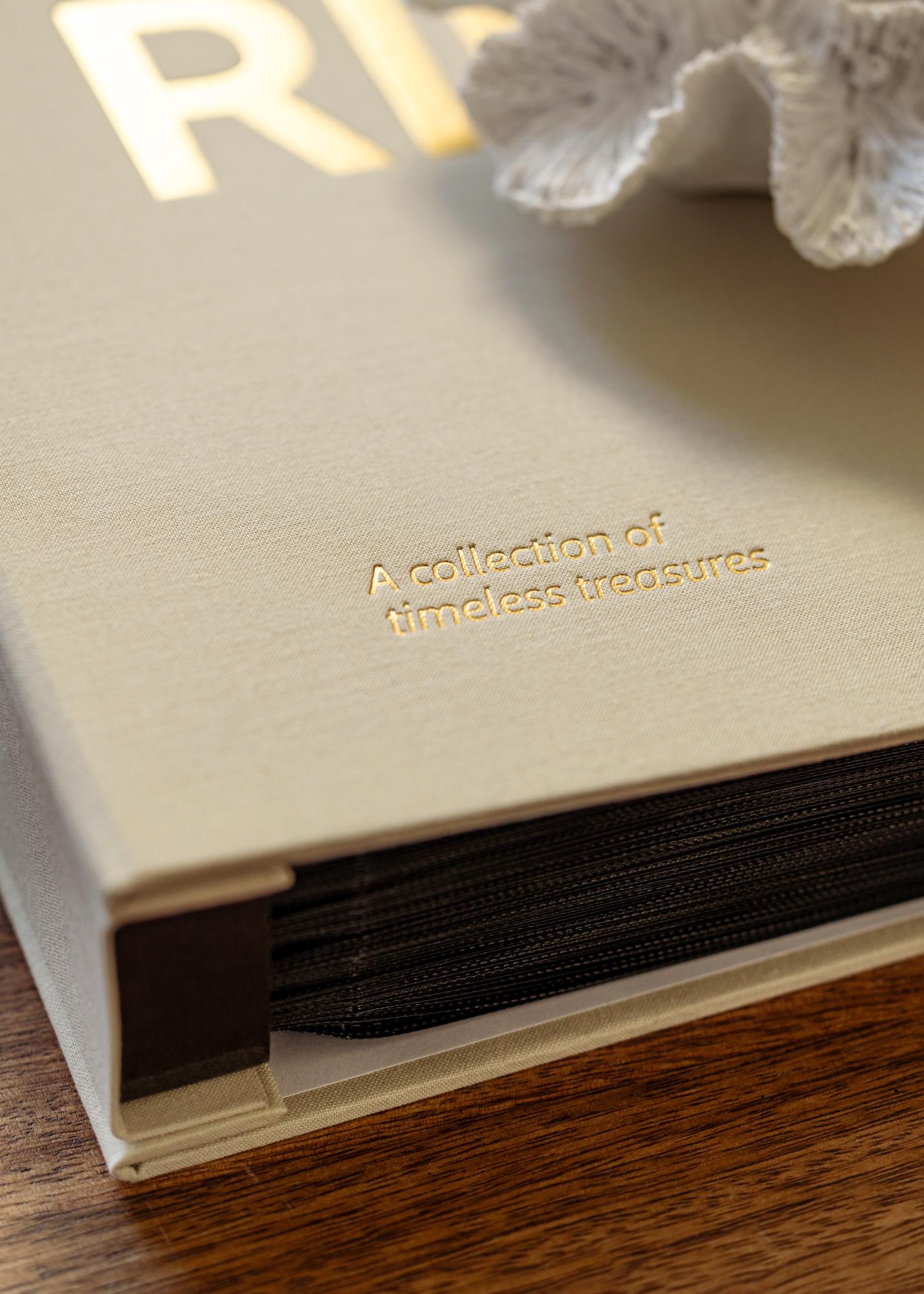 Toto je štýlový fotoalbum s nadčasovým dizajnom a praktickými vreckami na fotky – ideálne pre tých, ktorí chcú uchovať svoje najlepšie spomienky na fotkách elegantným a jednoduchým spôsobom. Album je oblečený v béžovej textílii a predná strana je ozdobená textom ”MEMORIES” v zlatom prevedení. Pre extra pocit má album aj podtext ”A collection of timeless treasures” napísaný v jednom rohu. Textilné obaly, spolu so zlatou farbou textu, robia z fotoalbumu luxusný interiérový prvok, ktorý budete chcieť mať položený na očiach.