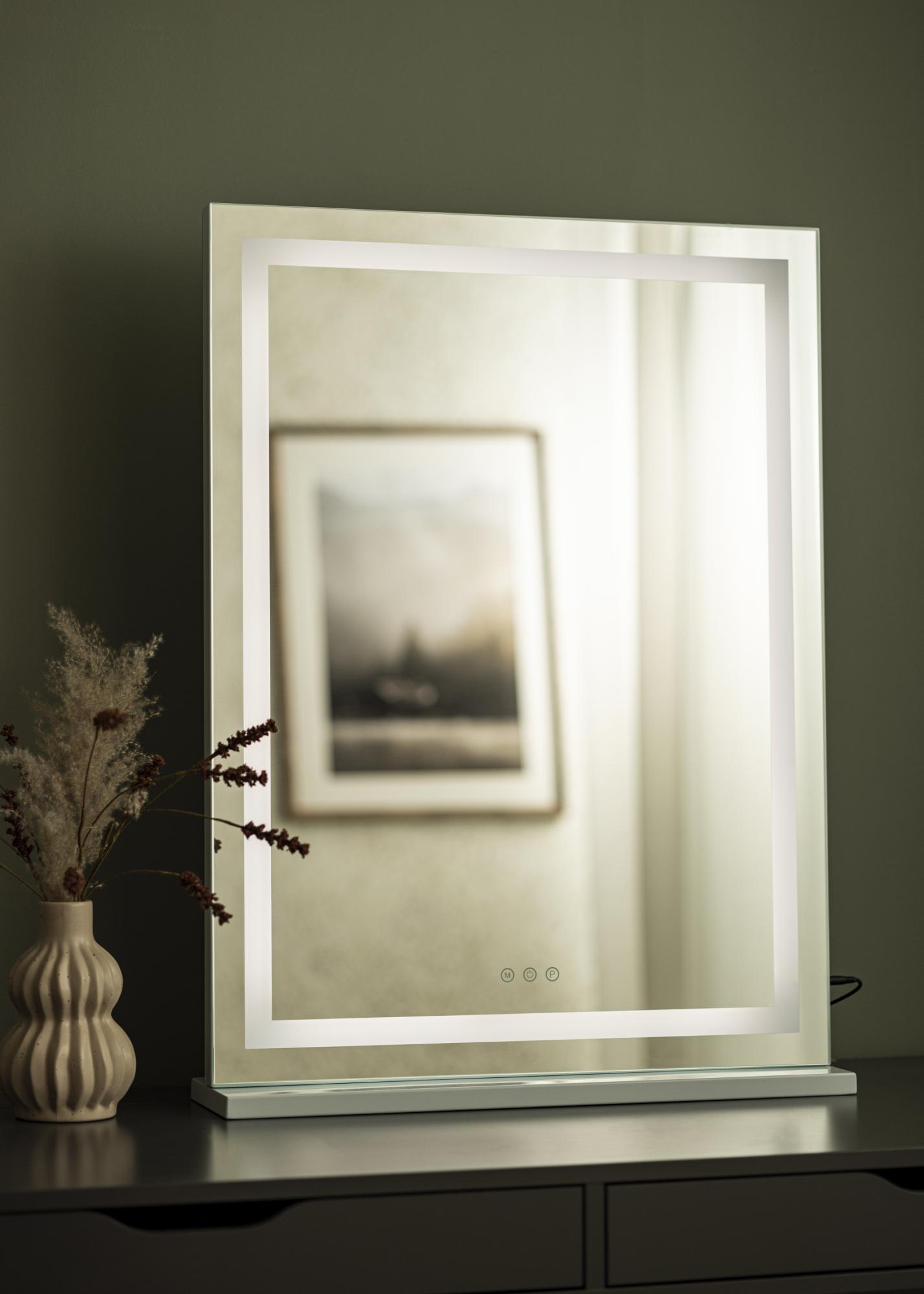 Táto kozmetická zrkadlová lampa je dokonalou kombináciou minimalizmu a trendovosti. Má klasický tvar a moderný LED pás, ktorý vytvára rám okolo zrkadlovej plochy s rozmermi 80x60 cm. Zrkadlo má stojan, ktorý sa dá odmontovať, takže si môžete vybrať, či chcete mať zrkadlo postavené na stole alebo zavesené na stene. Montuje sa vo vertikálnej polohe.