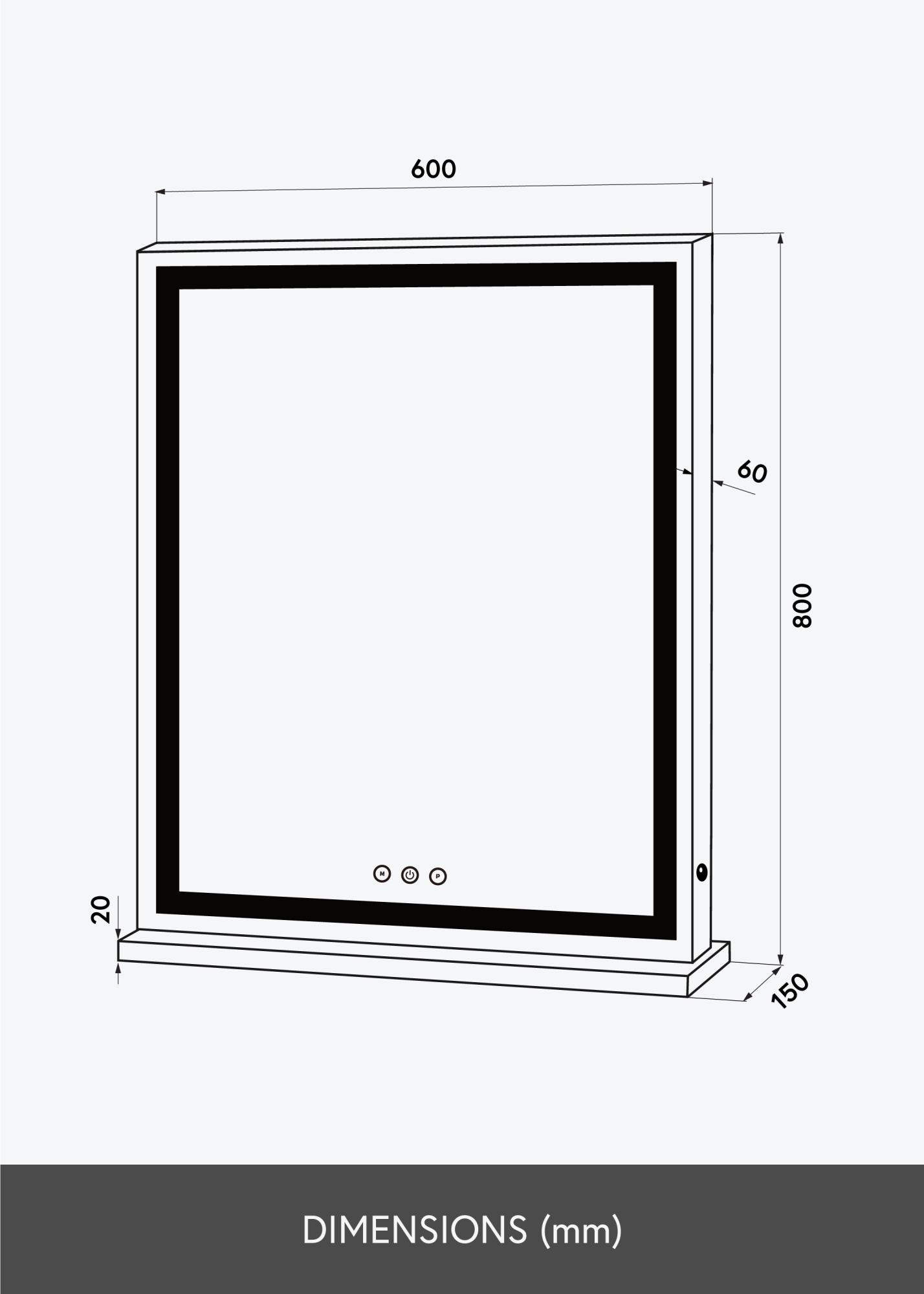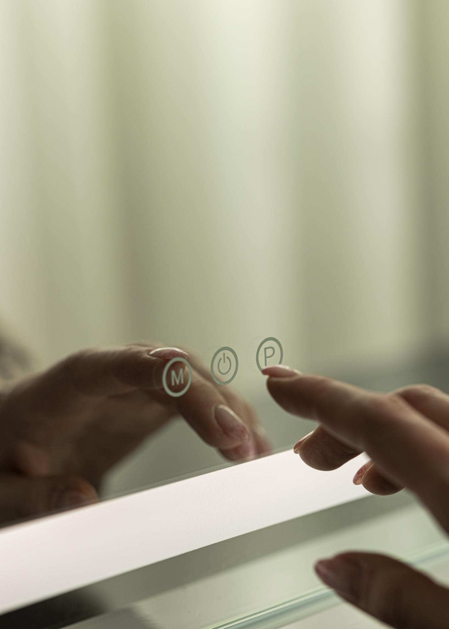 Na spodnom okraji zrkadla sú tri dotykové tlačidlá – jedno, ktoré zapína a vypína osvetlenie, a dve, ktoré menia nastavenia svetla. Tlačidlo ”M” nastavuje farebnú teplotu svetla medzi 3000K-6000K a tlačidlo ”P” stlmí osvetlenie. Inými slovami, môžete si nastaviť dokonalé osvetlenie pre každú príležitosť.