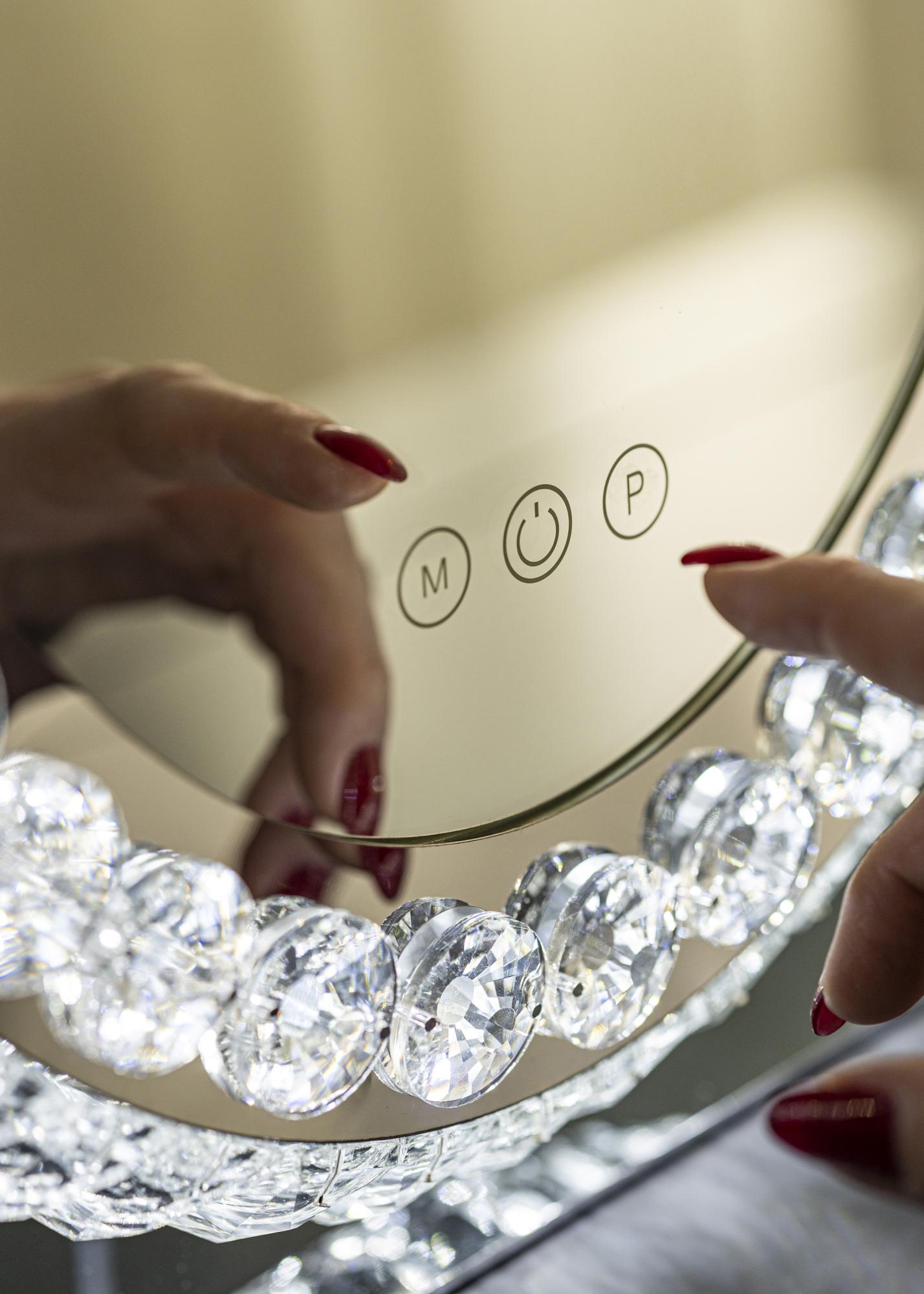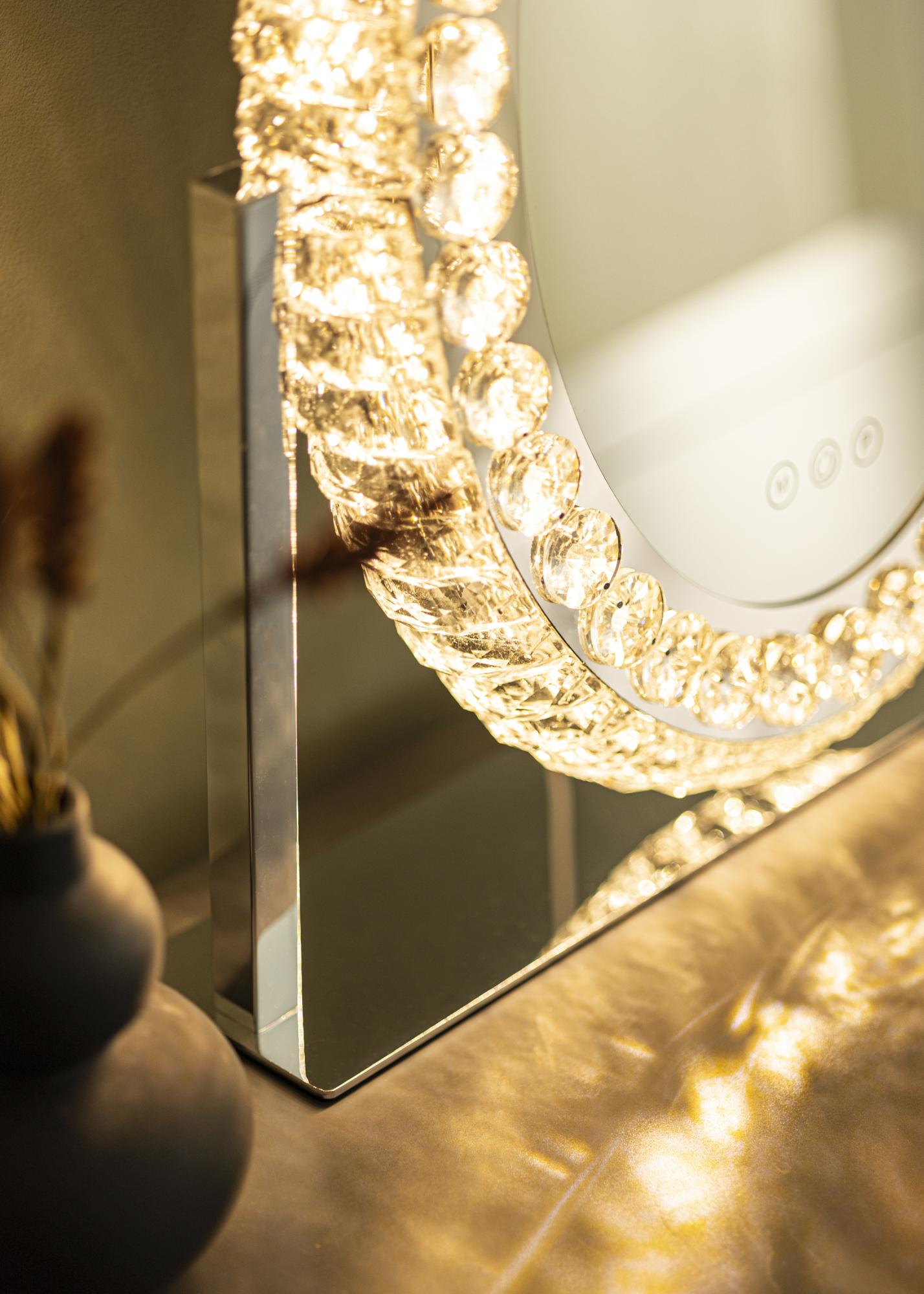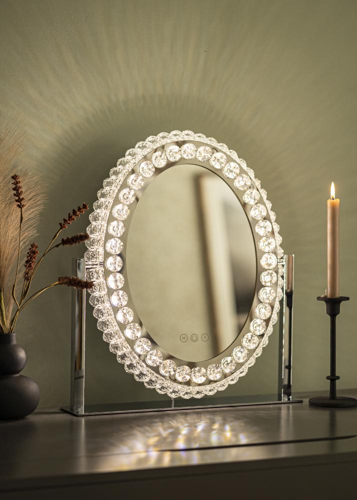 Toto je zrkadlo na líčenie v klasickom štýle, s dekoratívnym rámom a LED osvetlením. Oválny tvar zrkadla a rám s krištáľovými ozdobami mu dodávajú luxusný vzhľad, ktorý sa hodí tak do spálne, ako aj do obývačky. Je vyrobené z nehrdzavejúcej ocele a má stojaci dizajn.