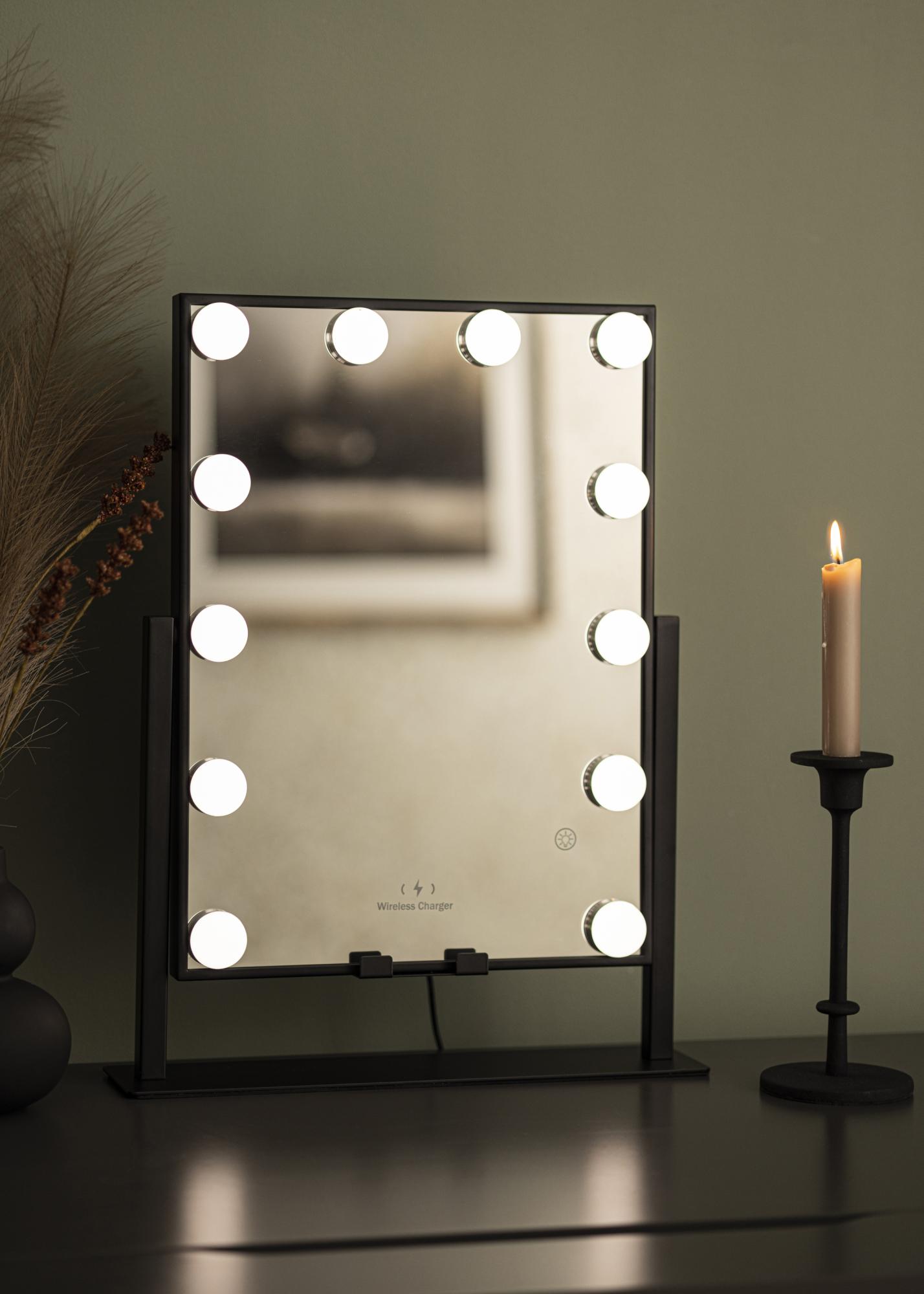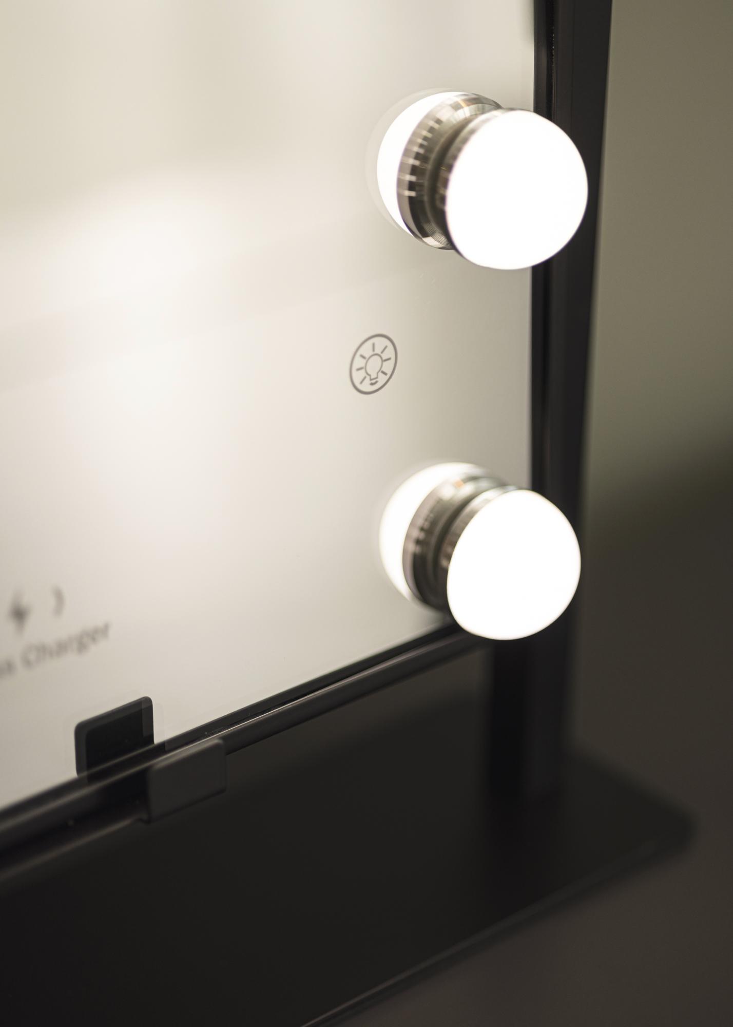 Zrkadlo má elegantnú čiernu farbu, ktorá sa dobre hodí k interiéru väčšiny miestností. Čierna farba je doplnená 12 LED lampami, ktoré pomáhajú ešte viac posilniť štýlový vzhľad. Zabudované LED lampy sú usporiadané ako rám okolo zrkadlovej plochy s rozmermi 30x41 cm. Ak stlačíš tlačidlo na dotyk na prednej strane zrkadla na niekoľko sekúnd, môžeš nastaviť osvetlenie na intenzitu, ktorá ti vyhovuje. Pripojenie do elektrickej siete sa uskutočňuje pomocou zásuvky.