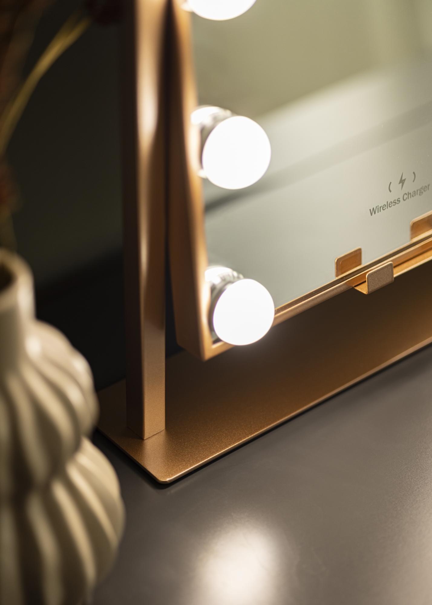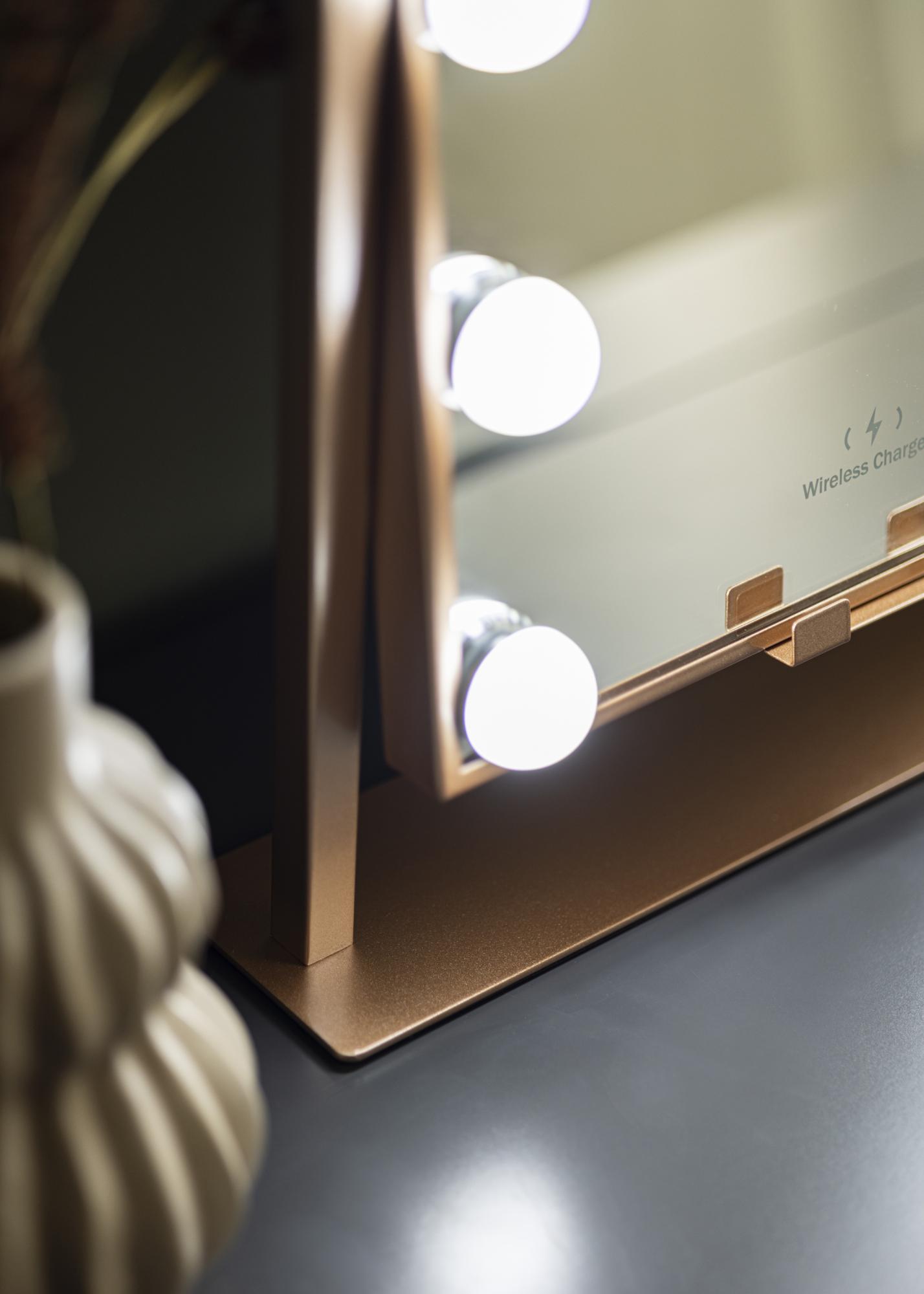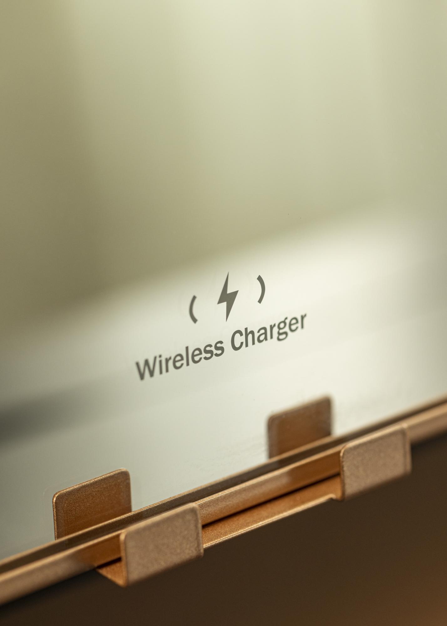 Toto je zrkadlo na líčenie v odtieni ružového zlata, s luxusnou funkciou bezdrôtového nabíjania! Keď je zrkadlo zapnuté, položte svoj telefón na určené miesto, aby sa nabíjal s výkonom 5V/2A (10W). Funkcia nabíjania funguje pre všetky smartfóny, ktoré podporujú bezdrôtové nabíjanie. Ďalšie inteligentné funkcie tohto zrkadla zahŕňajú nastaviteľnú zrkadlovú plochu a vstavané LED osvetlenie, ktoré poskytuje dobré svetlo pri nanášaní make-upu. Osvetlenie pozostáva z 12 LED žiaroviek, ktoré krásne ohraničujú zrkadlovú plochu a dávajú celému zrkadlu štýlový vzhľad. Osvetlenie je stmievateľné a na nastavenie svetla na požadovanú intenzitu podržte dotykové tlačidlo na prednej strane zrkadla niekoľko sekúnd.