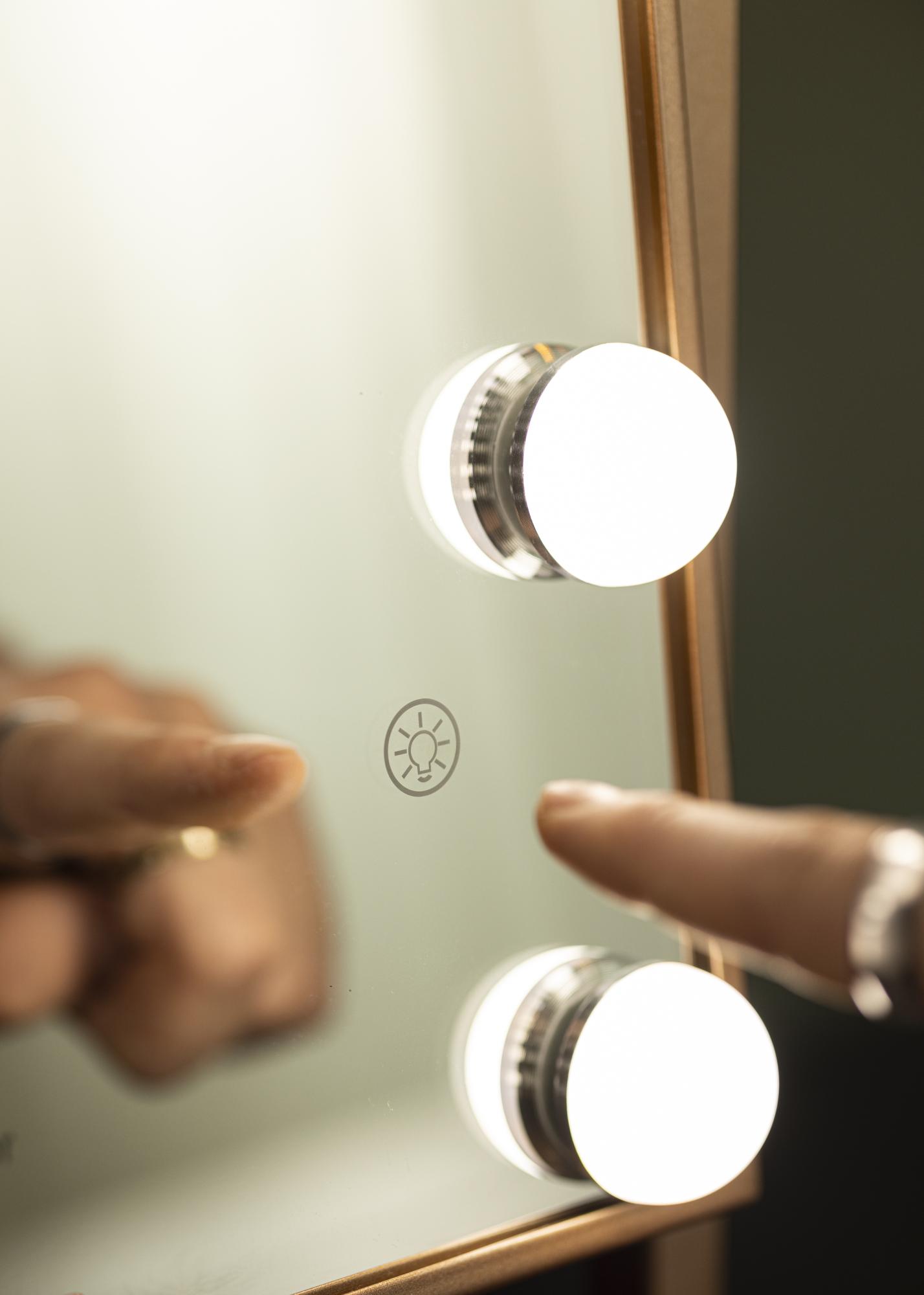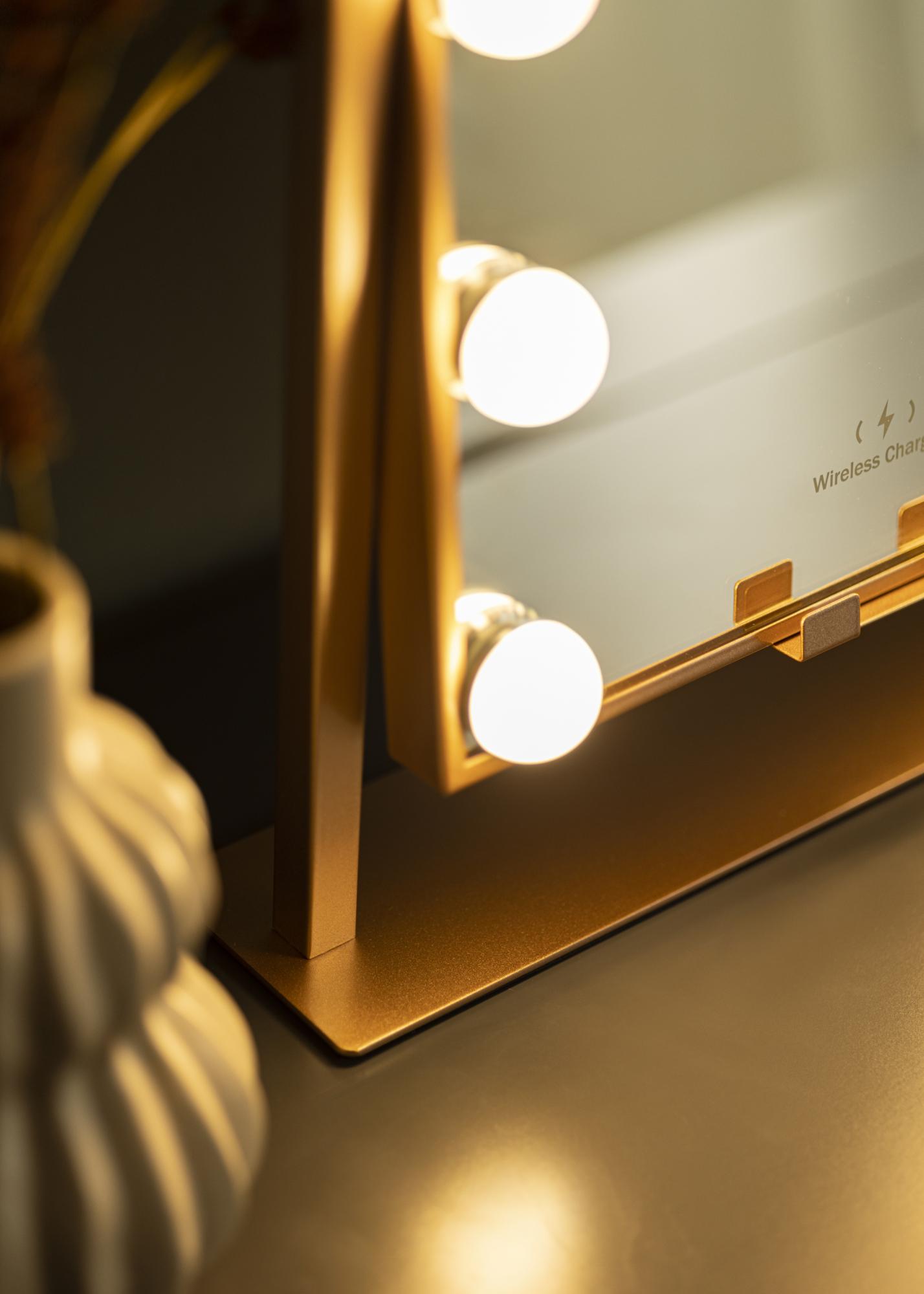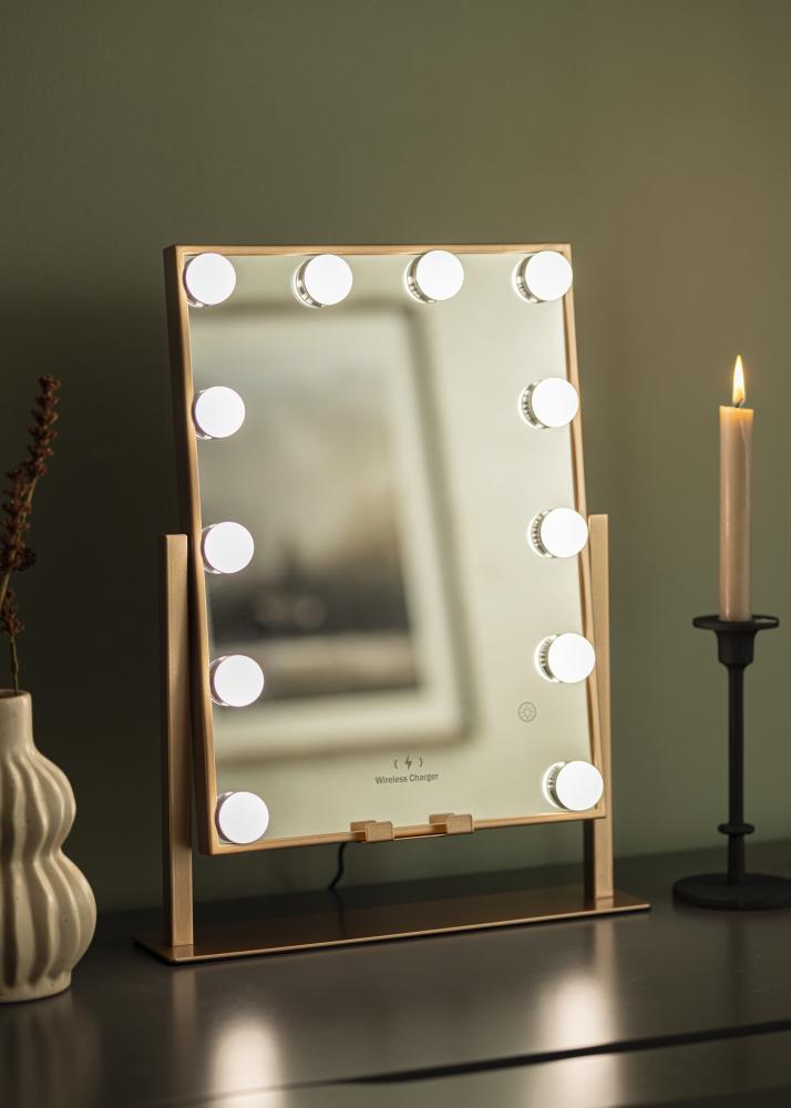 Toto je zrkadlo na líčenie v odtieni ružového zlata, s luxusnou funkciou bezdrôtového nabíjania! Keď je zrkadlo zapnuté, položte svoj telefón na určené miesto, aby sa nabíjal s výkonom 5V/2A (10W). Funkcia nabíjania funguje pre všetky smartfóny, ktoré podporujú bezdrôtové nabíjanie. Ďalšie inteligentné funkcie tohto zrkadla zahŕňajú nastaviteľnú zrkadlovú plochu a vstavané LED osvetlenie, ktoré poskytuje dobré svetlo pri nanášaní make-upu. Osvetlenie pozostáva z 12 LED žiaroviek, ktoré krásne ohraničujú zrkadlovú plochu a dávajú celému zrkadlu štýlový vzhľad. Osvetlenie je stmievateľné a na nastavenie svetla na požadovanú intenzitu podržte dotykové tlačidlo na prednej strane zrkadla niekoľko sekúnd.