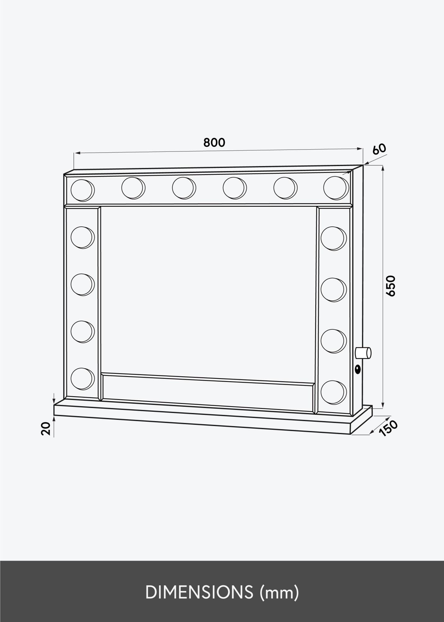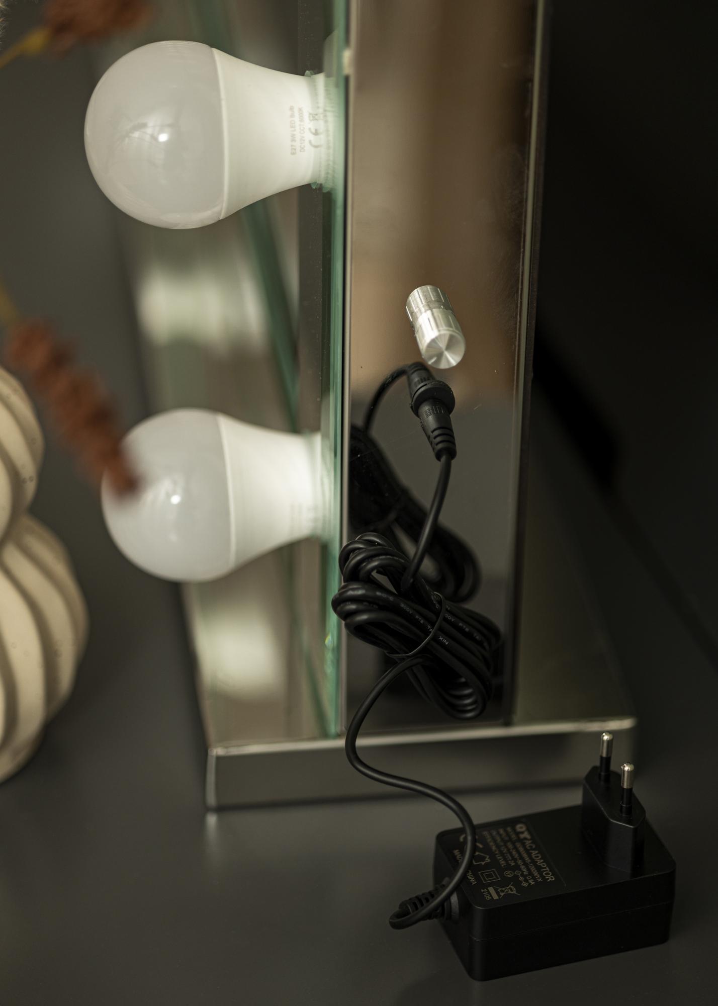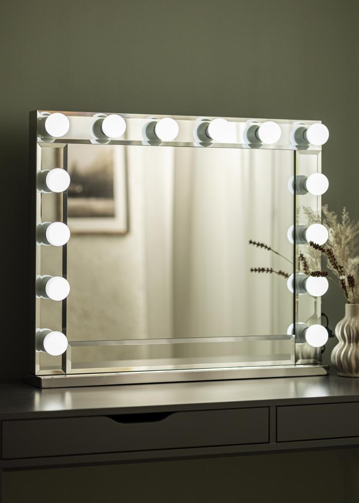 Ozdobte svoj domov touto kozmetickou zrkadlov v hollywoodskom dizajne. Zrkadlo má rám striebornej farby, ktorý je ozdobený 14 žiarovkami, čo dodáva zrkadlu luxusný vzhľad. Žiarovky sú vymeniteľné a majú objímku E27. Lampy vyžarujú studené biele svetlo. Ak si želáte, môžete si zvoliť zatemnenie svojho osvetlenia na svetelnú intenzitu, ktorá vyhovuje vášmu účelu – jasné osvetlenie je vynikajúce pri líčení, zatiaľ čo viac zatemnené svetlo je vhodné ako podsvietenie na pozadí. Táto úprava sa jednoducho vykonáva pomocou malého otočného gombíka na bočnej strane zrkadla.