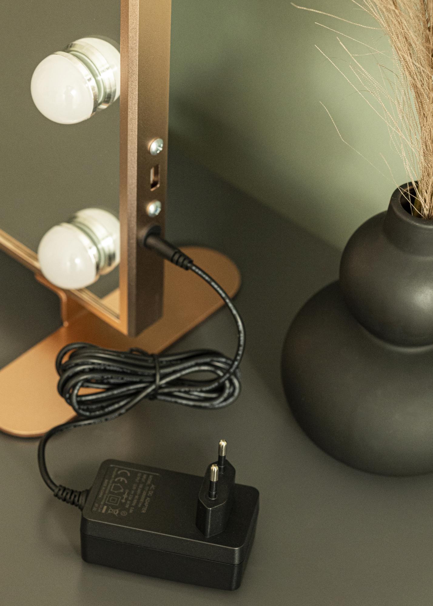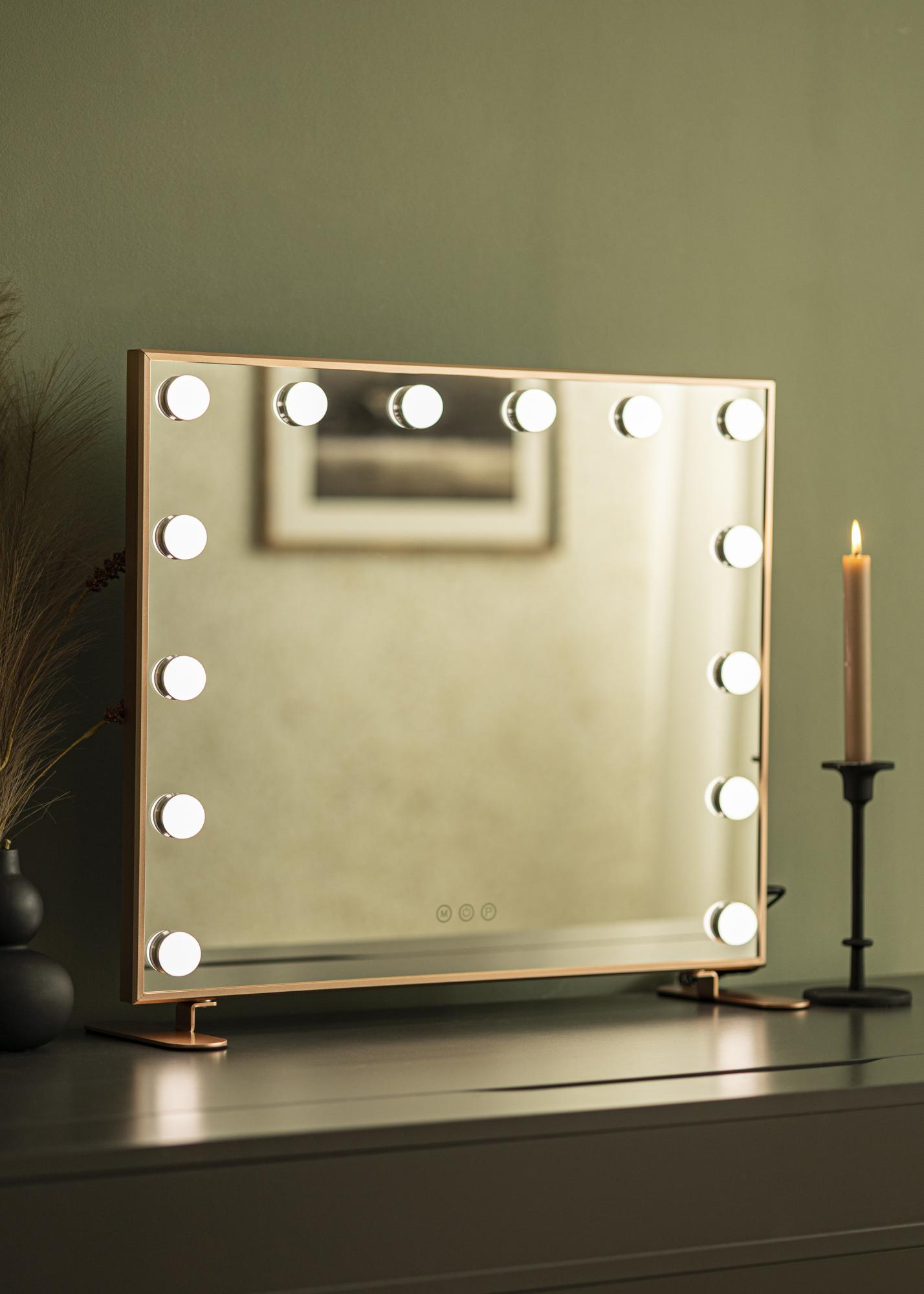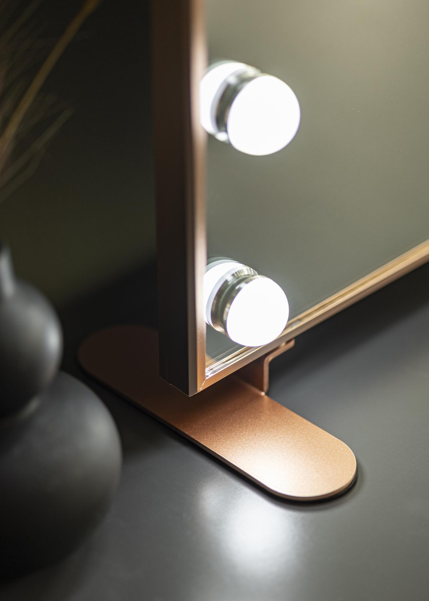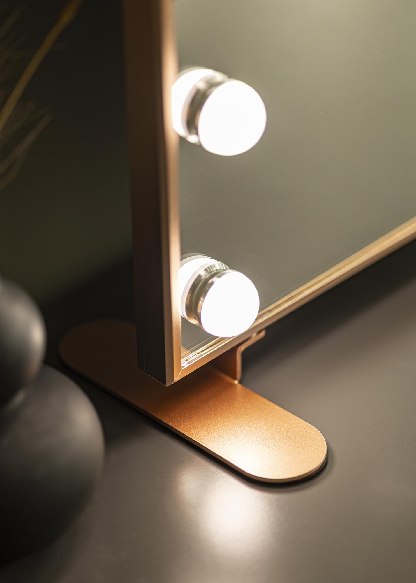 Tento luxusný zrkadlový make-up má tenký kovový rám v ružovozlatej farbe a LED osvetlenie vo forme 14 veľkých lámp. To dodáva zrkadlu pôvabný vzhľad inšpirovaný Hollywoodom, ktorý nastavuje štýl v každej miestnosti. Má elegantný stojan, tiež v odtieni ružového zlata, ktorý možno odmontovať, ak si prajete zavesiť zrkadlo na stenu.