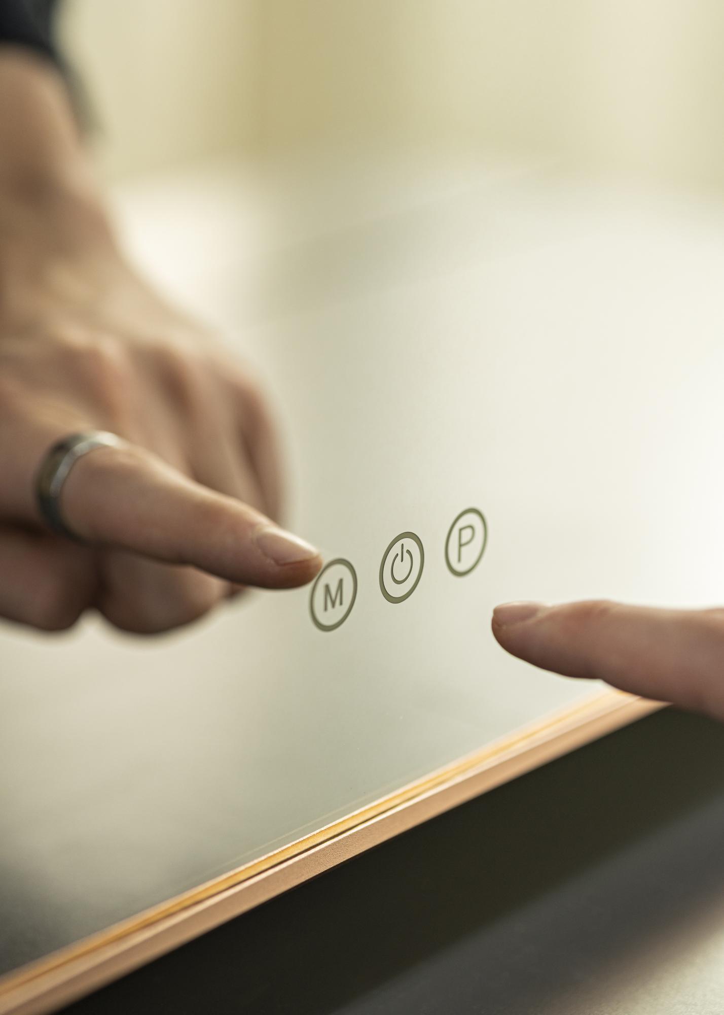 LED osvetlenie je nastaviteľné a na zmenu nastavení svetla používate dotykové tlačidlá na spodnom okraji zrkadla. Tlačidlo „M“ mení farebnú teplotu a tlačidlo „P“ nastavuje jas. Je tu aj tlačidlo, ktoré zapína a vypína osvetlenie. Flexibilné osvetlenie spôsobuje, že toto zrkadlo sa hodí ako do obývačky, keď chcete jemnejšie podsvietenie, tak aj do kúta na líčenie, keď potrebujete ostré svetlo, ktoré vám pomôže sústrediť sa. Zrkadlo je navyše vybavené USB portom, takže si môžete jednoducho nabíjať svoje smart zariadenia.