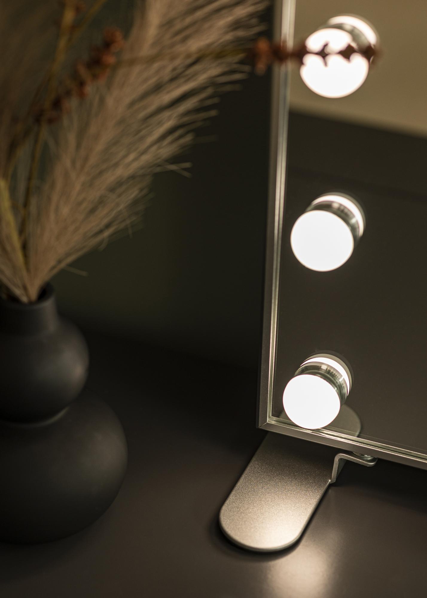 Strieborný stojan môže byť odstránený, čo umožňuje, aby toto zrkadlo fungovalo aj ako luxusné nástenné zrkadlo. Elektrické pripojenie sa realizuje cez zástrčku.