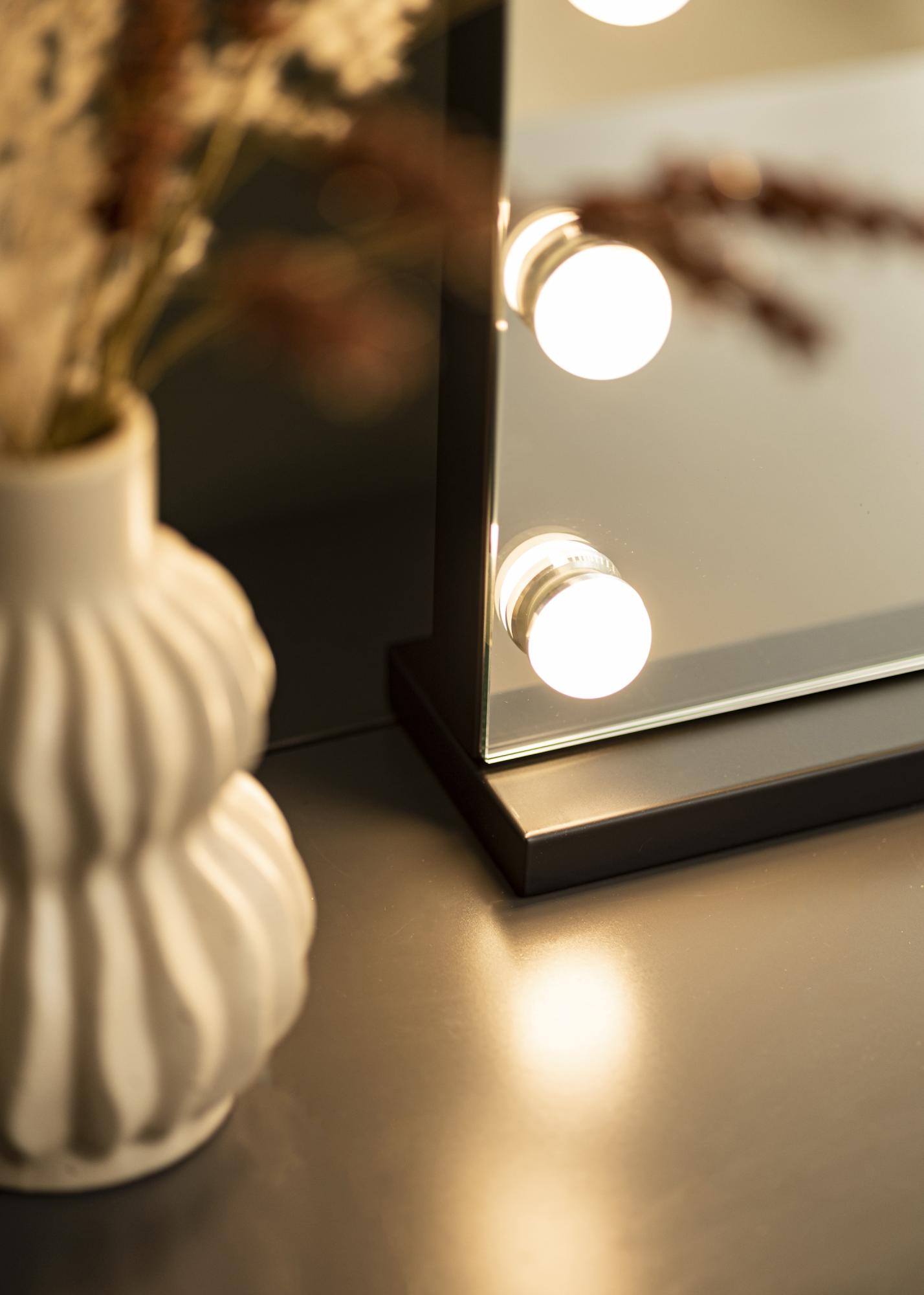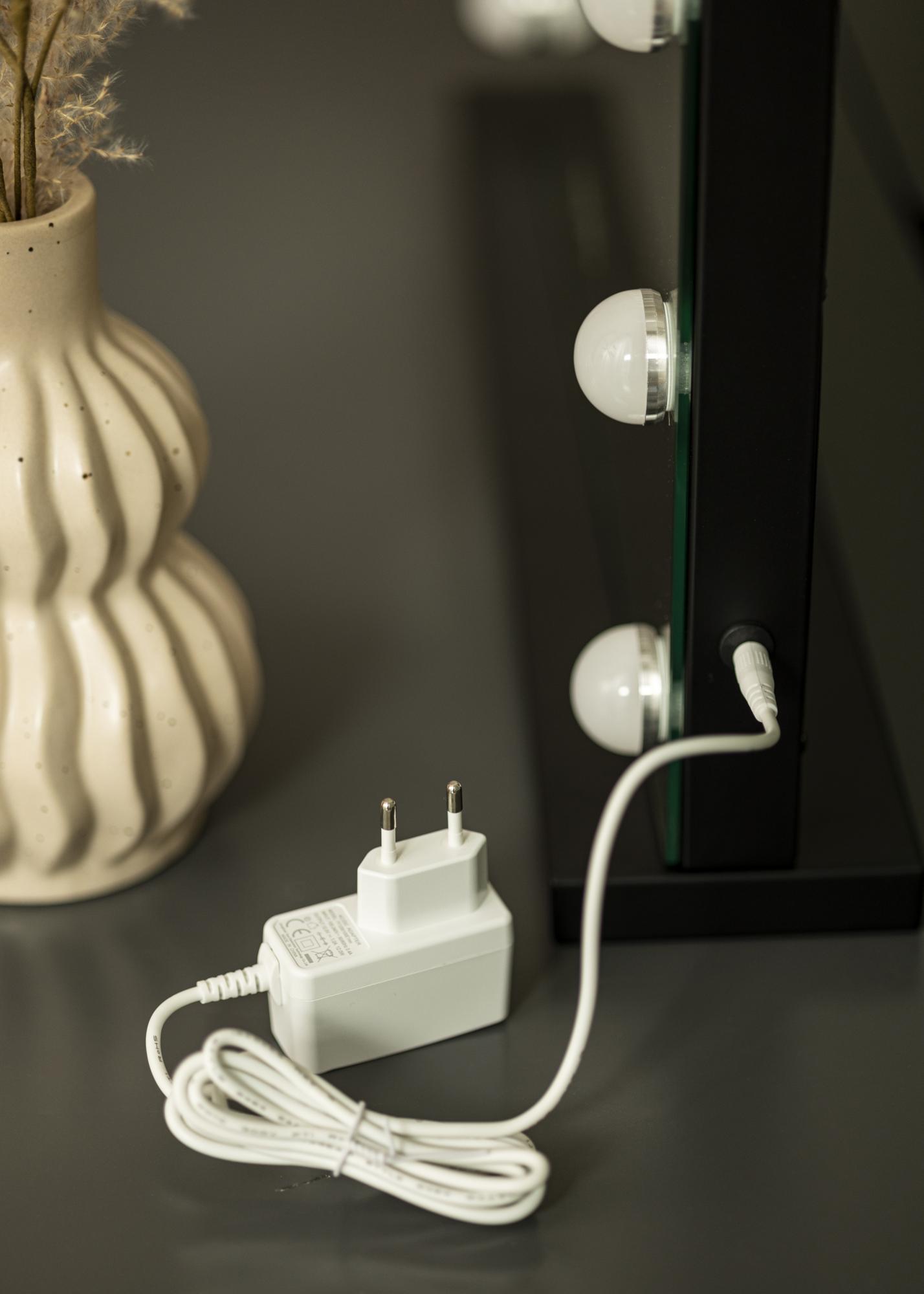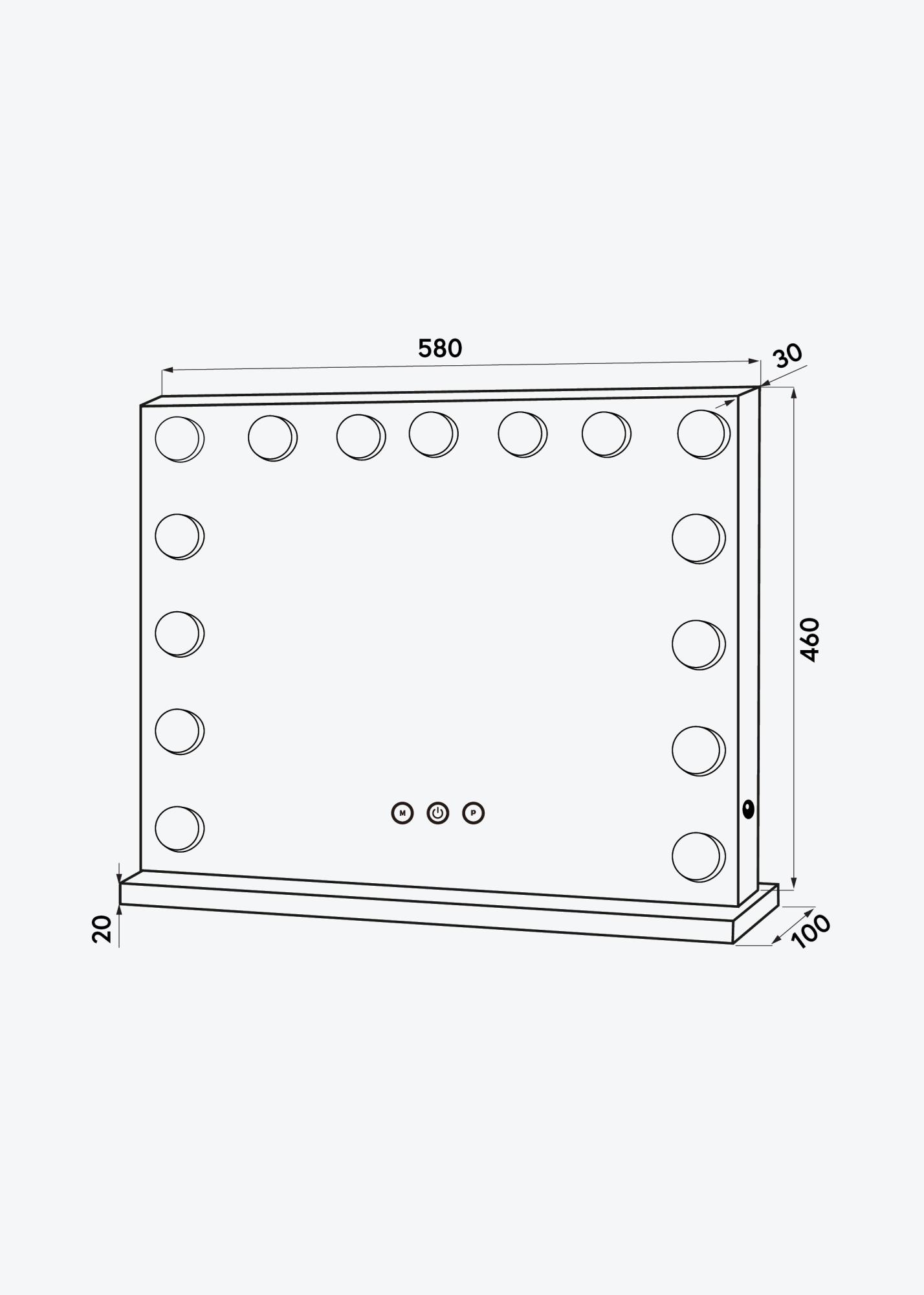 Oživte kútik na líčenie, obývačku alebo chodbu elegantným zrkadlom na líčenie so vstavaným osvetlením! Zrkadlo nemá tradičný rám, ale namiesto toho je zrkadlová plocha orámovaná 15 LED svetlami, ktoré sú umiestnené pozdĺž okrajov zrkadla. Osvetlenie je nastaviteľné a môžete si nastaviť jas aj teplotu farieb. Nastavenie svetla sa vykonáva pomocou dotykových tlačidiel na spodnom okraji zrkadla, kde "P" tlačidlo mení jas a "M" tlačidlo upravuje teplotu farby. Je tam aj dotykové tlačidlo na zapnutie alebo vypnutie osvetlenia. Pripojenie na elektrinu sa deje cez zástrčku.