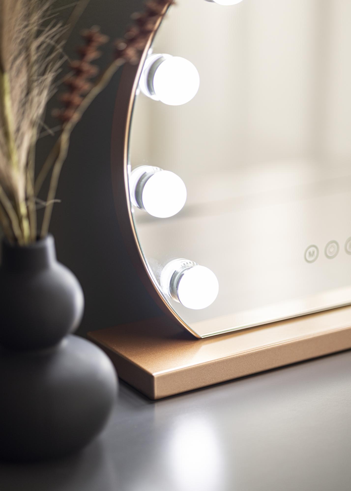 Táto zrkadlo má klasický okrúhly tvar s 10 veľkými LED žiarovkami, ktoré rámujú 40x30 cm veľkú zrkadlovú plochu. To dodáva exkluzívny vzhľad, ktorý je ešte viac posilnený podstavcom zrkadla v trendovom odtieni ružového zlata. Osvetlenie zabudované v zrkadle zapnete dotykovým tlačidlom na prednej strane zrkadla. Máte tiež možnosť nastaviť farbu a jas svetla podľa svojich predstáv. Aj to sa robí pomocou praktických dotykových tlačidiel, označených "M" na nastavenie teploty farby a "P" na nastavenie jasu. Tri farby svetla, ktoré si môžete vybrať, sú teplé, chladné a prirodzené svetlo.