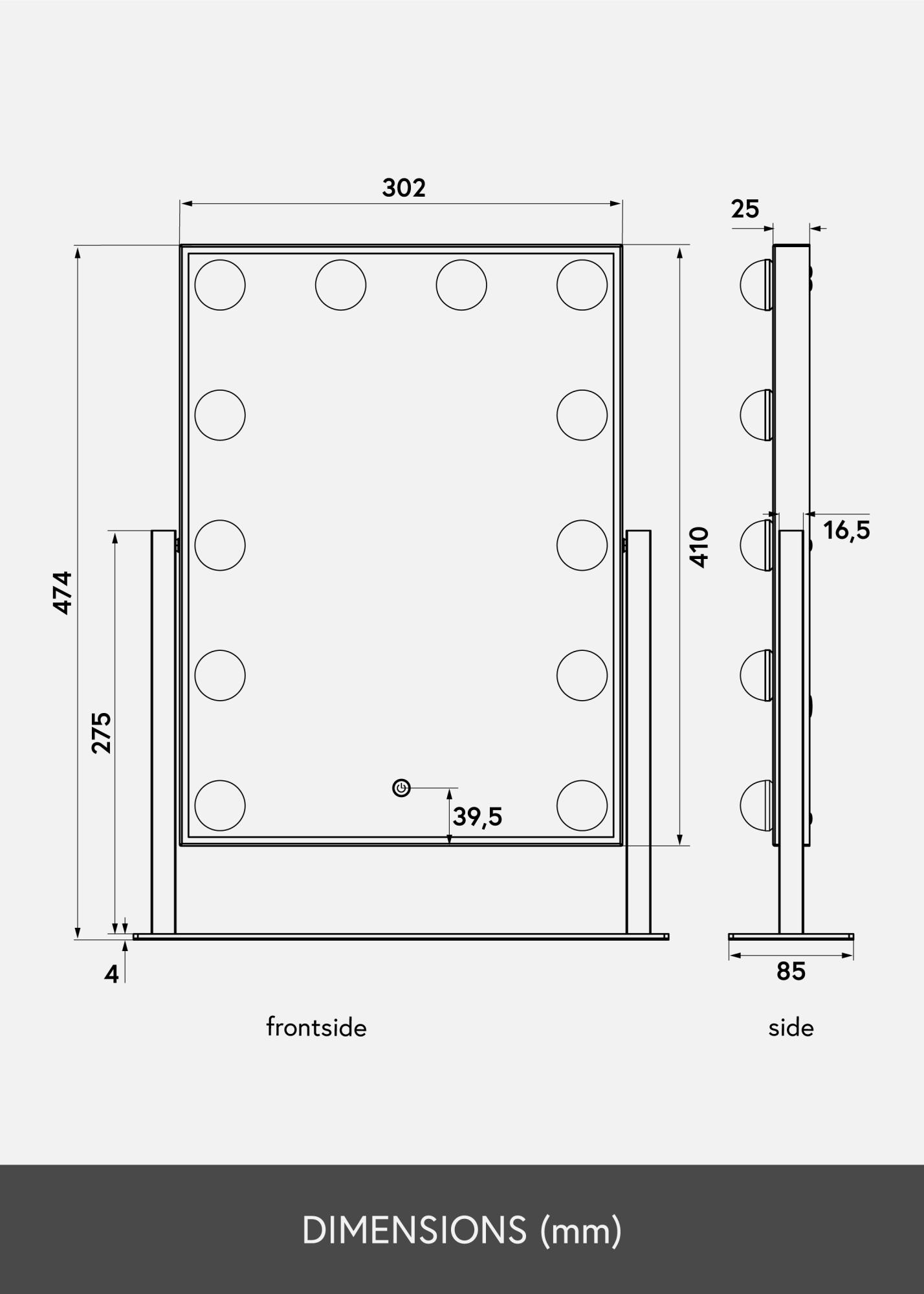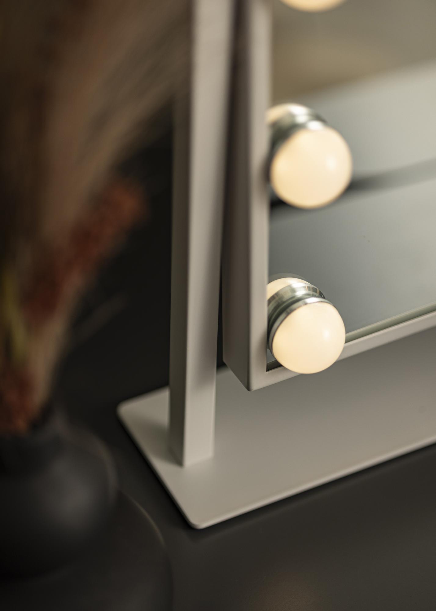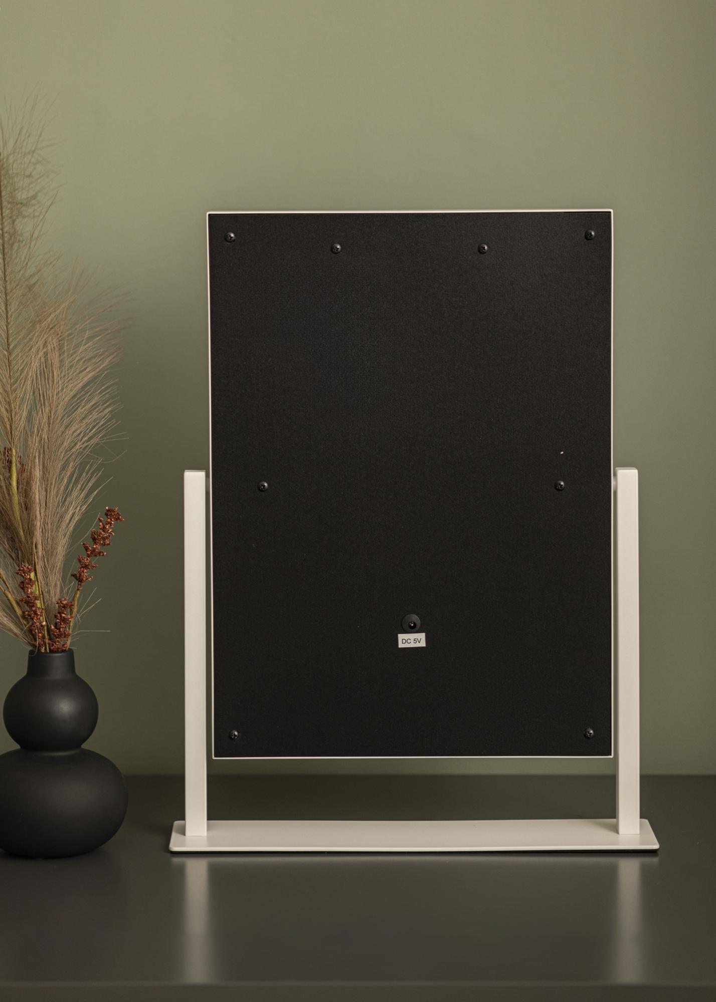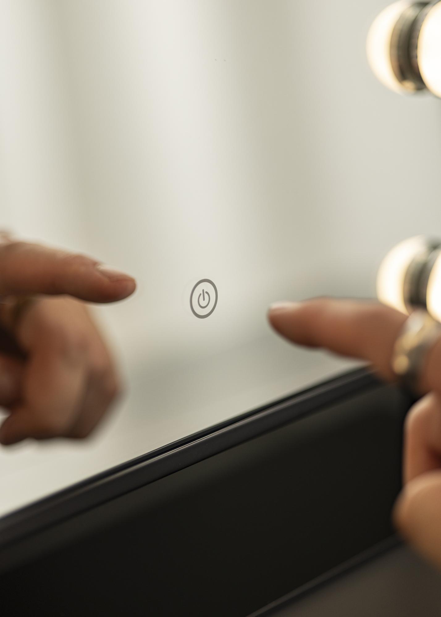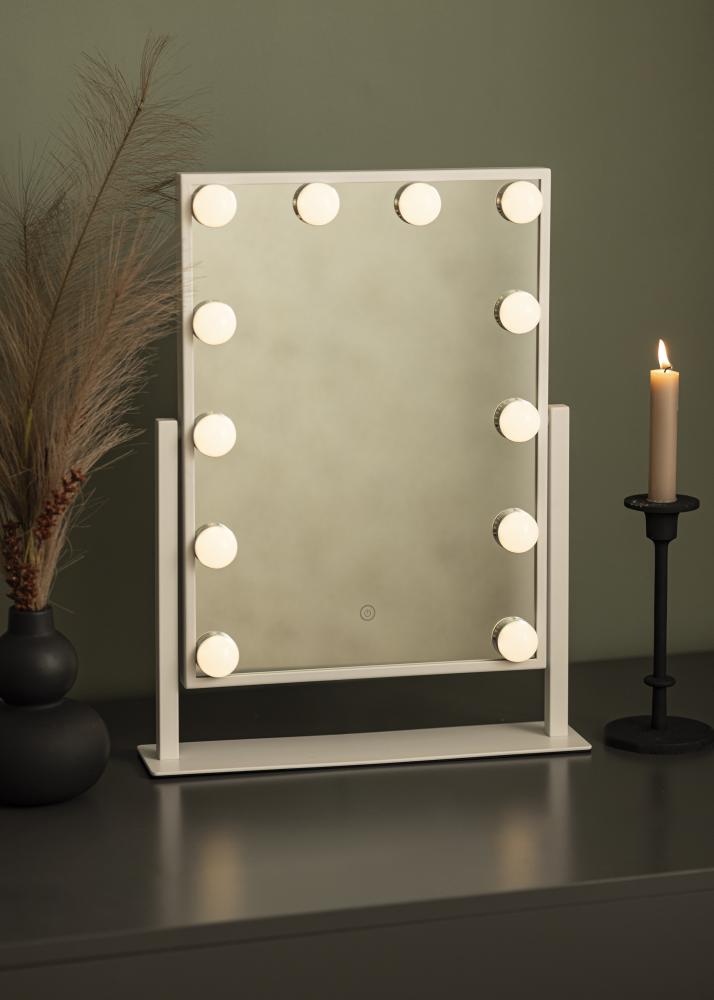 Toto je zrkadlo na líčenie v luxusnom prevedení s 12 dekoratívnymi LED žiarovkami v elegantnom bielom odtieni. Žiarovky štýlovo rámujú veľkorysú zrkadlovú plochu s rozmermi 30x40 cm a poskytujú teplé biele svetlo v 3000K. Osvetlenie sa zapína stlačením dotykového tlačidla na obrazovke a má funkciu stmievania, ktorú ľahko nastavíte podržaním tlačidla na niekoľko sekúnd. Zrkadlo je možné nakloniť vertikálne, takže sa ľahko nalíčite z uhla, ktorý vám najviac vyhovuje. Okrem jeho mnohých funkcií sa toto zrkadlo na líčenie stáva elegantným doplnkom a vytvára skutočný hollywoodsky pocit vo vašej domácnosti!