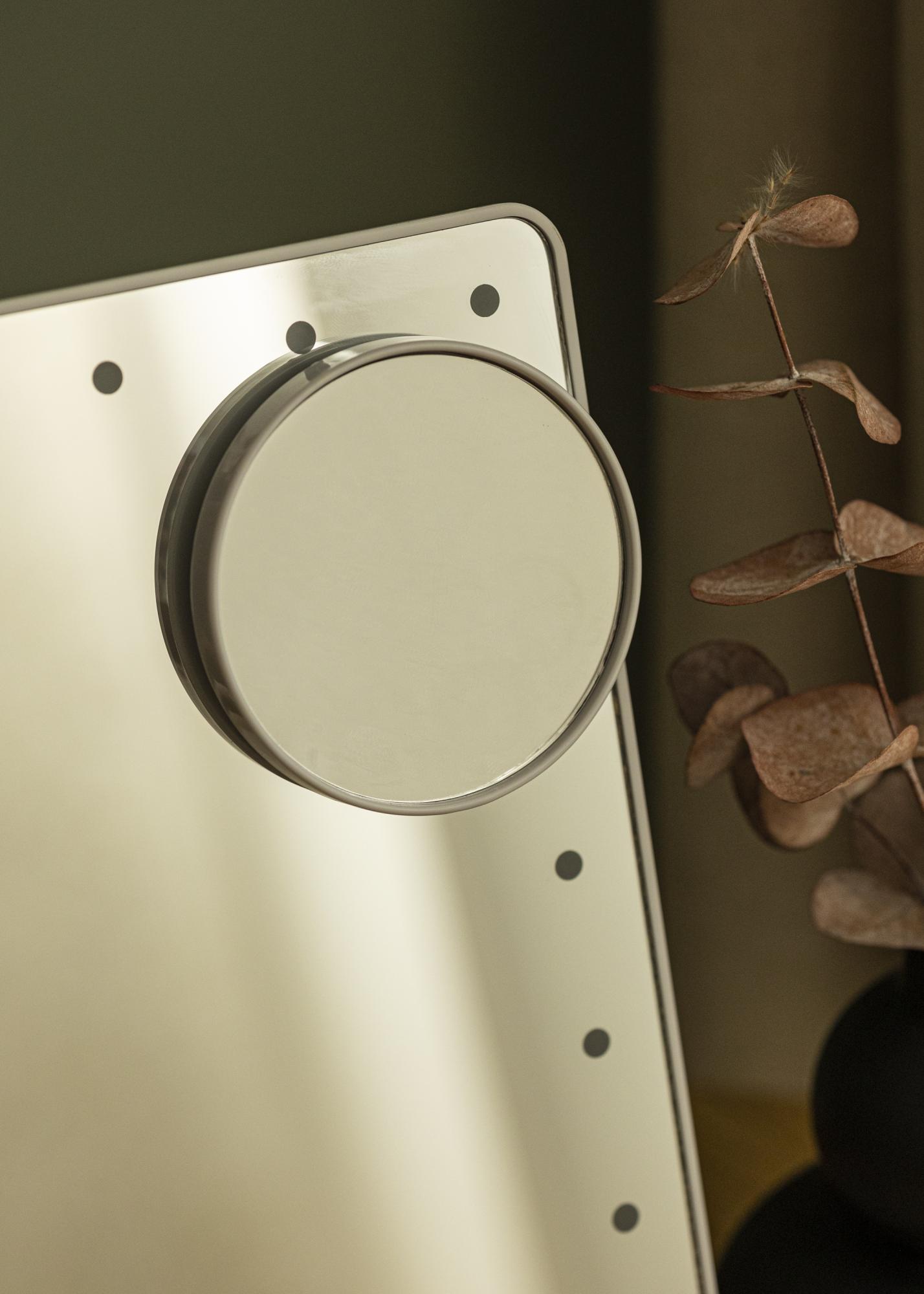Zrkadlo má malú veľkosť s plochou zrkadla 16,5x25 cm, čo umožňuje jeho jednoduché premiestňovanie. Plochu zrkadla možno otáčať a nakláňať, aby ste si mohli nastaviť uhol, ktorý vám vyhovuje. Súčasťou je menšie zrkadlo s 2x a 3x priblížením, ktoré môže byť použité samostatne alebo pripevnené na sklo väčšieho zrkadla. Toto kozmetické zrkadlo má navyše vstavané LED osvetlenie, ktoré poskytuje chladné biele svetlo na tvár, keď sa pozeráte do zrkadla. Osvetlenie možno zapnúť a vypnúť pomocou tlačidla na zadnej strane zrkadla a máte tiež možnosť stlmiť svetlo. Zrkadlo je napájané vstavanou batériou, ktorá sa nabíja prostredníctvom USB pripojenia. Nabíjací kábel je súčasťou balenia.