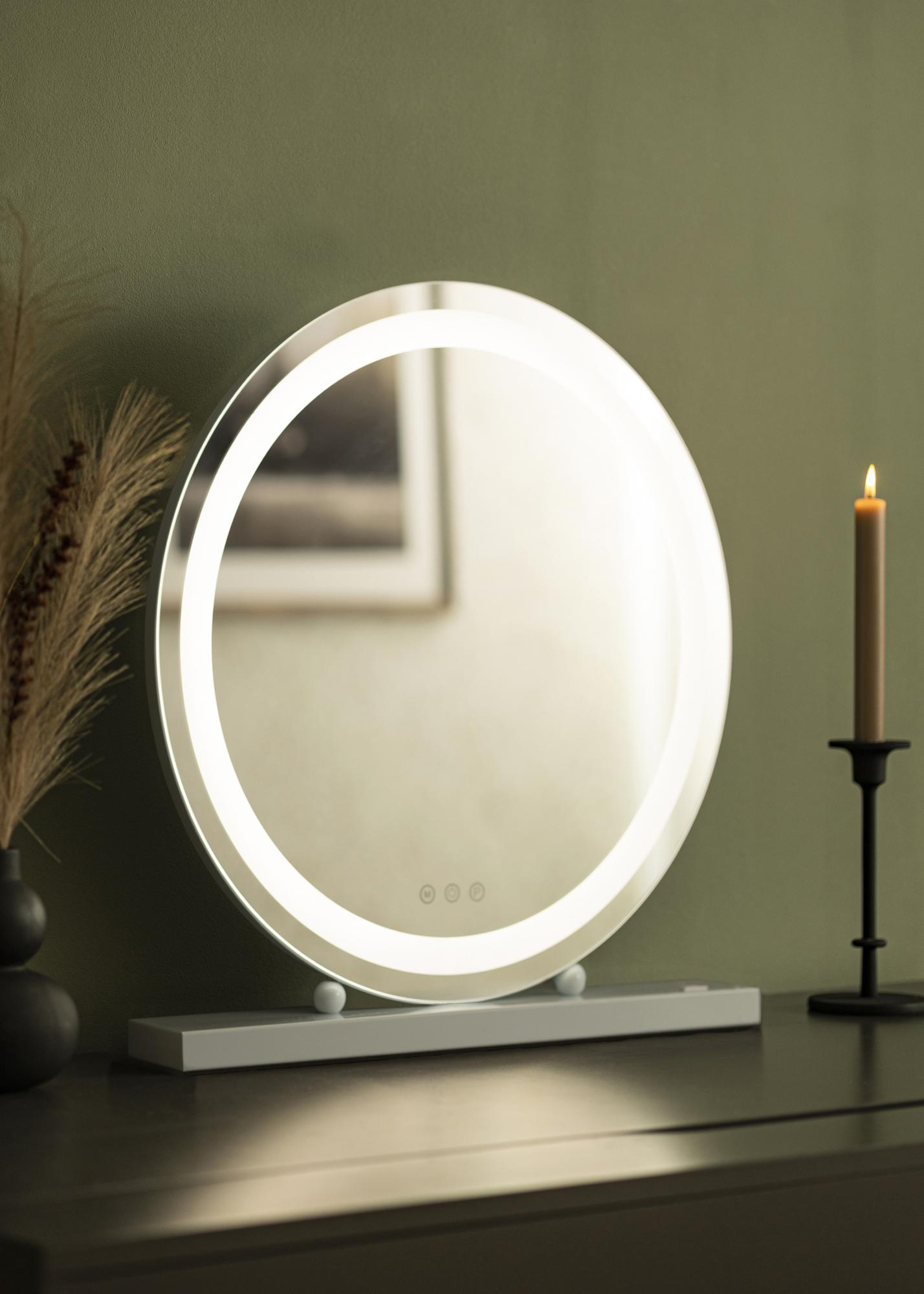 Chcete mať sofistikované zrkadlo v stojacej dizajne na kozmetickom stolíku, komode v predsieni alebo na kredenci v obývacej izbe? Toto je okrúhle zrkadlo so štýlovou bielou základňou a integrovaným LED osvetlením, ktoré bude elegantným a praktickým prírastkom vo vašom dome. LED osvetlenie zrkadla pozostáva z integrovanej LED pásky, ktorá sa zapína a vypína pomocou dotykového tlačidla na povrchu zrkadla. K dispozícii sú aj dotykové tlačidlá na nastavenie svetelných podmienok zrkadla; tlačidlo označené "M" na nastavenie farebnej teploty a tlačidlo označené "P" na úpravu jasnosti.
