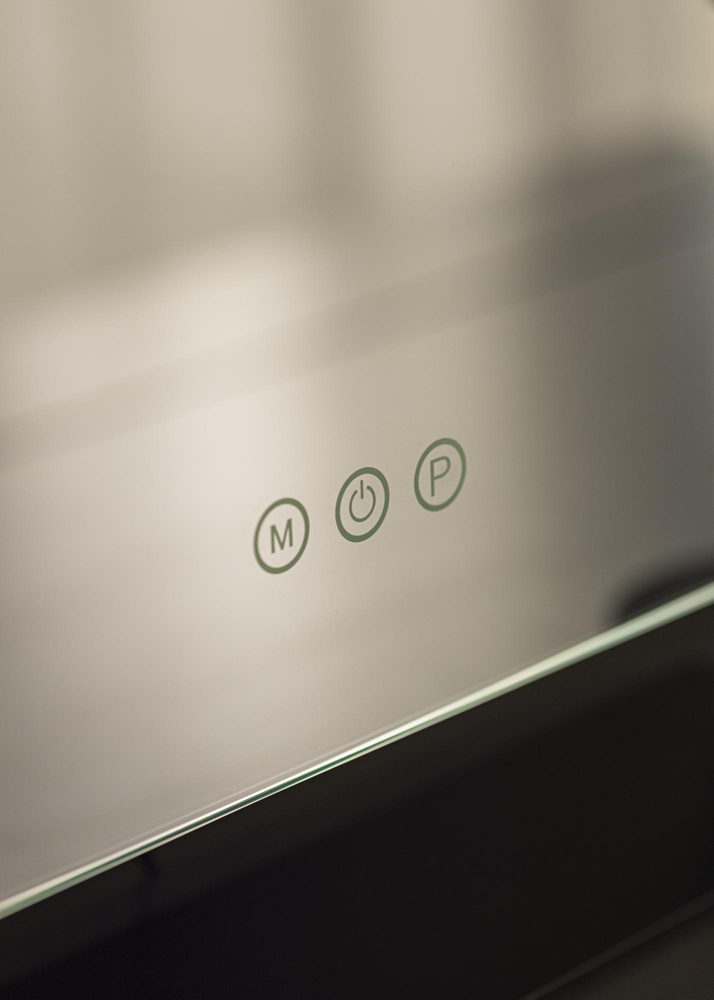 Toto zrkadlo má integrovaný LED pásik, ktorý orámuje zrkadlovú plochu. Môžete stlmiť osvetlenie pomocou dotykového tlačidla označeného "P" a nastaviť farebnú teplotu svetla pomocou dotykového tlačidla označeného "M". Takto môžete meniť nastavenia svetla zrkadla podľa potreby, či už chcete jemné podsvietenie alebo ostrejšie svetlo, ktoré vám pomôže sústrediť sa na obraz v zrkadle. Je tam tiež tlačidlo na zapínanie a vypínanie osvetlenia zrkadla. Elektrické pripojenie sa vykonáva pomocou zástrčky.