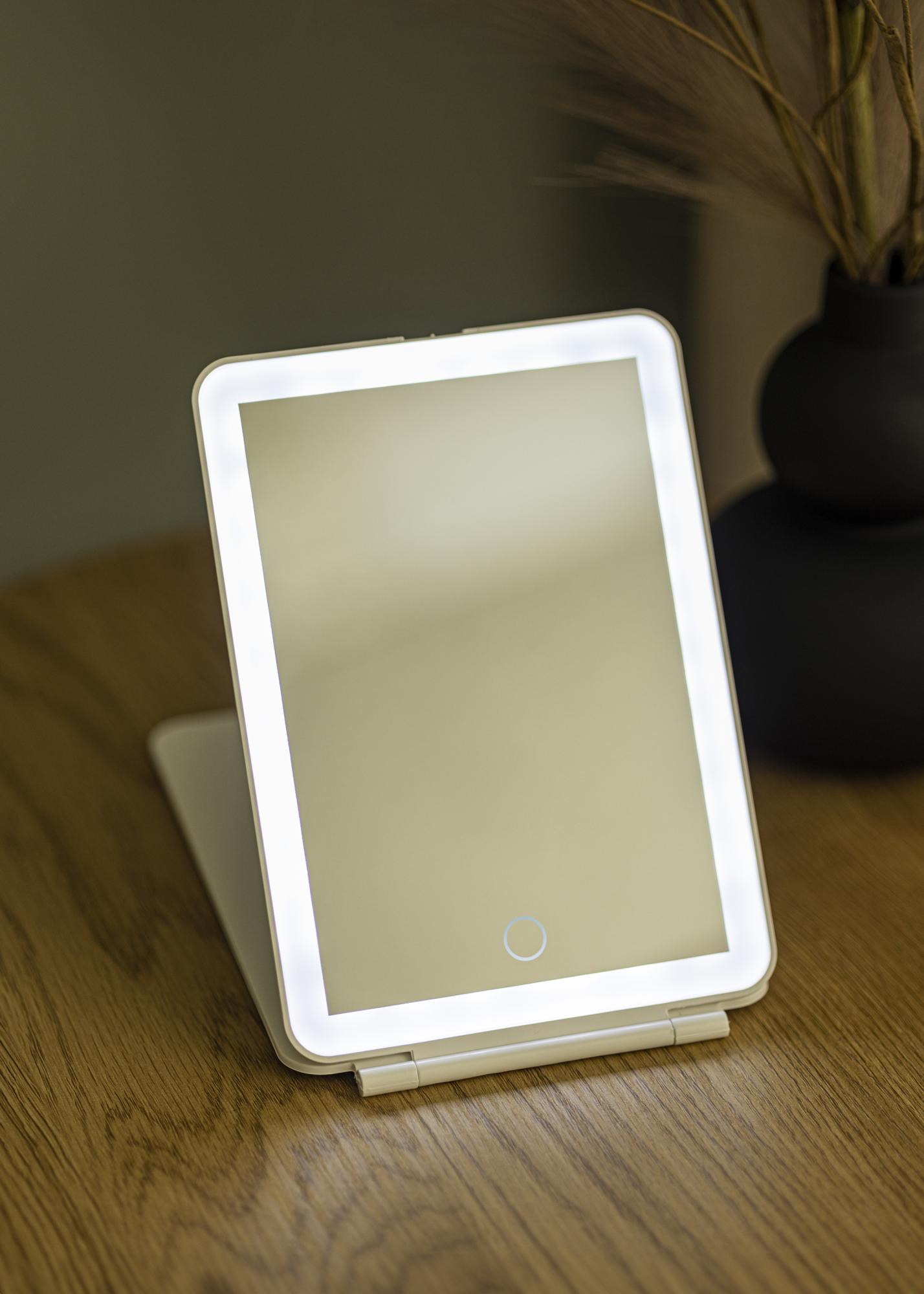 Toto je biele zrkadlo so vstavaným LED osvetlením, ktoré poskytuje príjemné svetlo na vašu tvár. Je napájané batériami a jednoducho sa nabíja cez USB pripojenie, keď sa batérie začínajú vybíjať. Nabíjací kábel je súčasťou balenia. Zrkadlo sa zapína cez dotykové tlačidlo na povrchu zrkadla, pomocou ktorého môžete nastaviť aj osvetlenie. Držaním tlačidla niekoľko sekúnd môžete stmievať svetlo aj nastaviť farebnú teplotu.