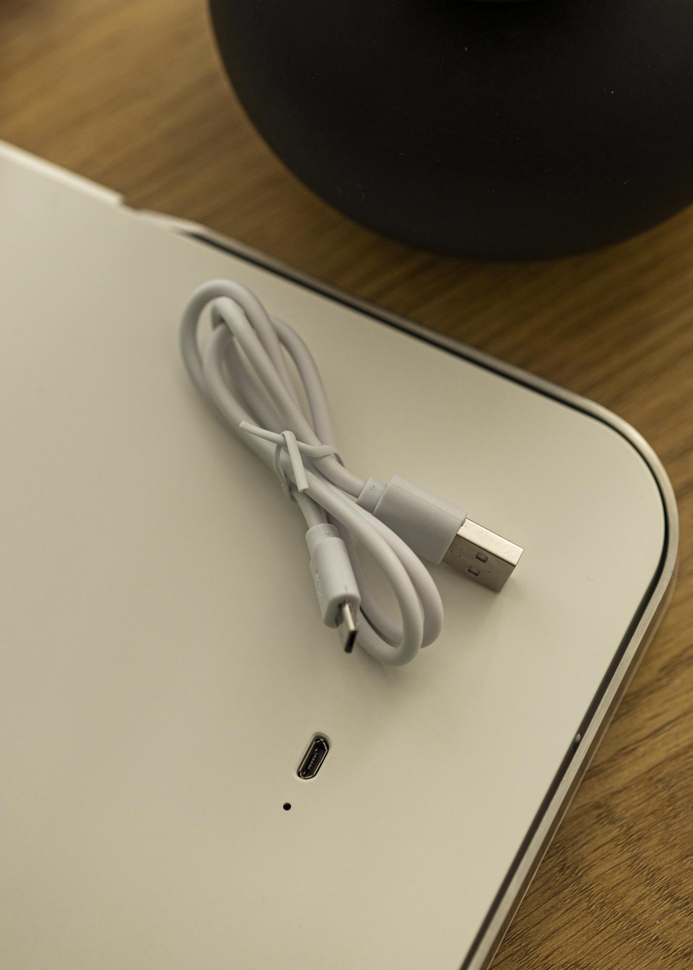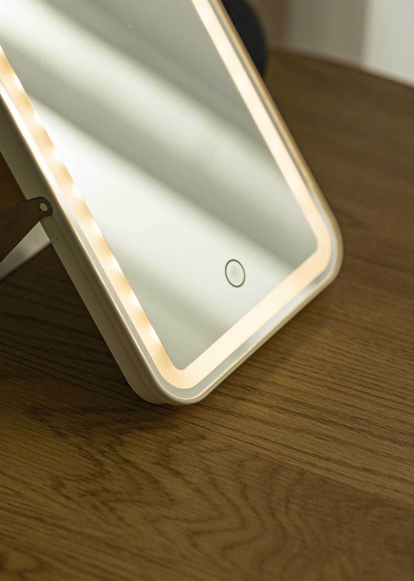 Toto zrkadlo na líčenie má neutrálnu bielu farbu a strieborný stojan, ktorý sa dá rozložiť. Zrkadlo má vstavanú batériu, ktorú môžete nabíjať pomocou USB pripojenia. Kábel na nabíjanie je súčasťou balenia.