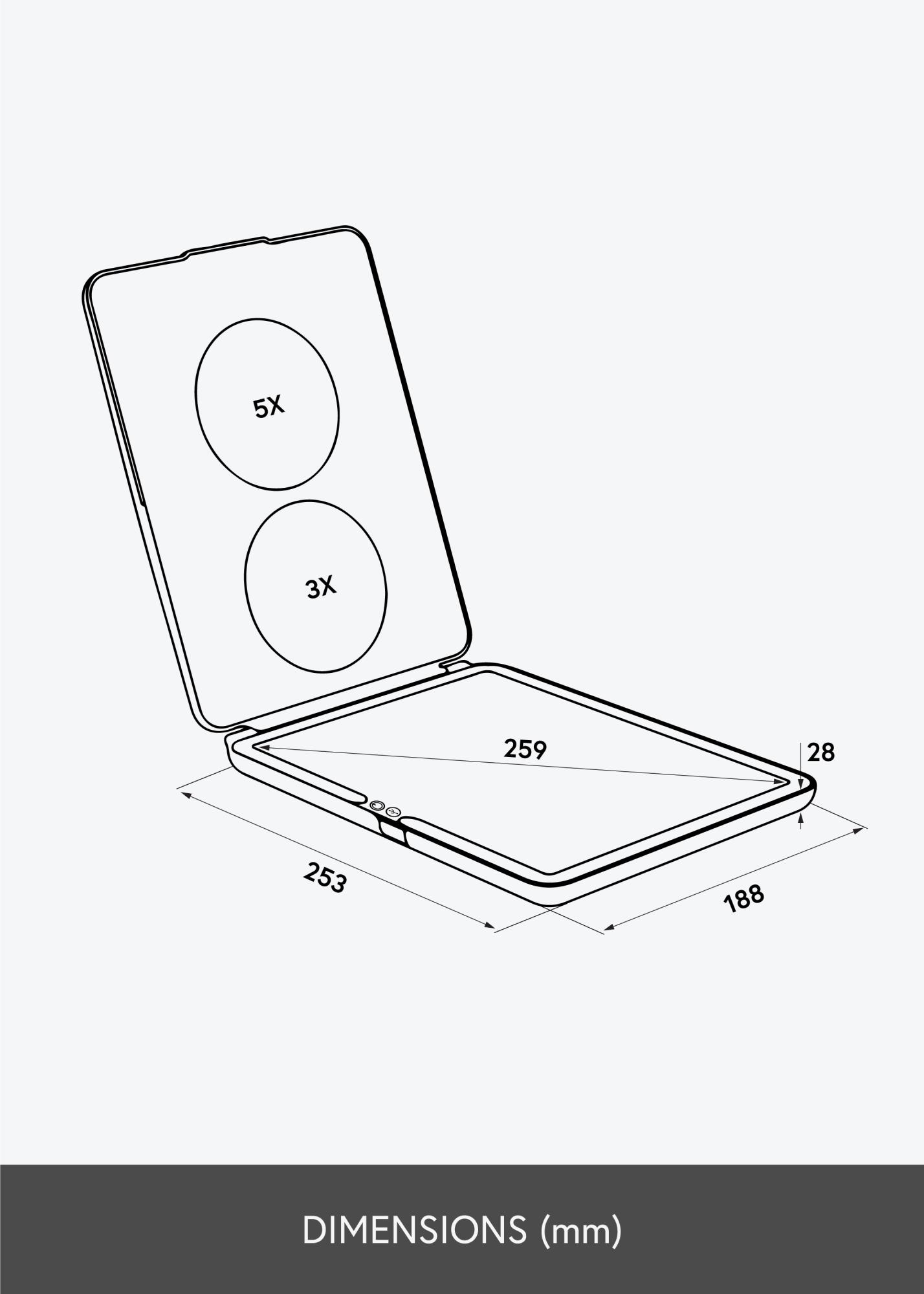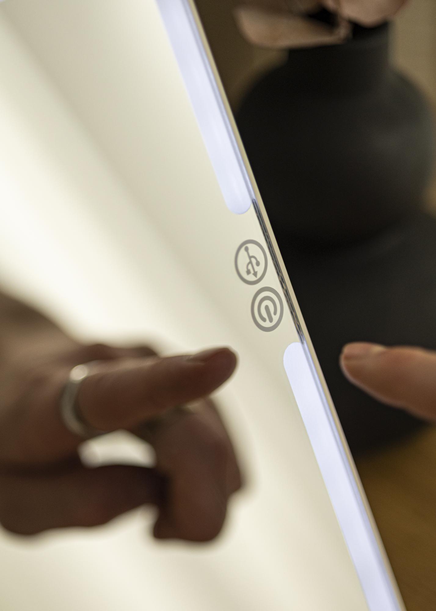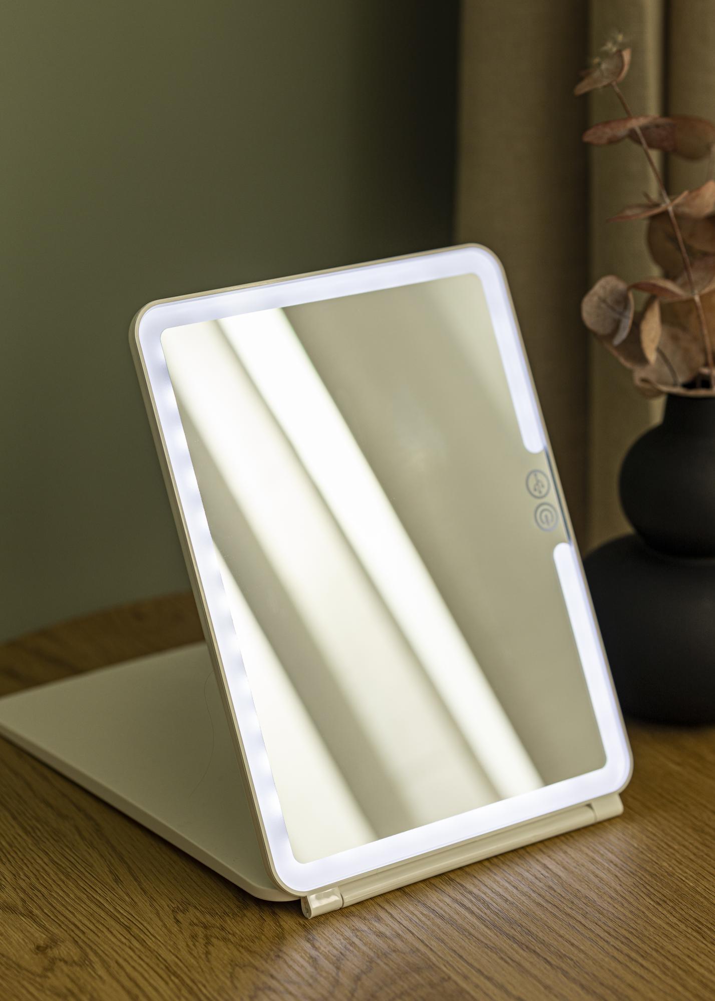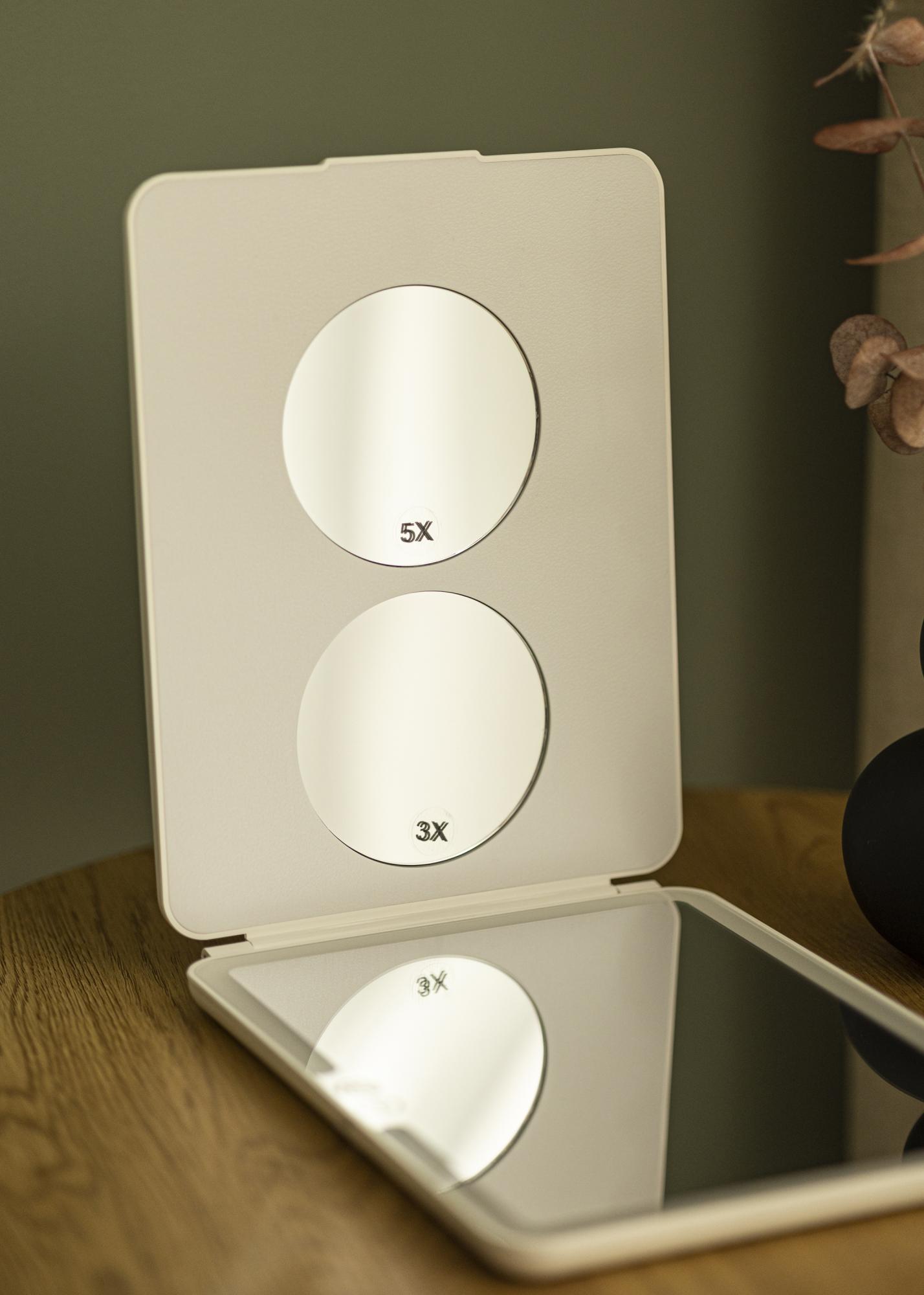Toto je zrkadlo na líčenie v menšom formáte, s inteligentným skladacím dizajnom, ktorý vám umožní jednoducho nastaviť uhol zrkadla pri používaní. Skladací dizajn tiež šetrí miesto a chráni povrch zrkadla, keď je zrkadlo v taške. Je to vynikajúce zrkadlo, ktoré si môžete vziať so sebou na cesty, pretože je kompaktné, ľahké a má zabudované osvetlenie, ktoré poskytuje rovnomerný jas na vašej tvári pri pohľade do zrkadla. Osvetlenie sa zapína a vypína pomocou dotykového tlačidla na ráme zrkadla. Podržaním tlačidla na niekoľko sekúnd môžete tlmiť svetlo a nastaviť farebnú teplotu.