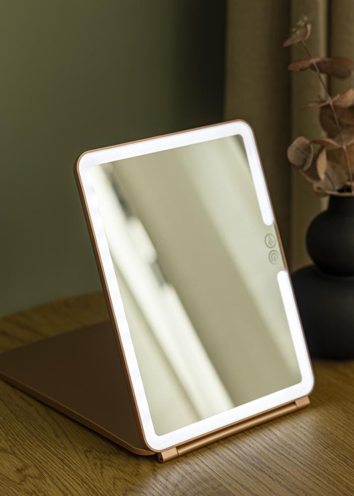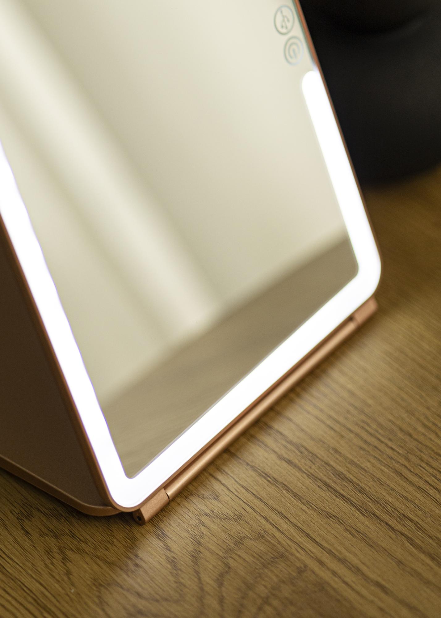 Toto je zrkadlo na líčenie, ktoré je ideálne na používanie, keď ste na cestách, vďaka jeho kompaktnému formátu, skladaciemu dizajnu a zabudovanému LED osvetleniu. Má tiež moderný odtieň v ružovom zlate. Zrkadlo na líčenie sa ľahko zmestí do vašej tašky, či už na dennodenné nosenie alebo na cestovanie. Skladací dizajn chráni povrch zrkadla pred poškriabaním a nečistotami a umožňuje vám nastaviť zrkadlo do požadovanej polohy. Zrkadlo je vybavené bežným zrkadlovým sklom a dvoma menšími zrkadlovými plochami; jedno s 5x priblížením a jedno s 3x priblížením.
