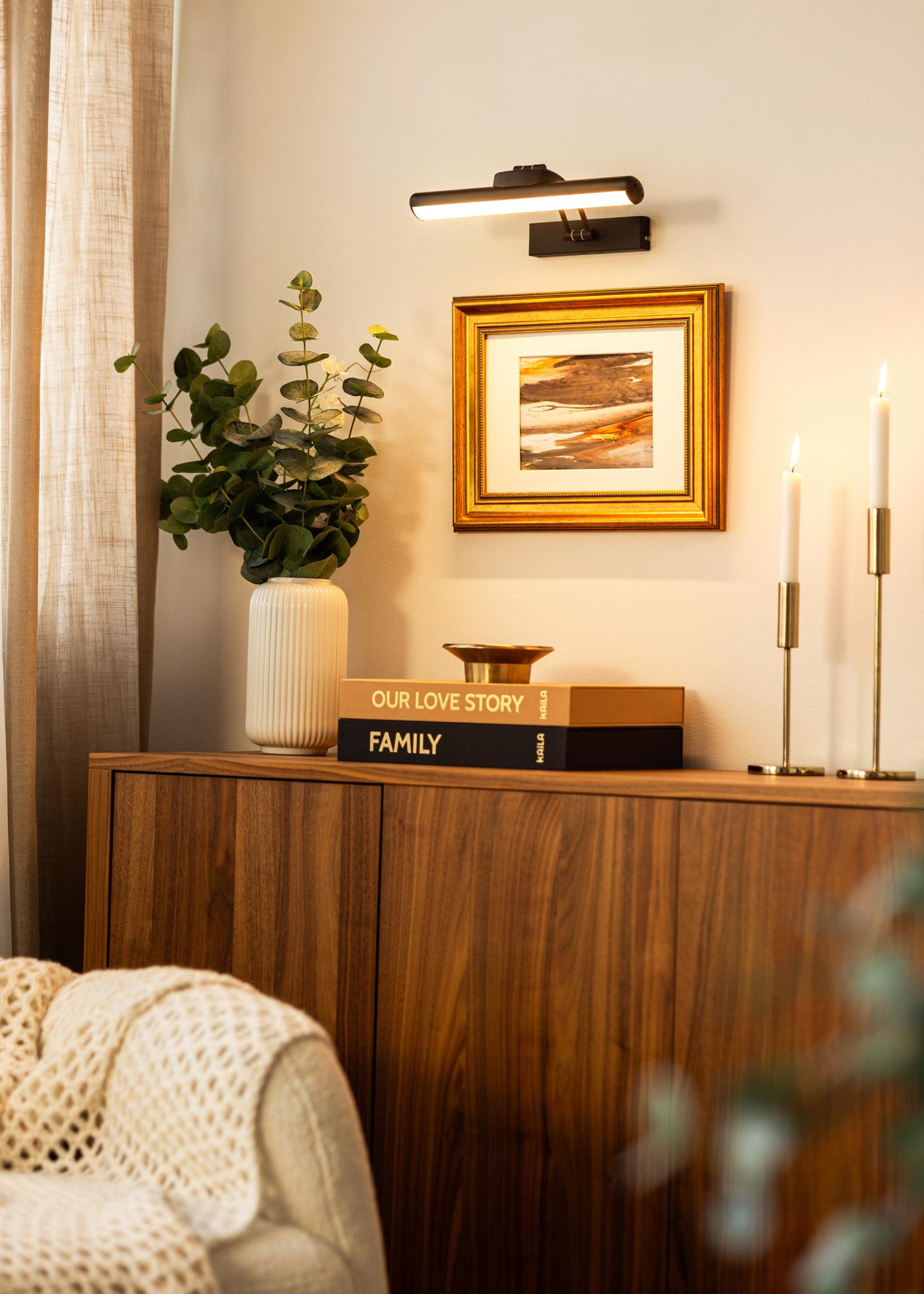 KAILA Luster je elegantné a batériové osvetlenie obrazov v čiernej farbe, ideálne na zvýraznenie vašich obrazov bez rušivých káblov. Vďaka bezdrôtovému dizajnu môžete lampu jednoducho a voľne namontovať bez toho, aby ste museli premýšľať o elektrických zásuvkách. Štýlový čierny povrch dodáva moderný a sofistikovaný vzhľad, zatiaľ čo rovnomerné svetlo vytvára krásne osvetlenie vašich diel. Jednoduché na inštaláciu a pohodlné na používanie – praktické riešenie, ktoré poskytne vašim obrazom pozornosť, ktorú si zaslúžia.