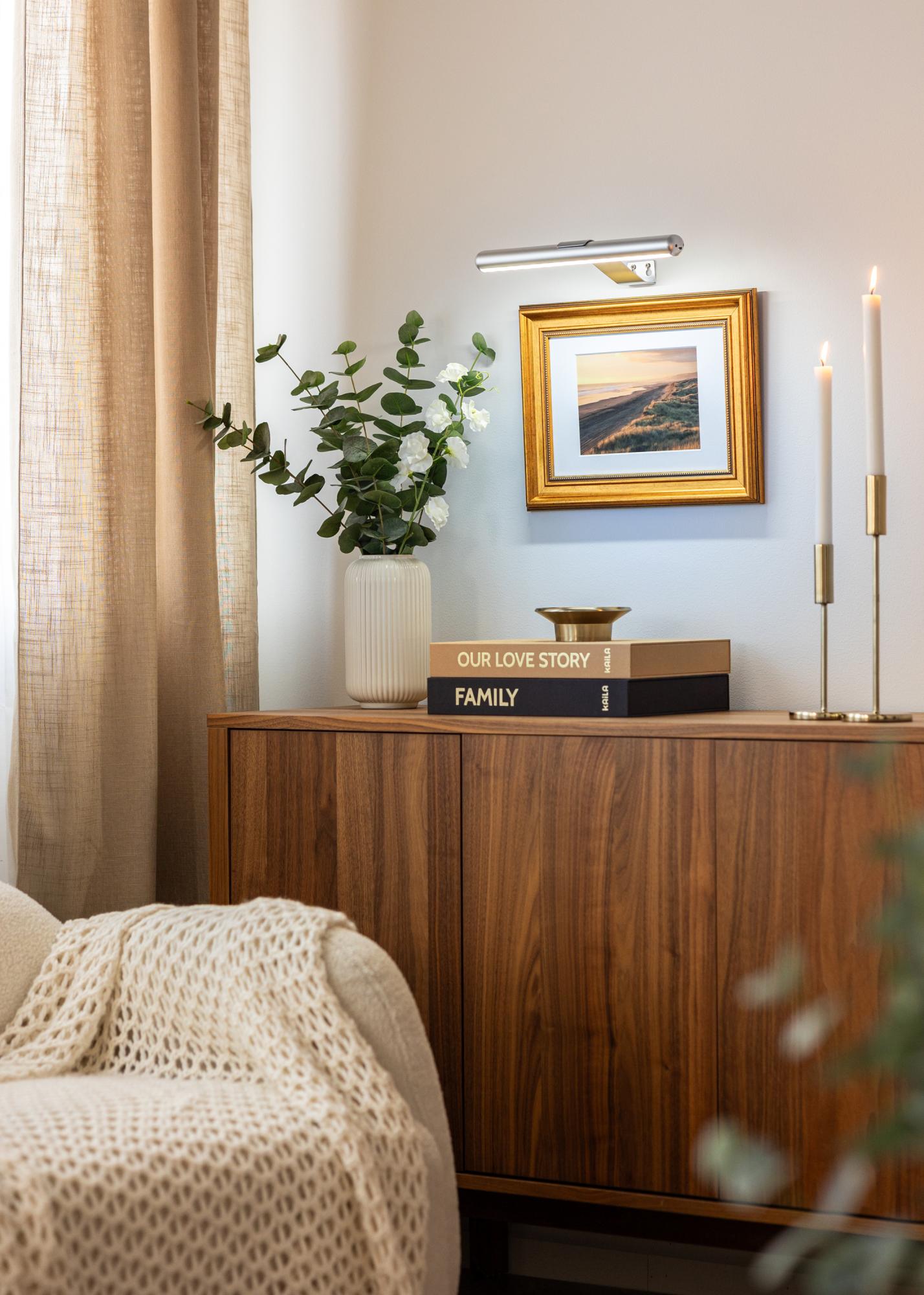 S elegantnou striebornou úpravou a minimalistickým dizajnom toto osvetlenie na obrazy zapadne do rôznych typov interiérov a zvýrazní vzhľad vašich umeleckých diel. Je jednoduché na inštaláciu a montážne skrutky sú zahrnuté, čo robí inštaláciu pohodlnou a rýchlou. Je to vynikajúce riešenie pre tých, ktorí chcú flexibilné a praktické osvetlenie pre svoje umelecké diela.