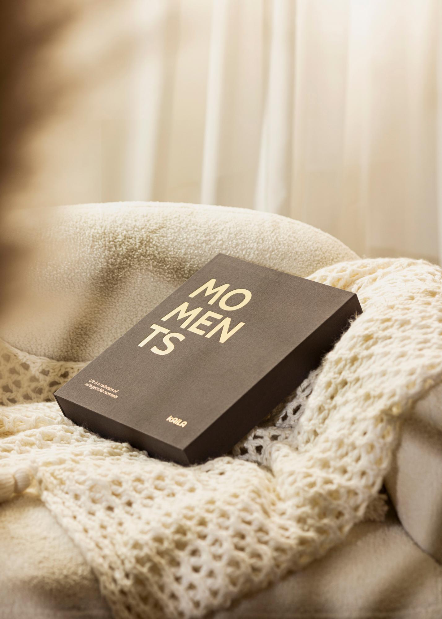 Fotoalbum je navrhnutý ako krabica, ktorú môžete otvoriť na prístup k vašim obrázkom. Obal je zdobený čiernym textilom, čo mu dodáva luxusný pocit. Na prednej strane a krátkej strane je text „MOMENTS“. V ľavom rohu na vrchnej strane je vidieť nádherný podtitul „Life is a collection of unforgettable moments“.