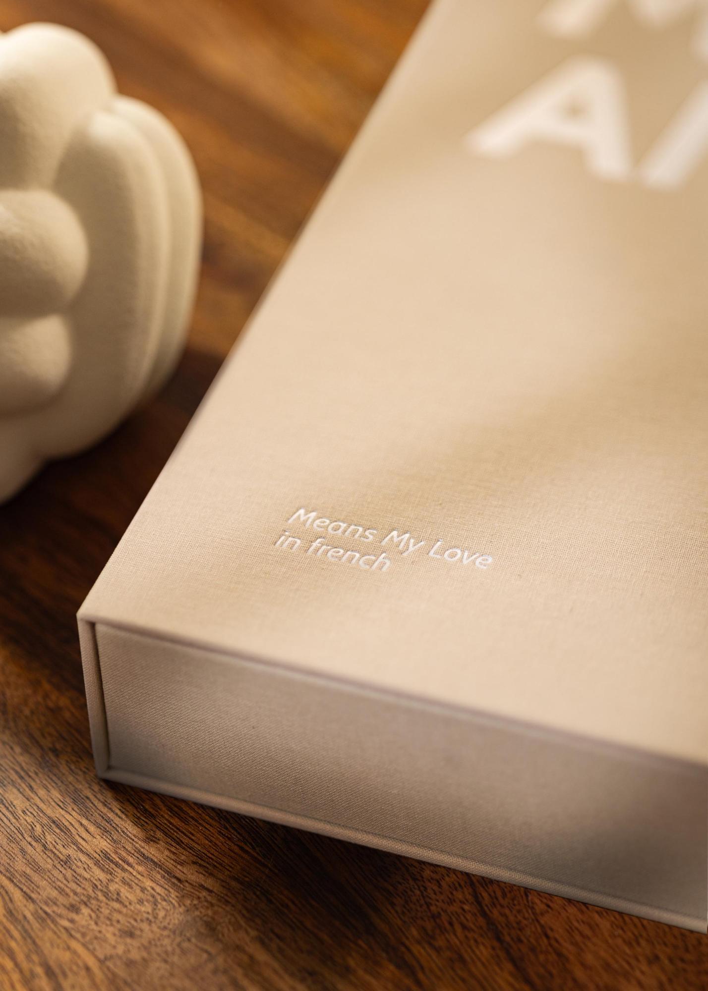 Chcete moderný fotoalbum, ktorý funguje ako luxusný prvok vo vašej domácej dekorácii? Potom je tento Coffee Table Album pre vás! Album je navrhnutý ako malá škatuľka s exkluzívnym béžovým textilným obalom. Názov albumu ”MON AMOUR” dodáva romantický dotyk inak minimalistickému vyjadreniu. Podnadpis v ľavom rohu albumu znie ”Means My Love in French”.