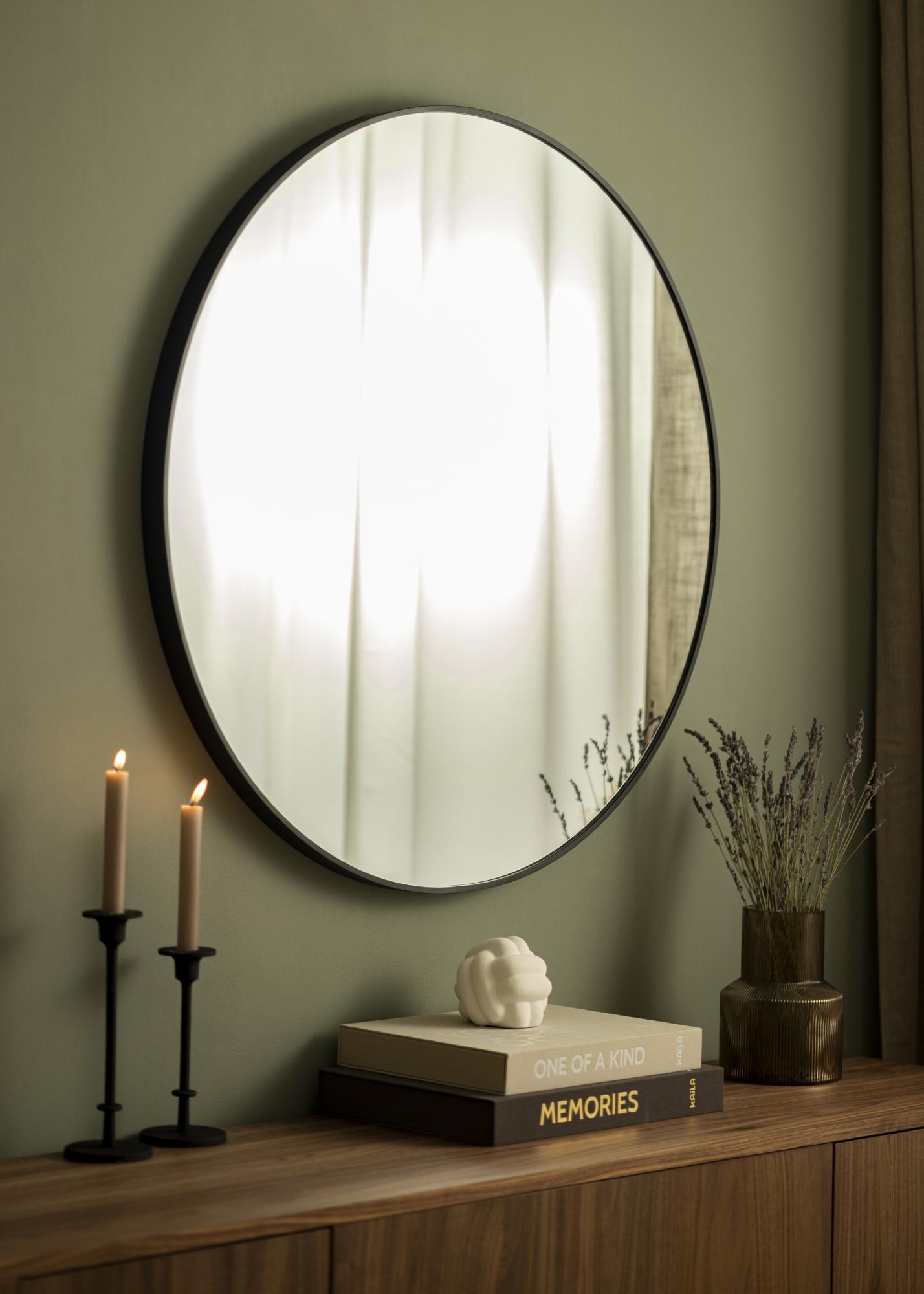 KAILA Round Mirror Edge Black je okrúhle zrkadlo s elegantným tenkým kovovým rámom sfarbeným na matnú čiernu, čo mu dodáva priemyselný a trendový vzhľad. Rám má – v závislosti od veľkosti – hĺbku medzi 30-40 mm, čo spôsobuje, že zrkadlové sklo vychádza kúsok zo steny a vytvára úžasný 3D efekt. Hĺbka rámu tiež zaručuje, že zrkadlo pôsobí solídne, a zároveň si zachováva svoj minimalistický vzhľad. Perfektné okrúhle zrkadlo na umiestnenie v akejkoľvek miestnosti, kde chcete pridať funkciu a elegantný švédsky dizajn!