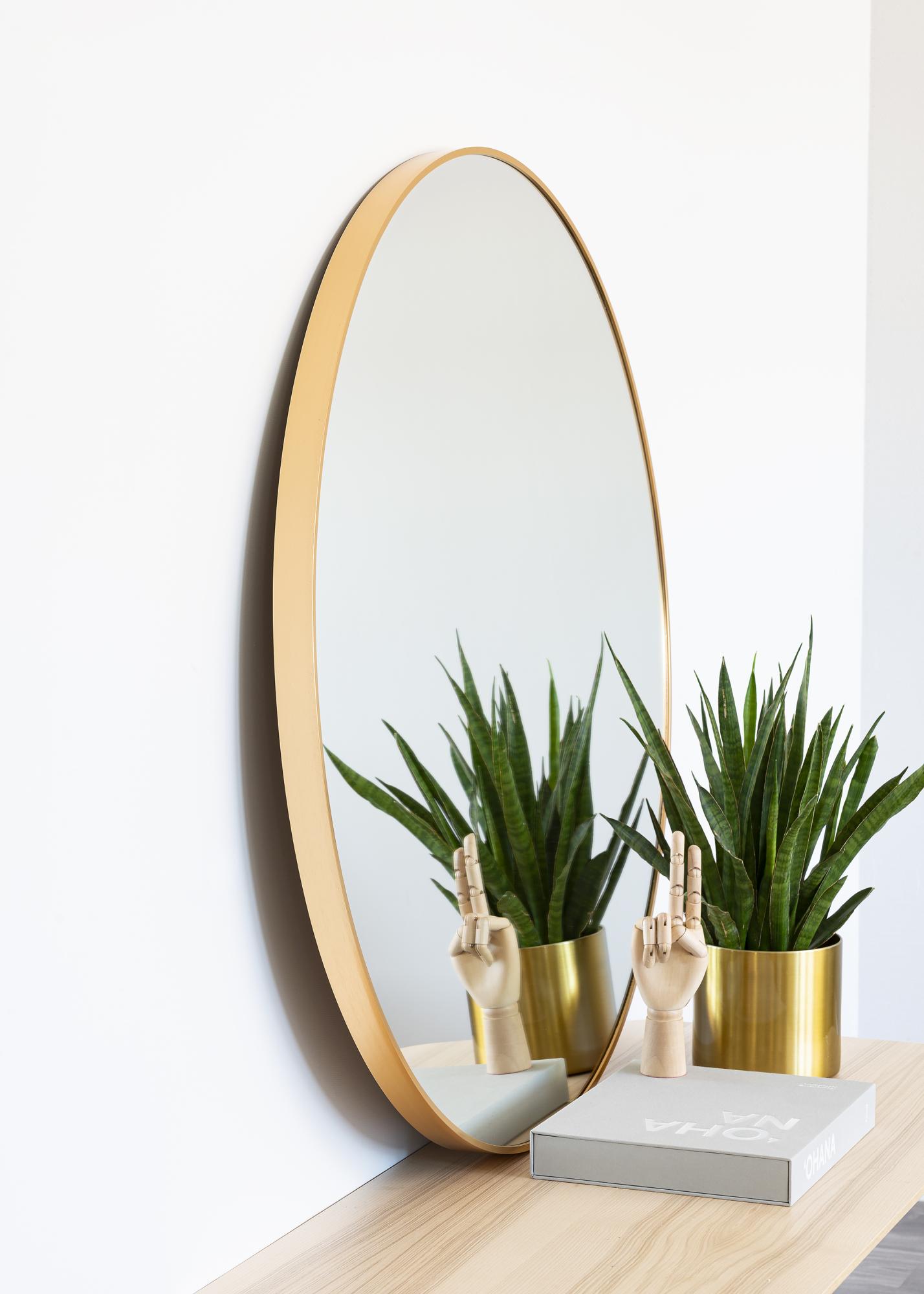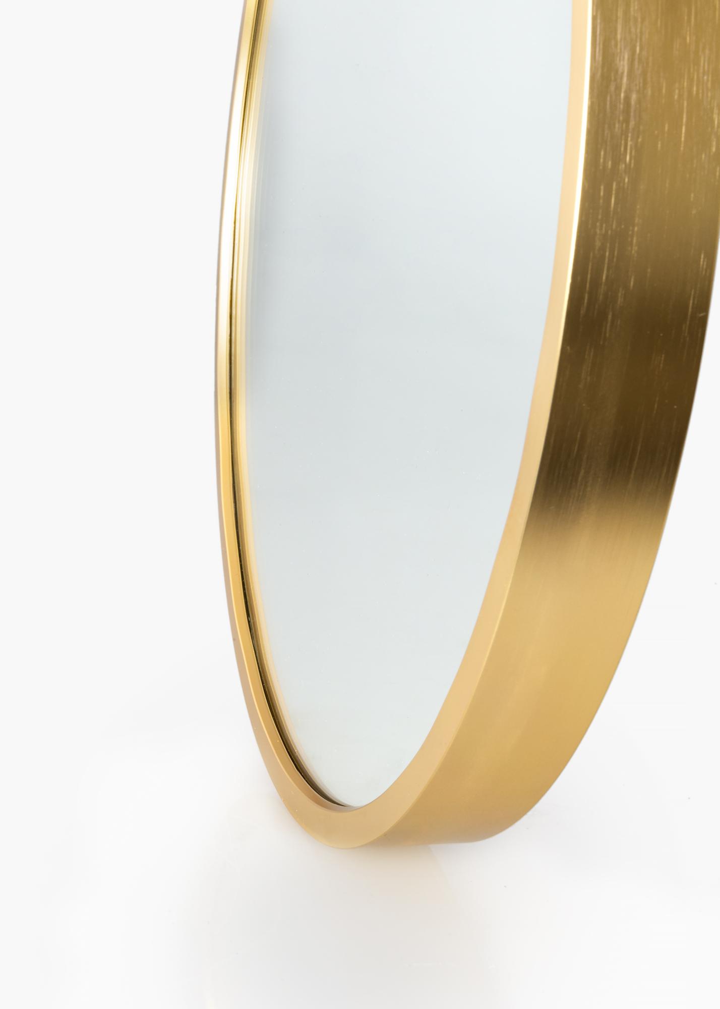 Okrúhle zrkadlo v elegantnom švédskom dizajne s kovovým rámom v krásnom zlatom prevedení. Rám má kartáčovaný povrch, ktorý krásnej zlatistej farbe dodáva trochu matnejší vzhľad. Rám je tiež trendovo tenký, ale má zároveň – v závislosti od veľkosti – hĺbku medzi 30-40 mm, čo spôsobuje, že vyčnieva kúsok zo steny a vytvára fascinujúci 3D efekt. Hĺbka rámu navyše zabezpečuje, že zrkadlo pôsobí solídne a robustne, bez toho, aby to poškodilo minimalistický pocit zo zrkadla.