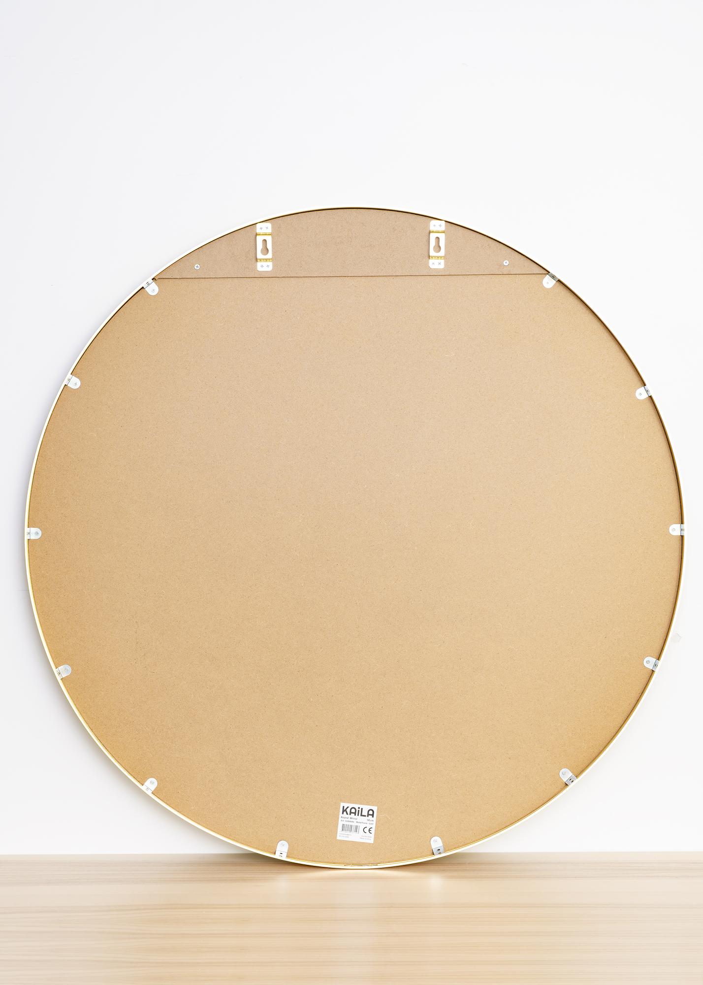 KAILA Round Mirror Edge Gold je k dispozícii v niekoľkých rôznych veľkostiach a toto zrkadlo má priemer 100 cm. Zadná strana zrkadla je vybavená dvoma nástennými držiakmi pre jednoduché a stabilné zavesenie na stenu a priložené sú vhodné skrutky a hmoždinky.