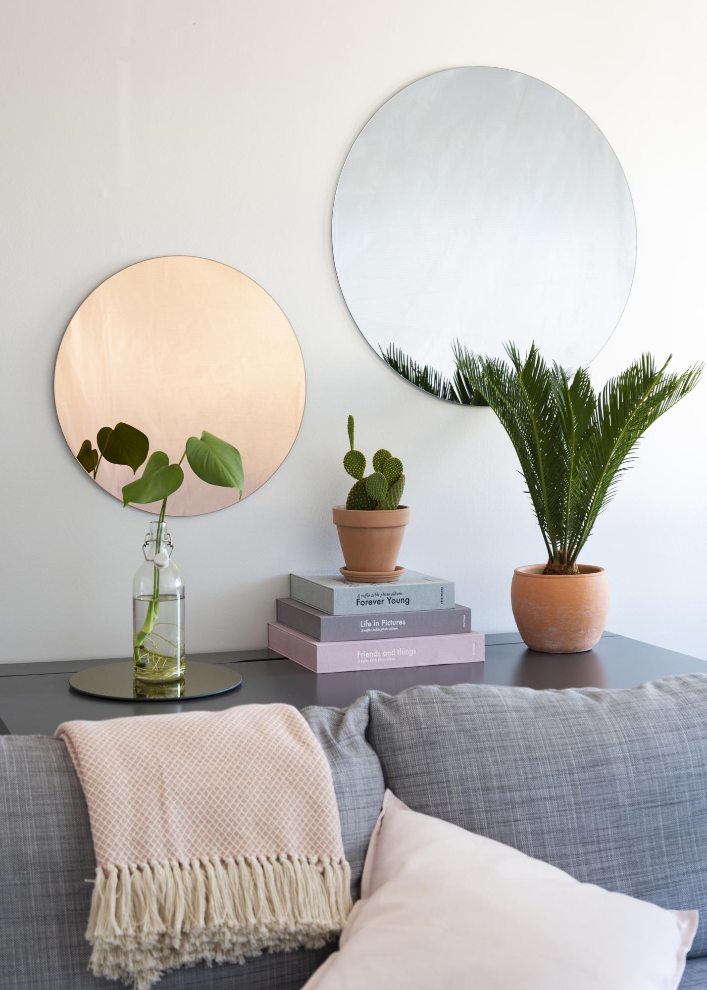 KAILA Okrúhle Zrkadlo Rose Gold je dostupné v rôznych veľkostiach. Táto varianta má veľkorysú veľkosť 110 cm Ø.