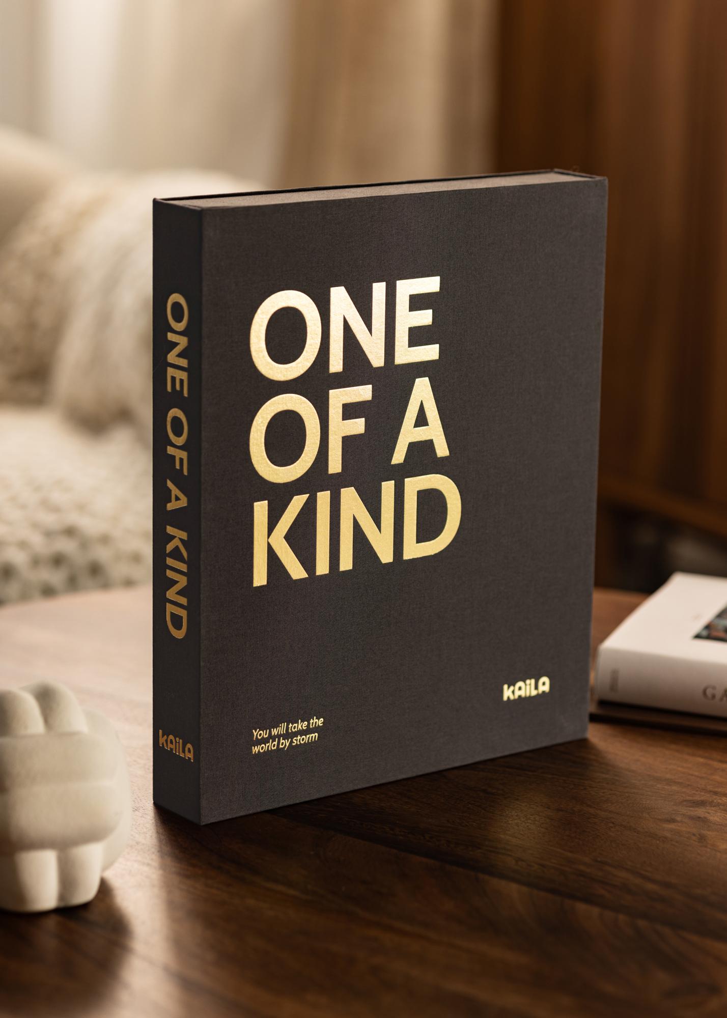 Vyvolajte svoje obrázky a uložte ich do pekného Coffee Table Fotoalbumu! Tento fotoalbum od KAILA je potiahnutý čiernou textíliou a je navrhnutý ako luxusná krabica, čo mu skutočne dodáva exkluzívny pocit. Najlepšie je, že tento fotoalbum je rovnako pekný ako interiérový detail! Na prednej strane fotoalbumu je vytlačený titul ”ONE OF A KIND” veľkými bielymi písmenami a podtitul ”You will take the world by storm”, čo robí tento album perfektným pre krásne obrázky z detstva alebo na darovanie niekomu špeciálnemu, alebo samozrejme pre vaše vlastné nádherné fotospomienky.
