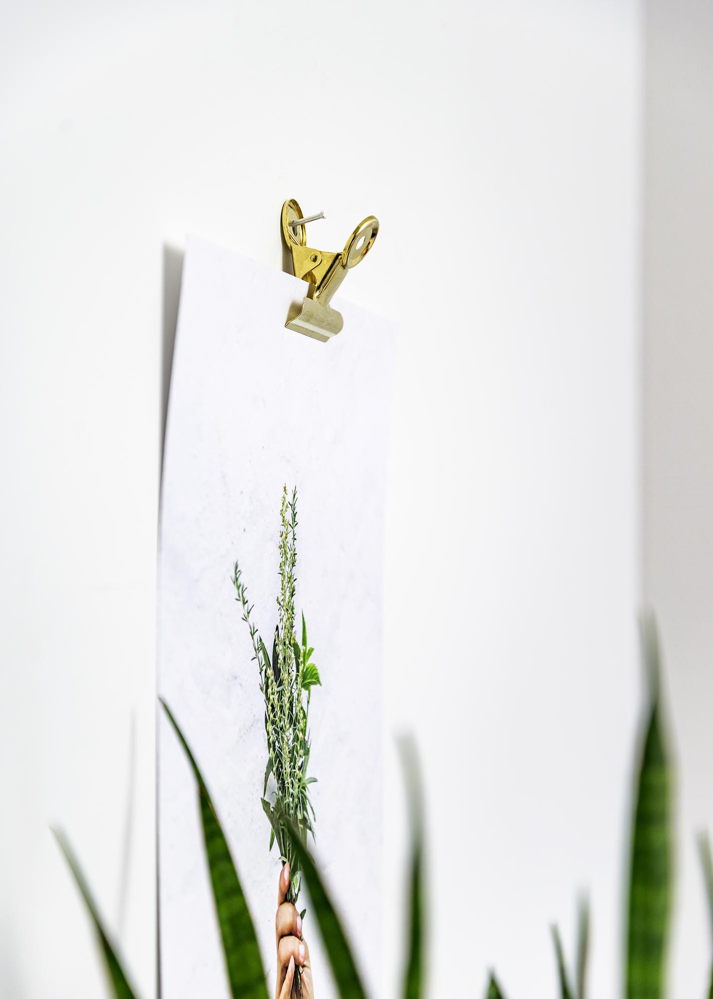 Kovová spona v elegantnom a lesklom zlatom prevedení, ktorá dodáva vašim plagátom a obrázkom trendové a minimalistické zavesenie. Dizajn spony na plagáty je čistý a otvory v okrúhlom vrchu spony umožňujú jej jednoduché upevnenie na stenu na malý klinec alebo skrutku. Otváranie spony má pevný úchop, ktorý umožňuje zavesenie aj toho najtenšieho papiera, pričom je zároveň flexibilné a umožňuje montáž motívov s rôznou hrúbkou. Ak máte veľký plagát, ktorý chcete zavesiť, použite dve kovové spony na dosiahnutie najlepšieho výsledku.